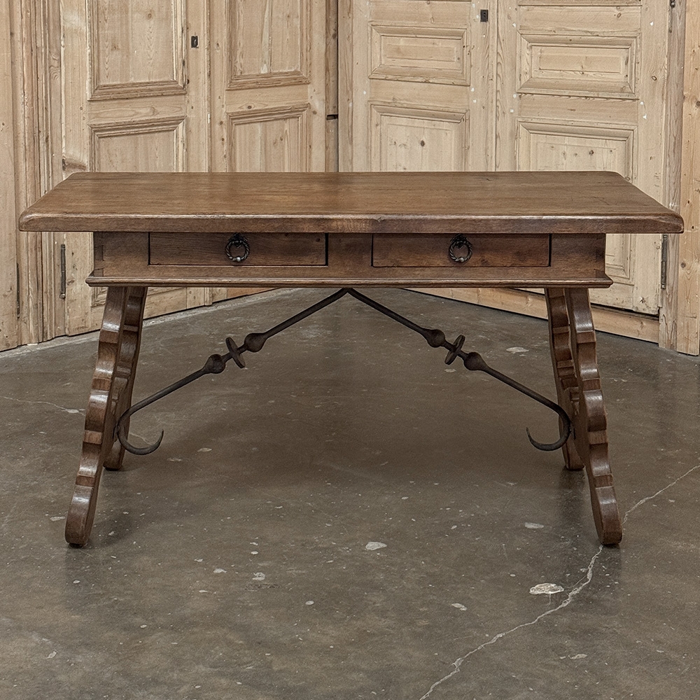 Vintage Spanish Style Two-Drawer Writing Table with Hand-Forged Iron Supports