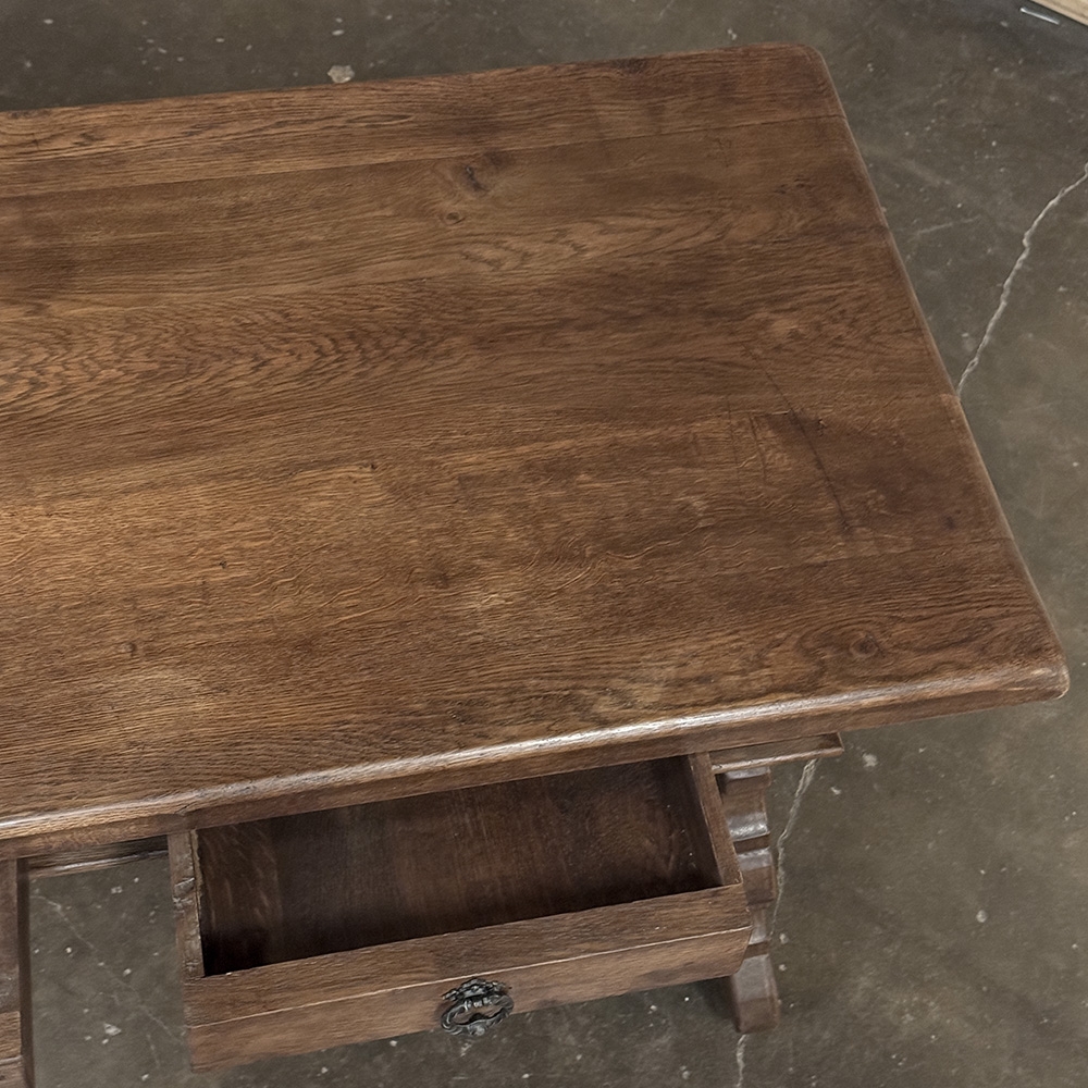 The broad rectangular top provides ample working surface, making it well suited as a writing table, library desk, or substantial occasional table. It's even a great choice as a sofa table or console! Two drawers offer convenient storage for correspondence, documents, or everyday essentials, each fitted with simple ring pulls that complement the rustic character.