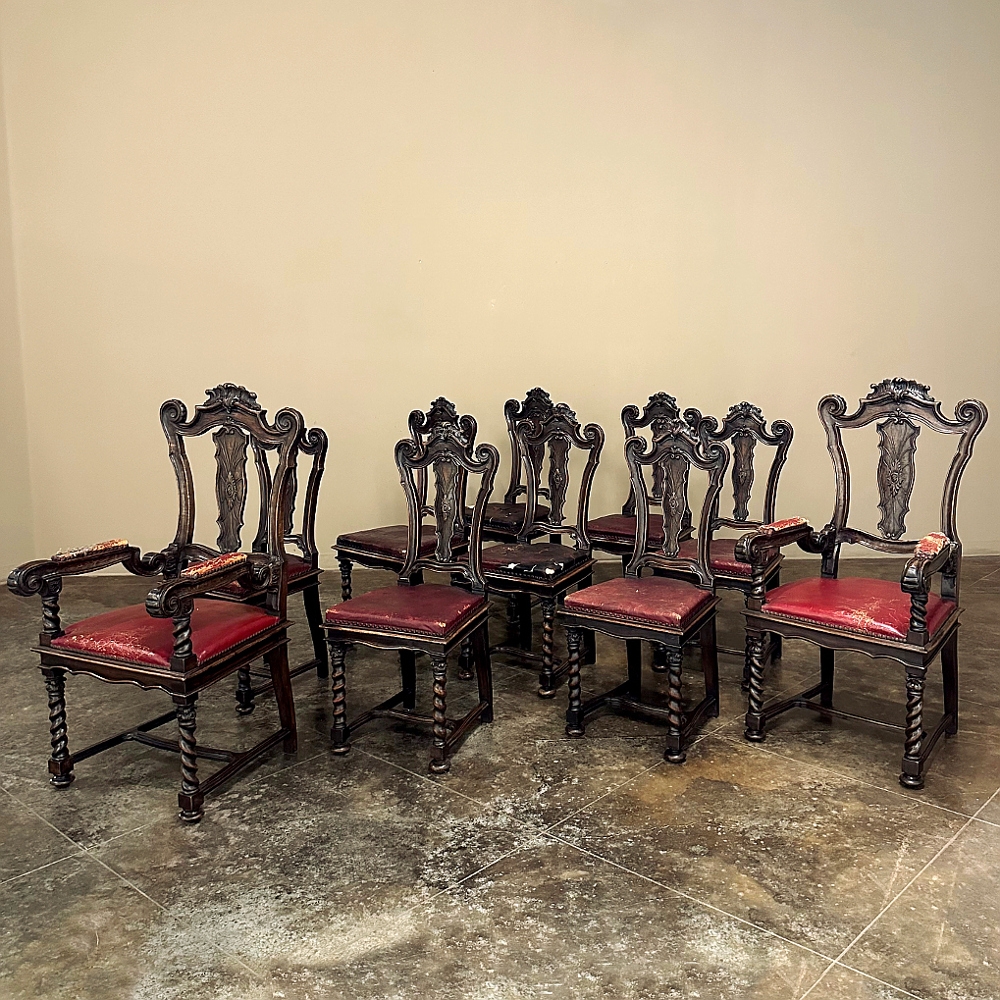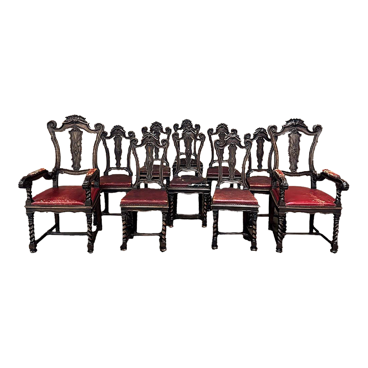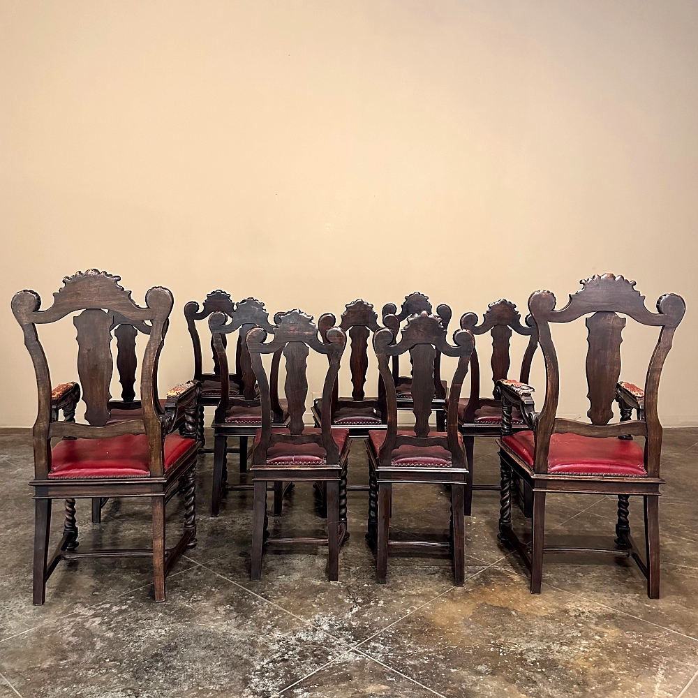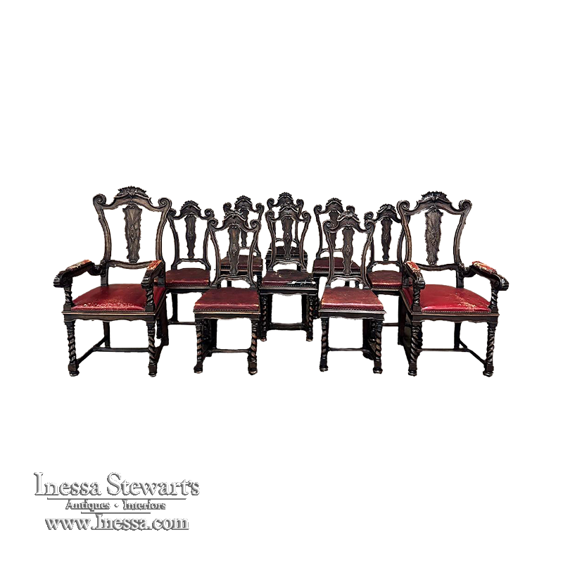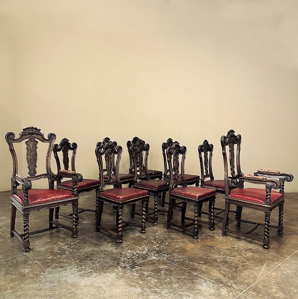 Set of 10 Antique Italian Walnut Baroque Dining Chairs includes 2 Armchairs