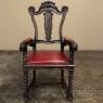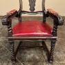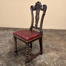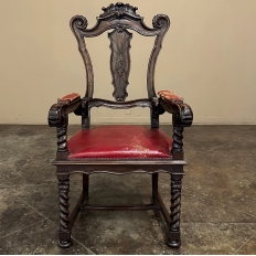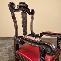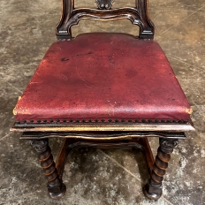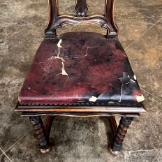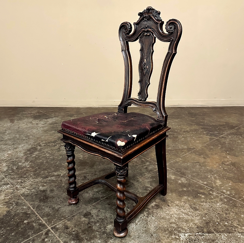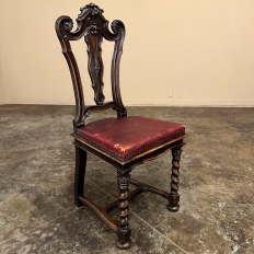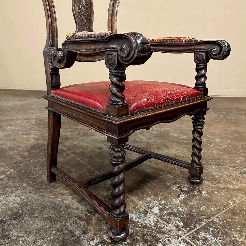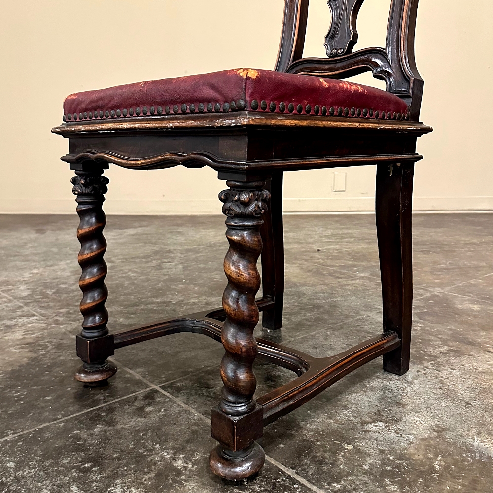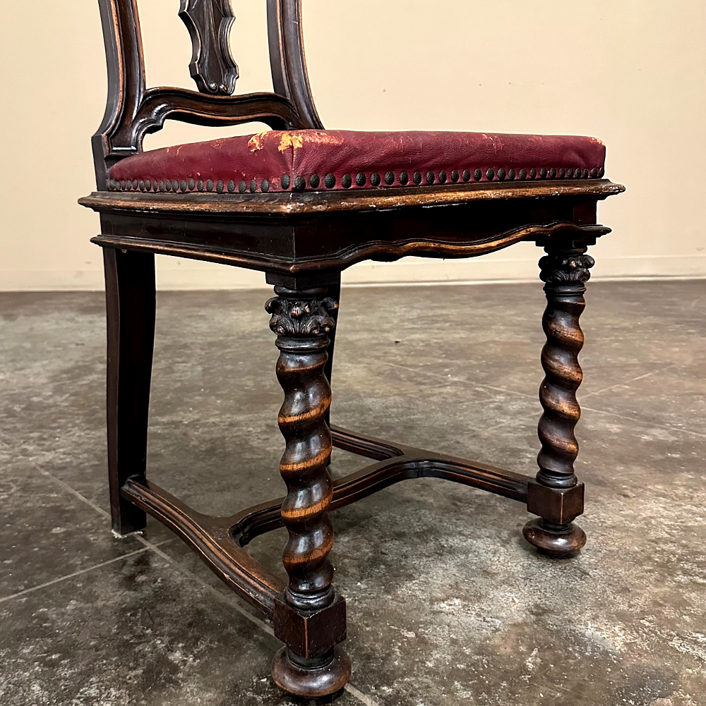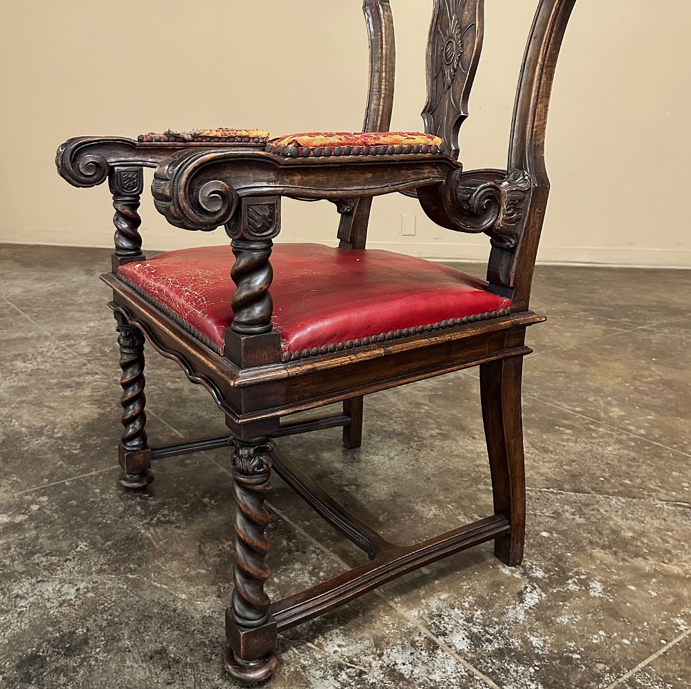 Set of 10 Antique Italian Walnut Baroque Dining Chairs includes 2 Armchairs is a wonderful find perfect for larger families or those who love to entertain in style! Sculpted from solid walnut, each features a shield form design for the back, topped with cresting waves and bold scrollwork on the uprights. A complex contoured back splat with diamond shaped rosette provides a focal center point. The elegantly contoured armrests are padded, and embellished with carved scrolls on the ends, while being supported by barley twist columns. The columns continue below the seat spiraled in the opposite direction and topped with Corinthian-inspired capitals. All four legs are connected at the finely molded seat as well as via an "H" stretcher below for long-lasting strength. Bun feet complete the look. The 8 side chairs are smaller versions of the armchairs, without arms of course. The original upholstery has exceeded its useful life and needs to be replaced in your coordinating material.