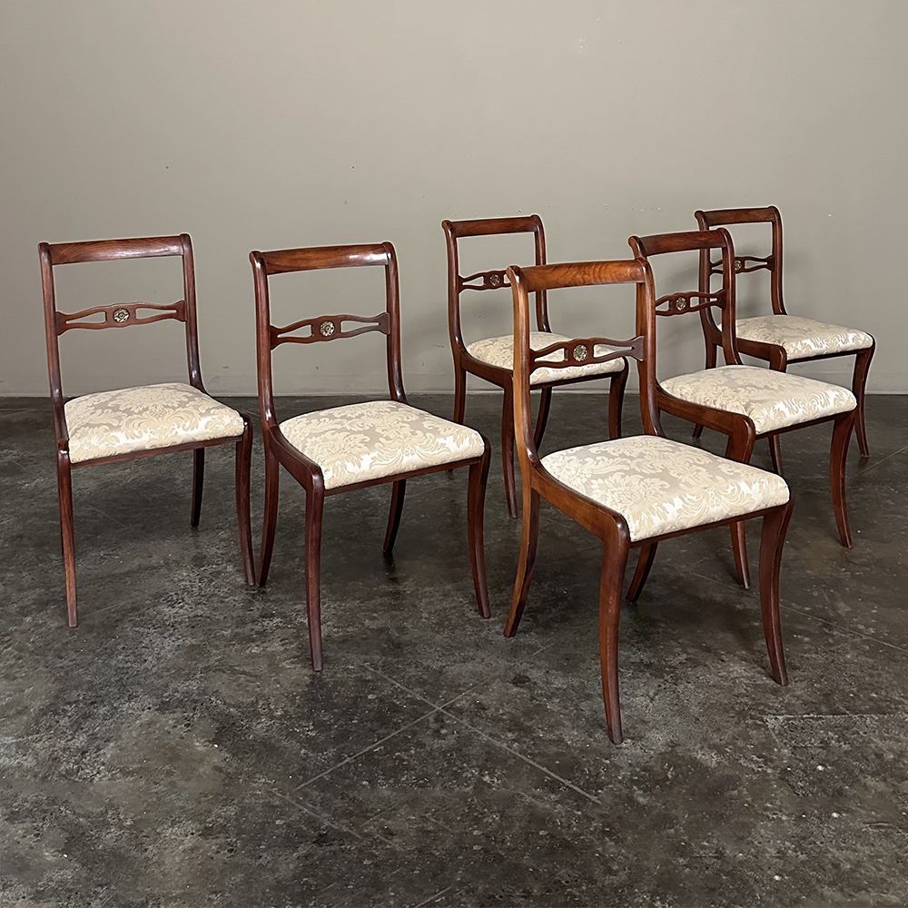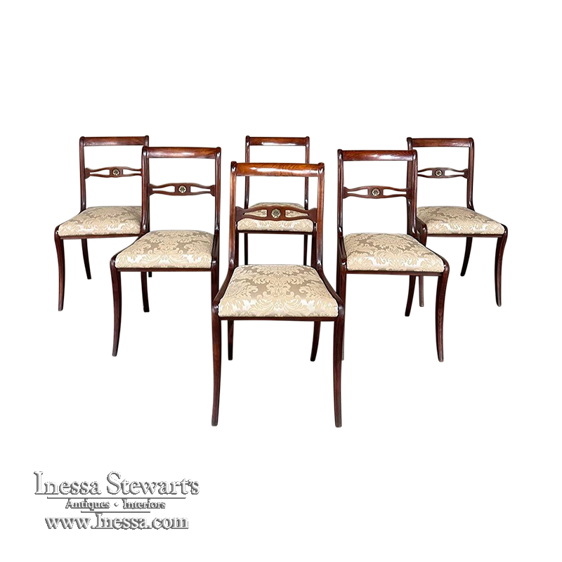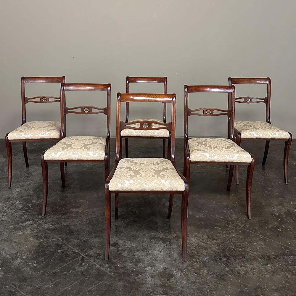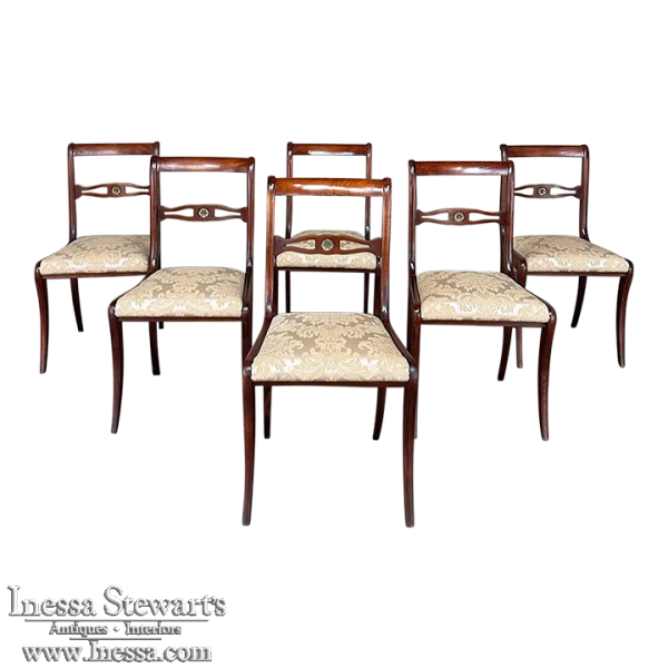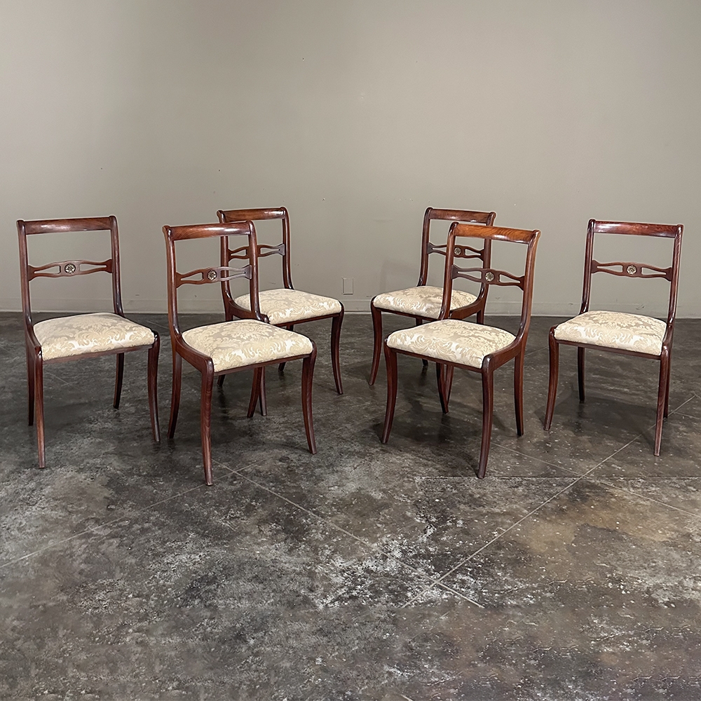 SaleSet of 6 Antique French Empire Revival Mahogany Dining Chairs represent a tailored expression of the style, featuring gracefully curved legs designed for visual appeal as well as adding stability to the design. Seat backs are straightforward but deceptively comfortable, with a rounded top cross piece, and a single horizontal splat pierce-carved to resemble two lyre forms, centered with a bronze medallion rosette. Seats are a good height, and upholstered recently in a fine damascene fabric in a subdued gold and beige tone that will prove very adaptable. The richness of the exotic imported wood cannot be denied, as well!