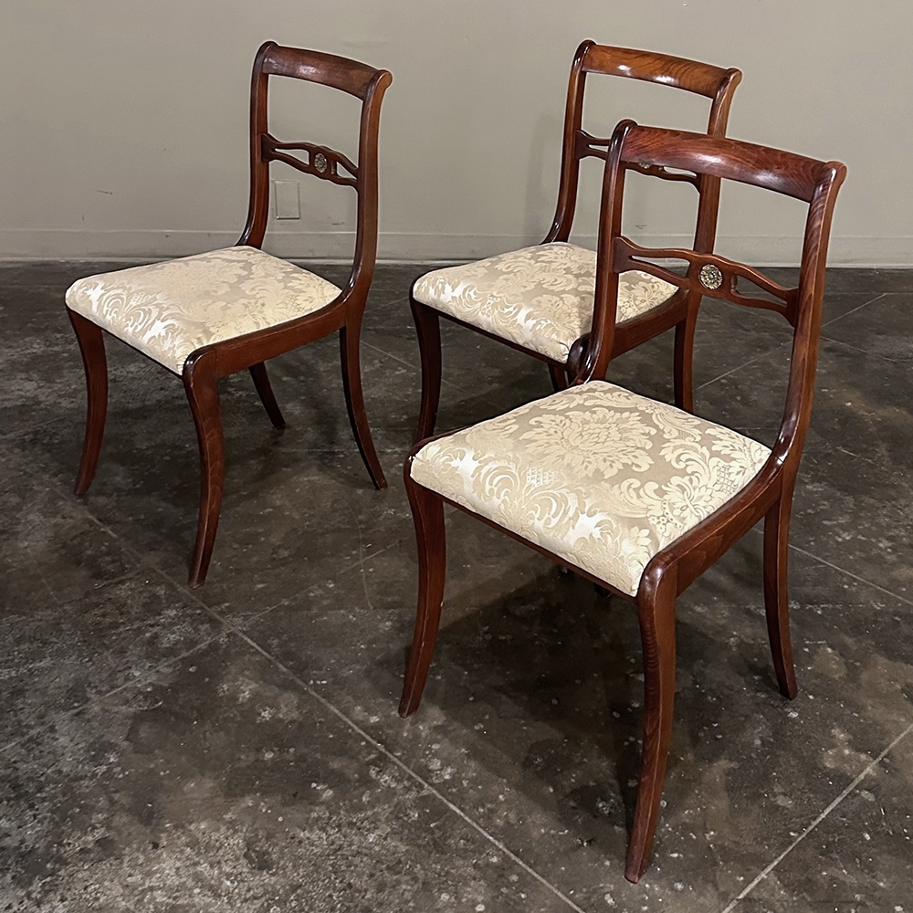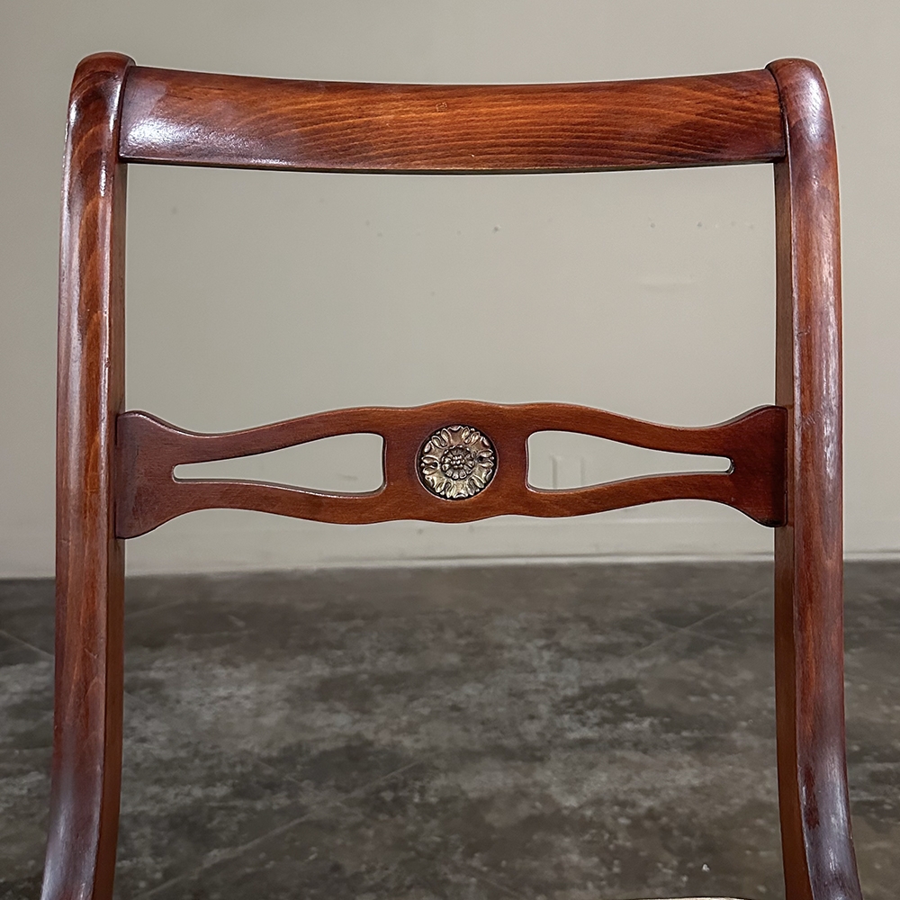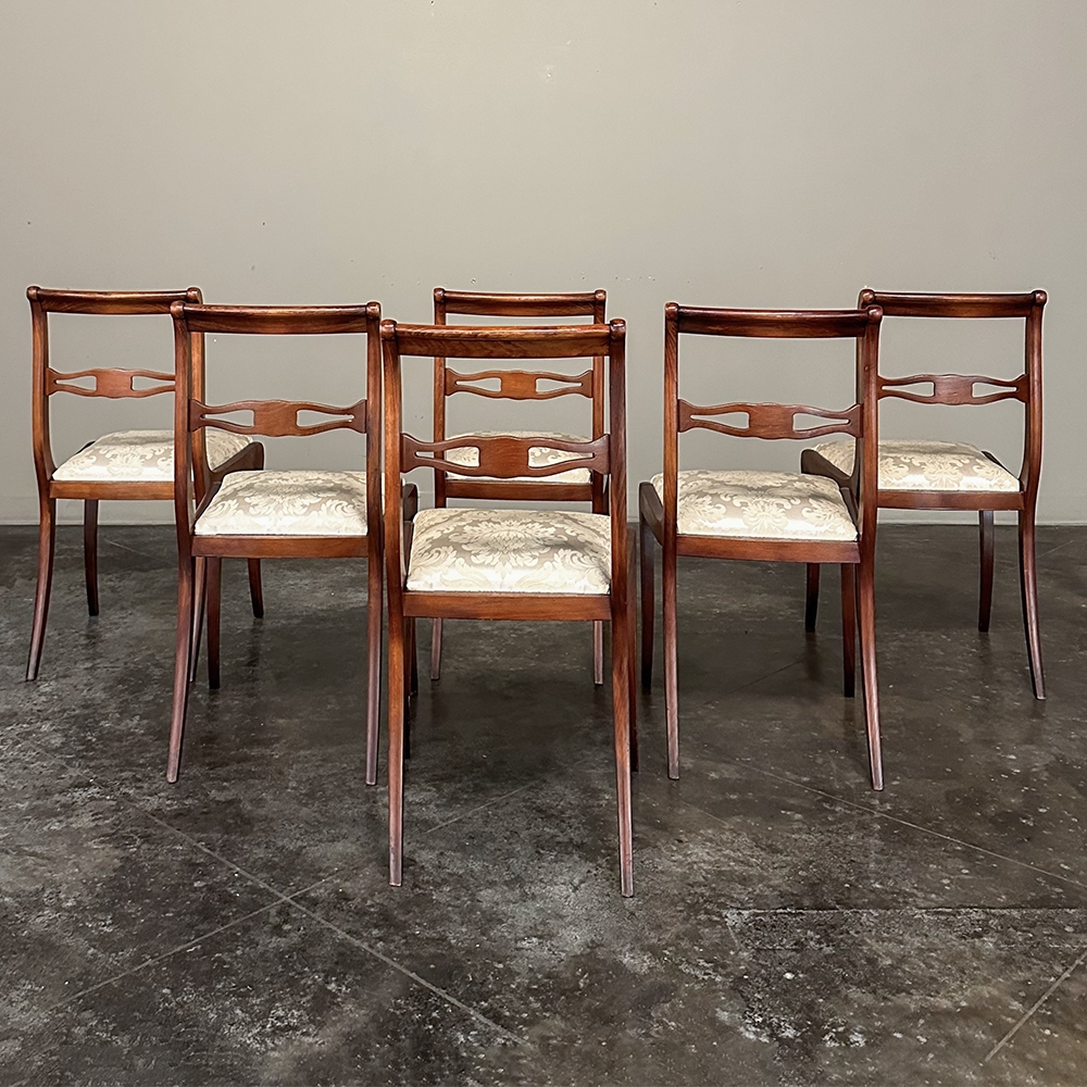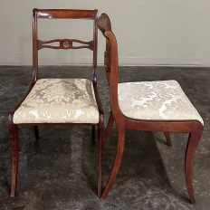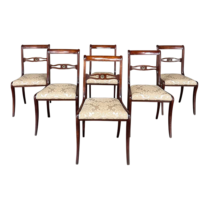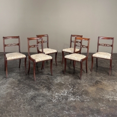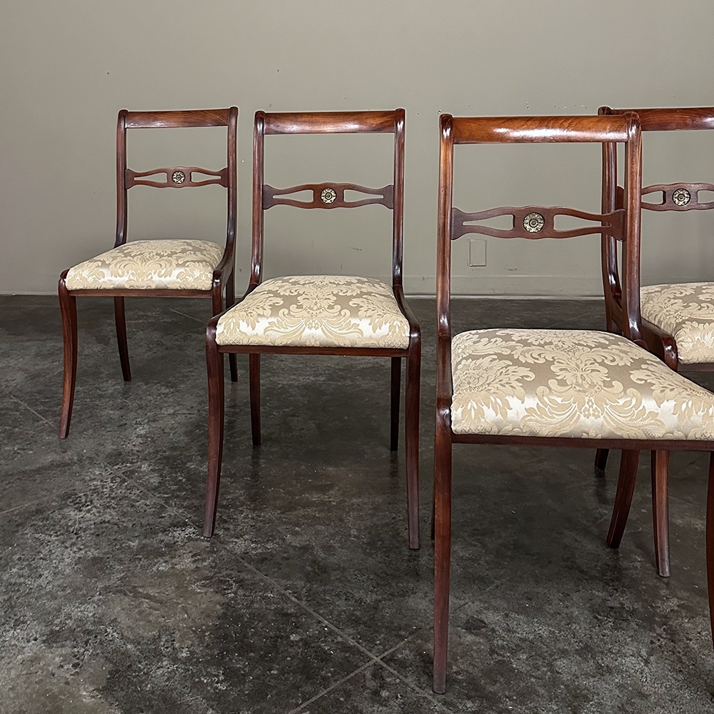 SaleSet of 6 Antique French Empire Revival Mahogany Dining Chairs represent a tailored expression of the style, featuring gracefully curved legs designed for visual appeal as well as adding stability to the design. Seat backs are straightforward but deceptively comfortable, with a rounded top cross piece, and a single horizontal splat pierce-carved to resemble two lyre forms, centered with a bronze medallion rosette. Seats are a good height, and upholstered recently in a fine damascene fabric in a subdued gold and beige tone that will prove very adaptable. The richness of the exotic imported wood cannot be denied, as well!