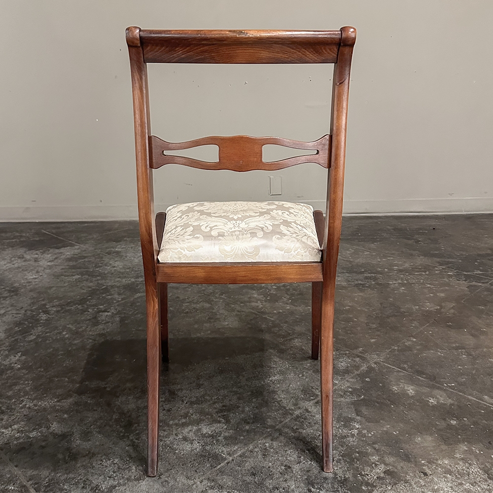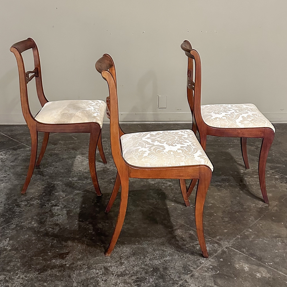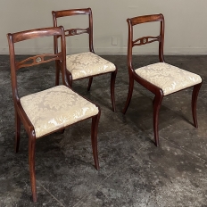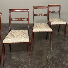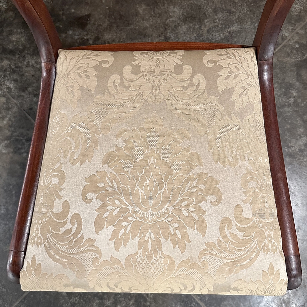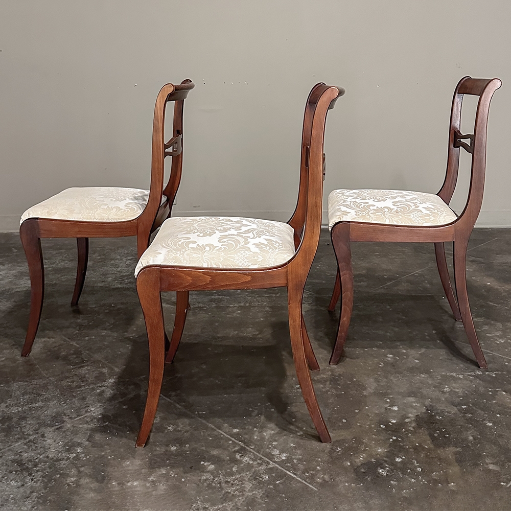 SaleSet of 6 Antique French Empire Revival Mahogany Dining Chairs represent a tailored expression of the style, featuring gracefully curved legs designed for visual appeal as well as adding stability to the design. Seat backs are straightforward but deceptively comfortable, with a rounded top cross piece, and a single horizontal splat pierce-carved to resemble two lyre forms, centered with a bronze medallion rosette. Seats are a good height, and upholstered recently in a fine damascene fabric in a subdued gold and beige tone that will prove very adaptable. The richness of the exotic imported wood cannot be denied, as well!