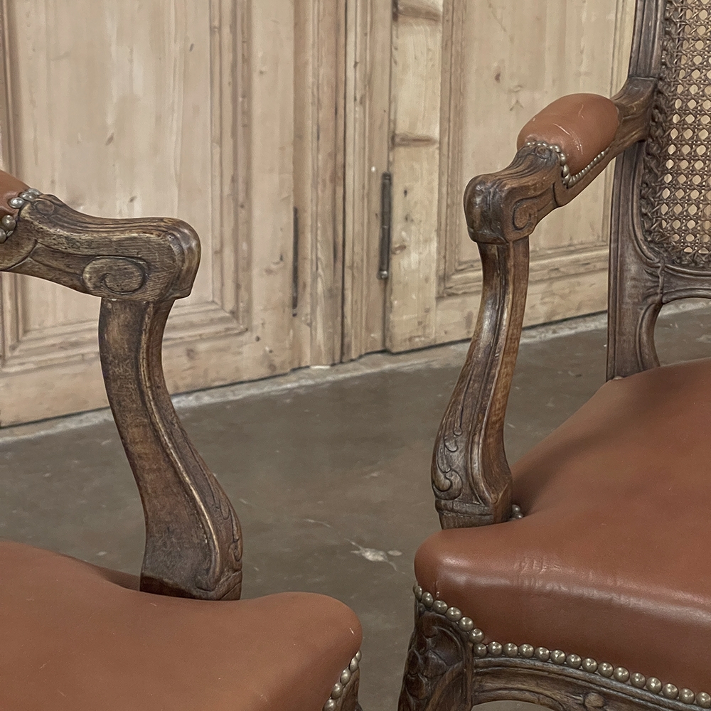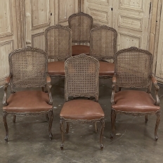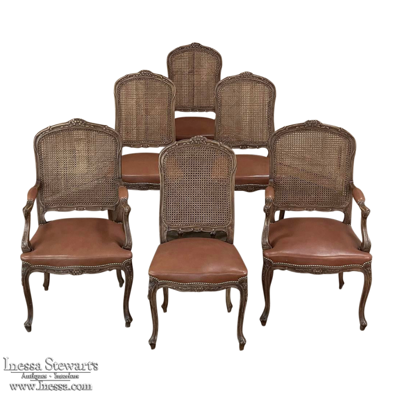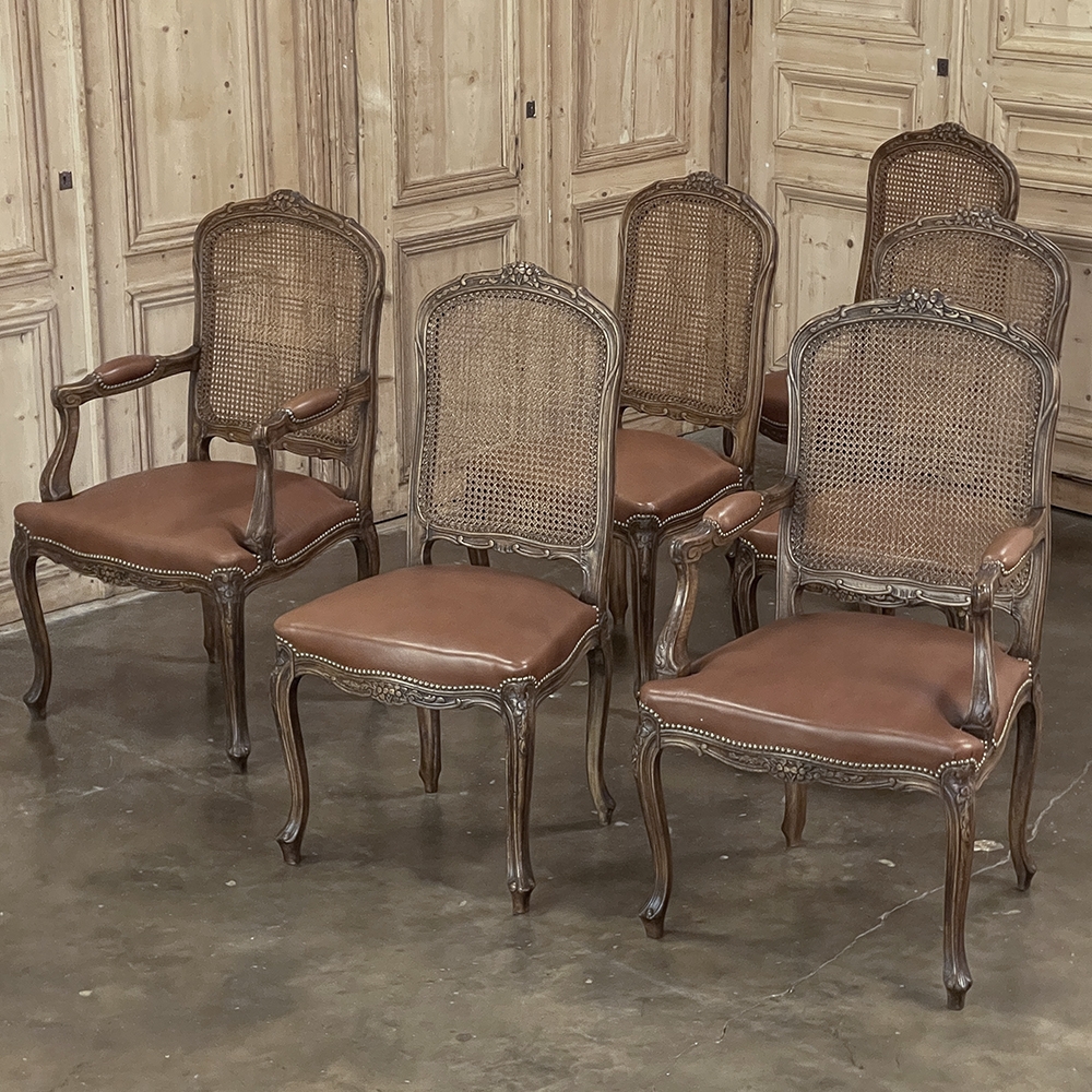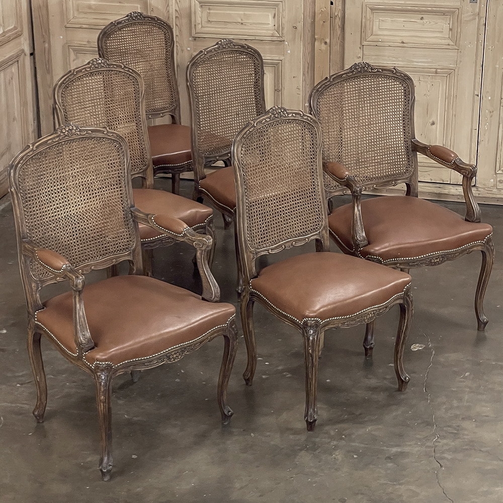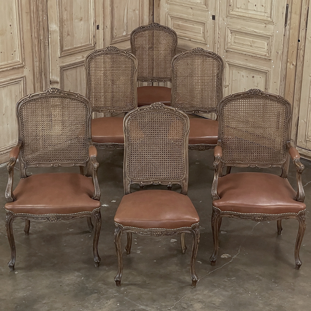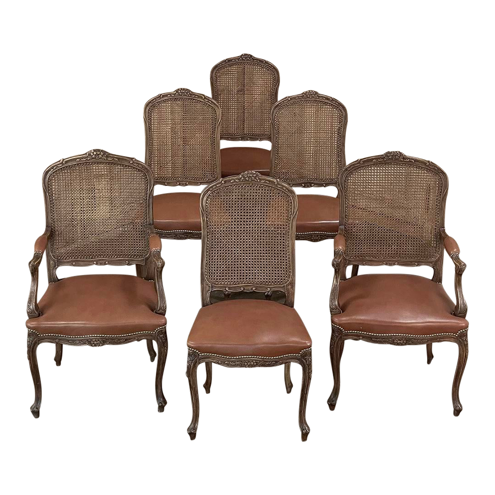 Set of 6 Antique French Louis XV Fruitwood Dining Chairs includes 2 Armchairs exude all the elegance of the style, but in a subtle and sophisticated expression. Hand-crafted and artfully carved from solid fruitwood, the set features a gentle arch to the seat back topped with carved floral and foliates that cascade outwards to the shoulders, with opposing scrolls and stylized shell at the bottom near the seat's top. The caned backs are original, and create a light weight comfort that "breathes" making them perfect for warmer climates. Padded armrests on the pair of armchairs and all seats were recently upholstered in faux leather for a long-wearing, good-looking result. The elegant scrolled design of the armrest supports is enhanced with cared acanthus fronds, connecting to the seat which is supported by a subtly scrolled apron and graceful cabriole legs all carved with complementary floral and foliate embellishment. All four legs on each chair are so treated making the set attractive from all angles, an important feature when one sees the entire room with the chairs in place around your dining table.
