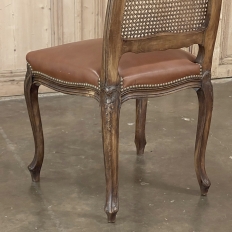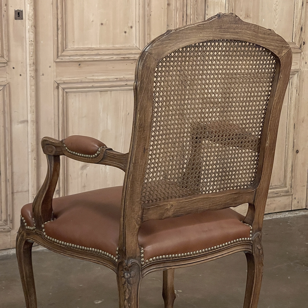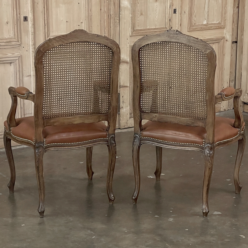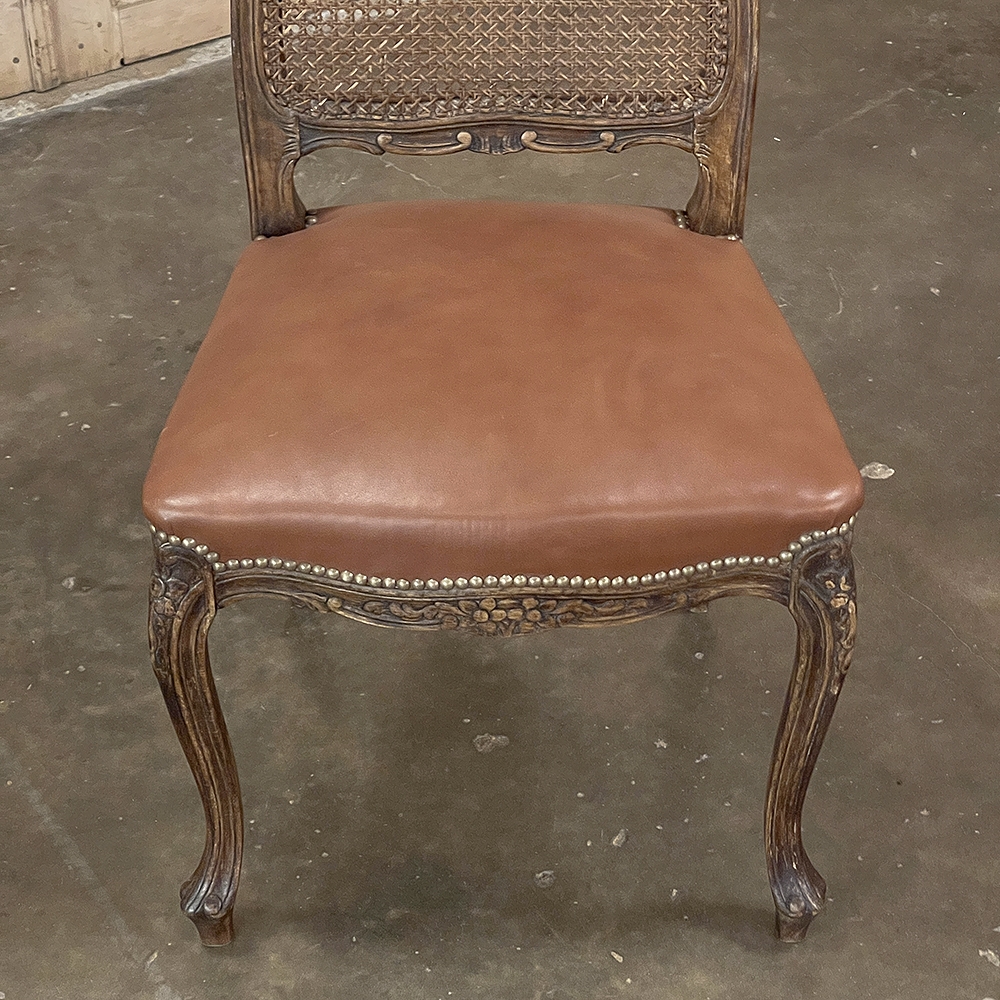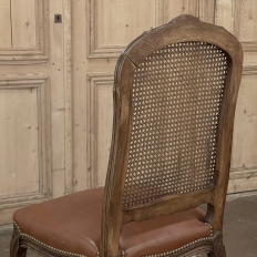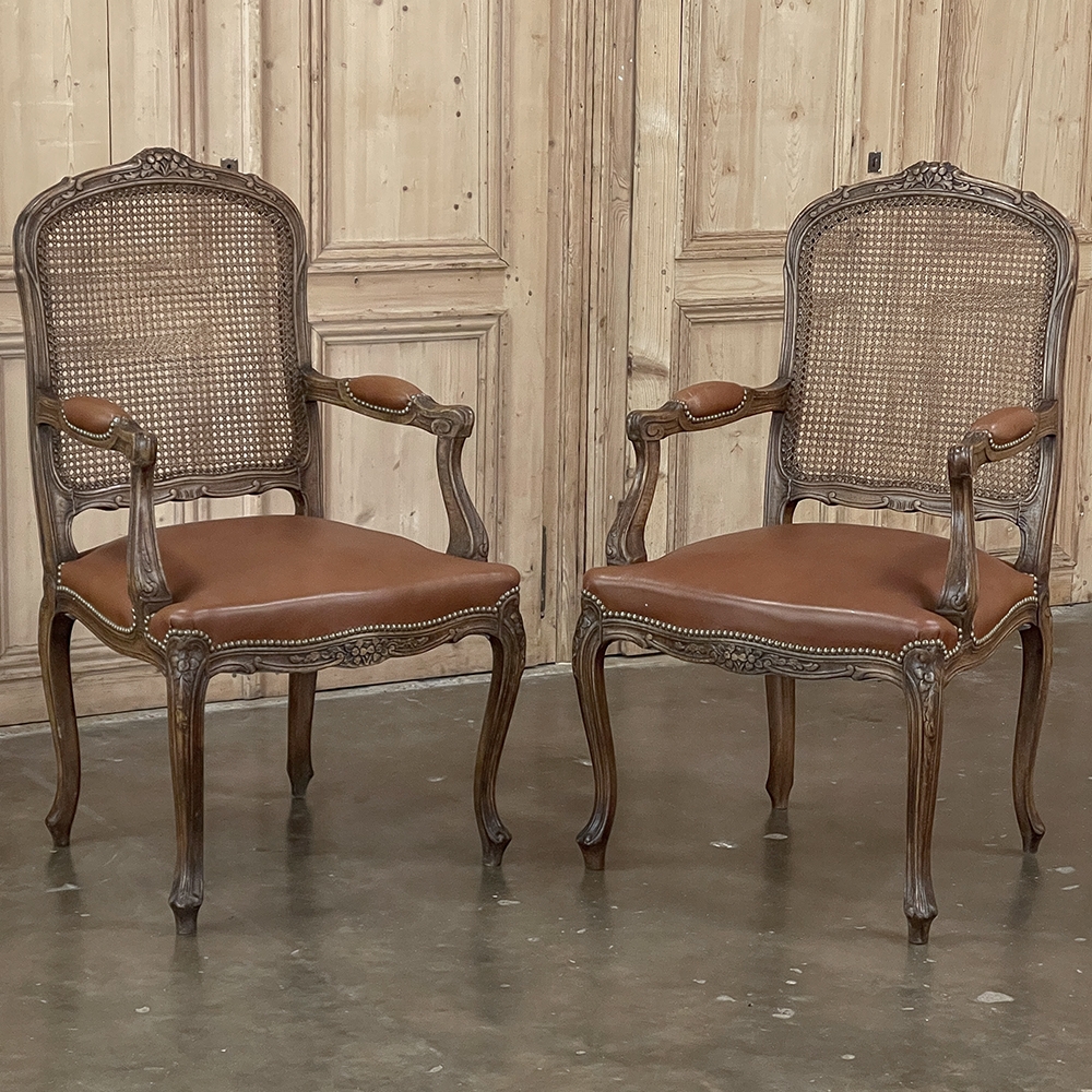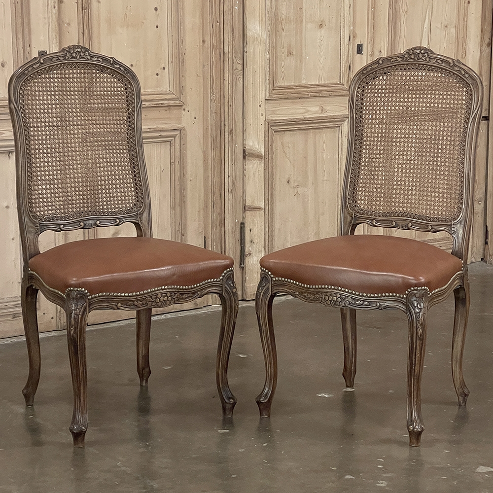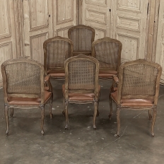 Set of 6 Antique French Louis XV Fruitwood Dining Chairs includes 2 Armchairs exude all the elegance of the style, but in a subtle and sophisticated expression. Hand-crafted and artfully carved from solid fruitwood, the set features a gentle arch to the seat back topped with carved floral and foliates that cascade outwards to the shoulders, with opposing scrolls and stylized shell at the bottom near the seat's top. The caned backs are original, and create a light weight comfort that "breathes" making them perfect for warmer climates. Padded armrests on the pair of armchairs and all seats were recently upholstered in faux leather for a long-wearing, good-looking result. The elegant scrolled design of the armrest supports is enhanced with cared acanthus fronds, connecting to the seat which is supported by a subtly scrolled apron and graceful cabriole legs all carved with complementary floral and foliate embellishment. All four legs on each chair are so treated making the set attractive from all angles, an important feature when one sees the entire room with the chairs in place around your dining table.