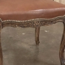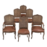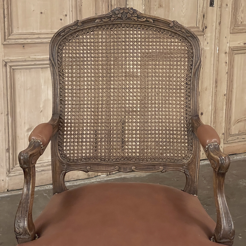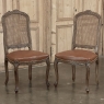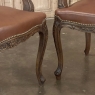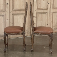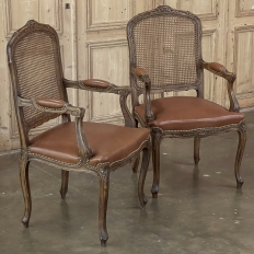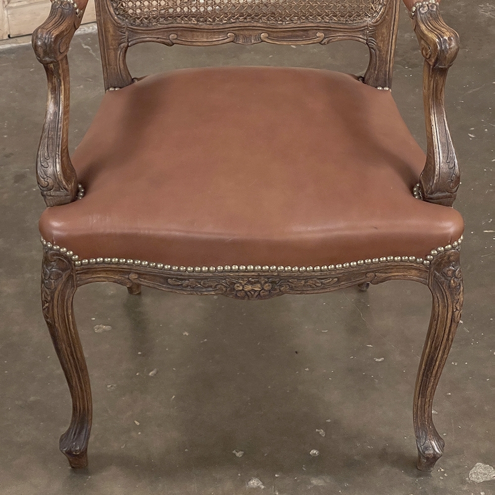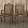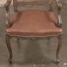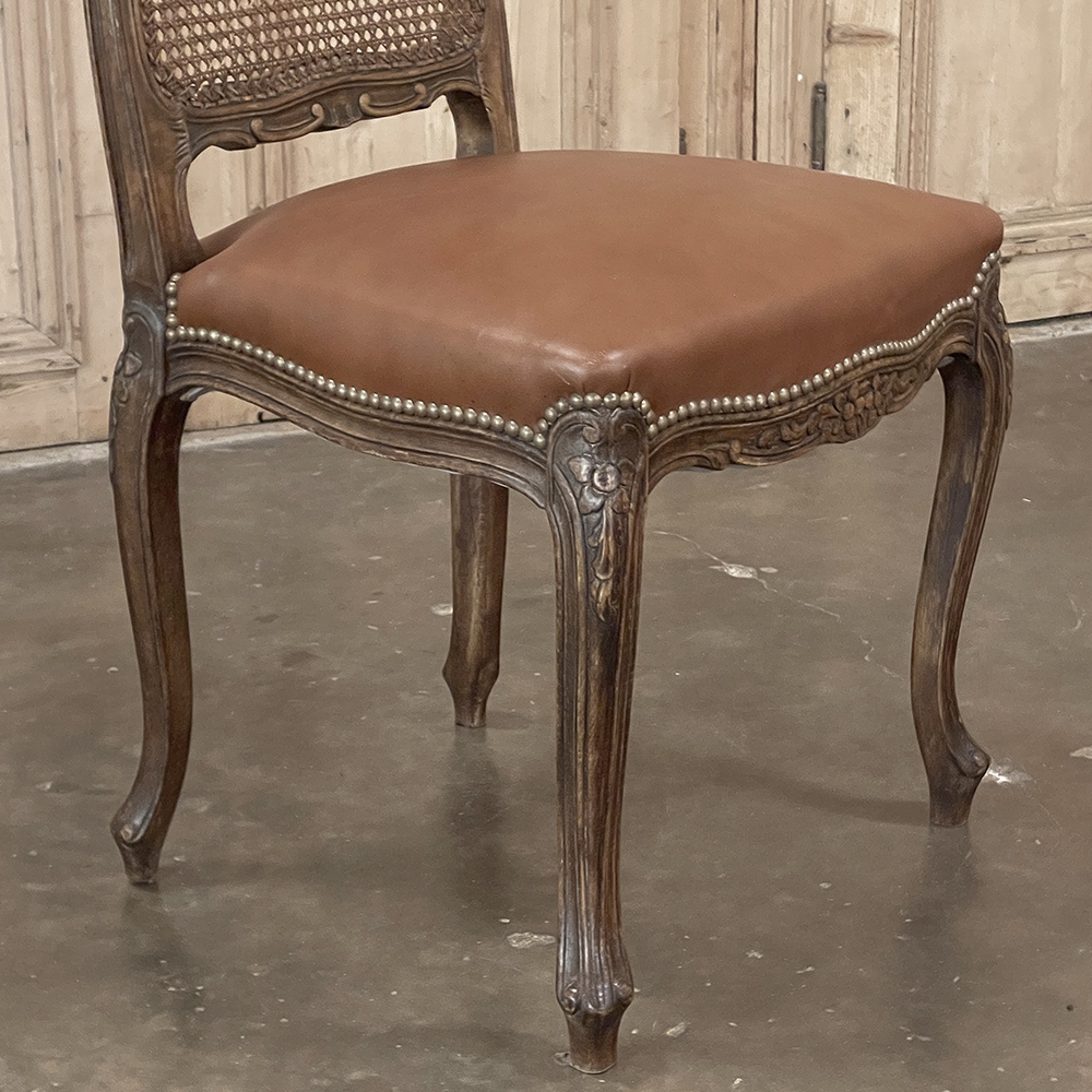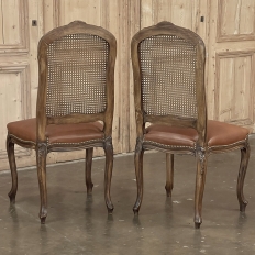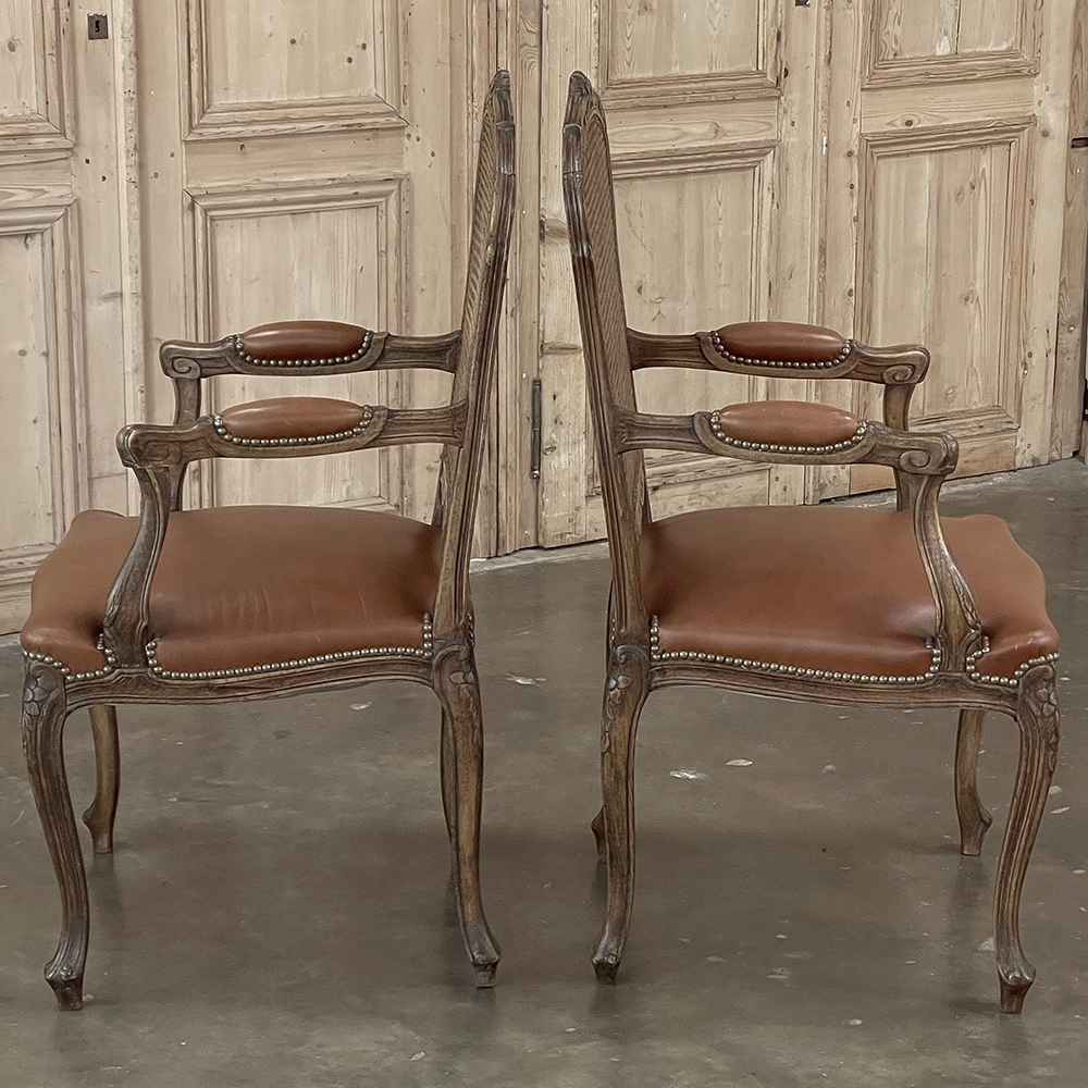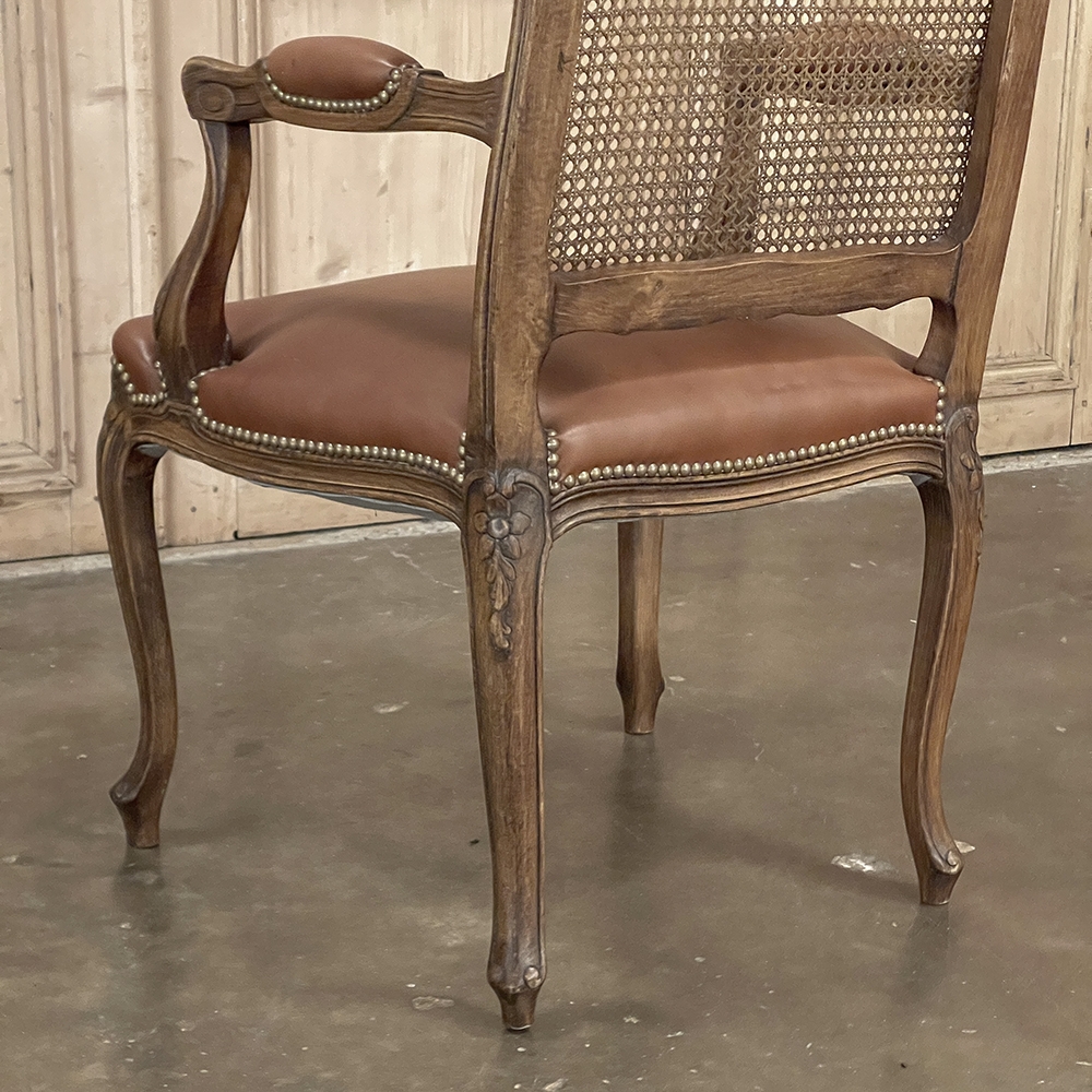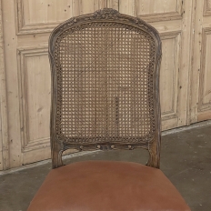 Set of 6 Antique French Louis XV Fruitwood Dining Chairs includes 2 Armchairs exude all the elegance of the style, but in a subtle and sophisticated expression. Hand-crafted and artfully carved from solid fruitwood, the set features a gentle arch to the seat back topped with carved floral and foliates that cascade outwards to the shoulders, with opposing scrolls and stylized shell at the bottom near the seat's top. The caned backs are original, and create a light weight comfort that "breathes" making them perfect for warmer climates. Padded armrests on the pair of armchairs and all seats were recently upholstered in faux leather for a long-wearing, good-looking result. The elegant scrolled design of the armrest supports is enhanced with cared acanthus fronds, connecting to the seat which is supported by a subtly scrolled apron and graceful cabriole legs all carved with complementary floral and foliate embellishment. All four legs on each chair are so treated making the set attractive from all angles, an important feature when one sees the entire room with the chairs in place around your dining table.