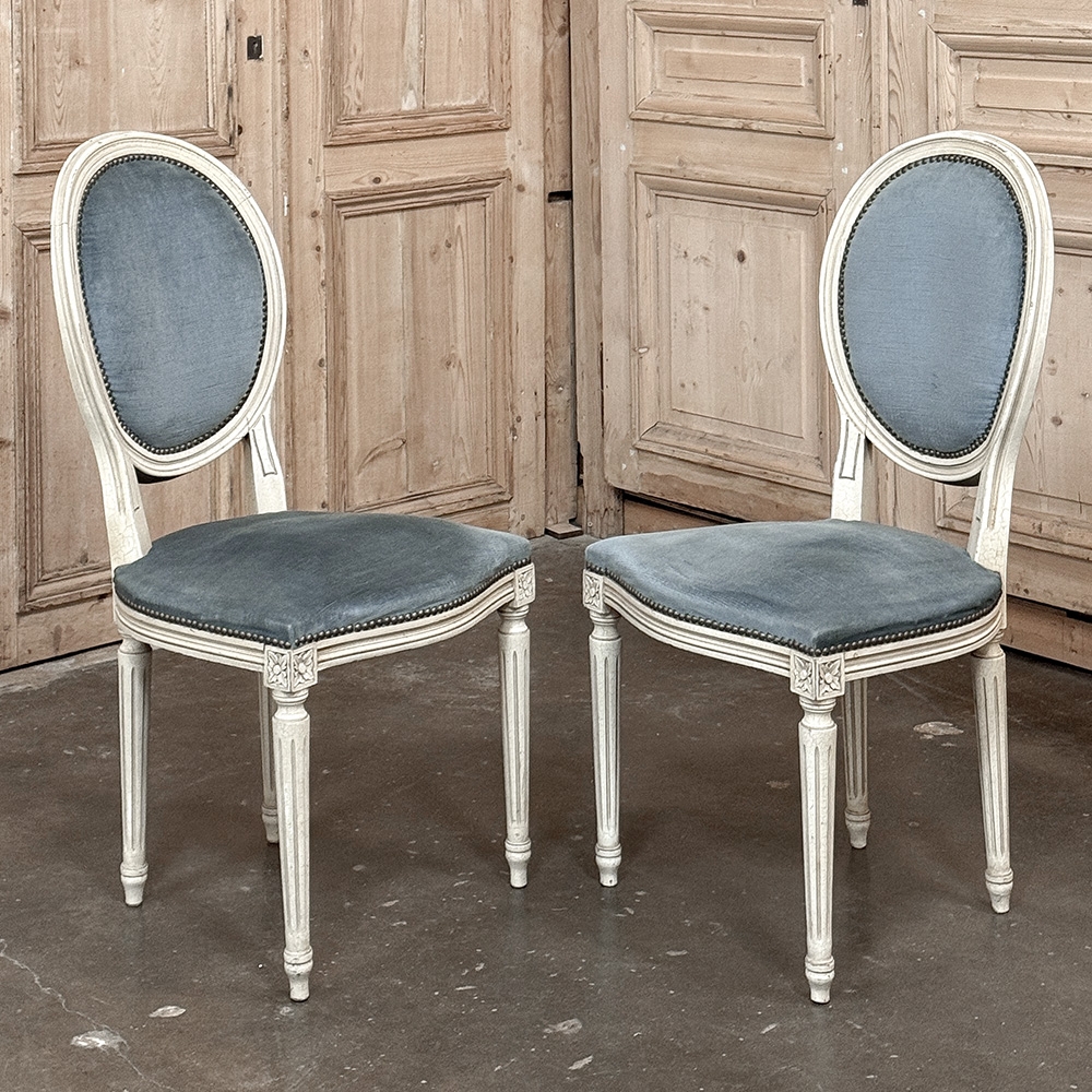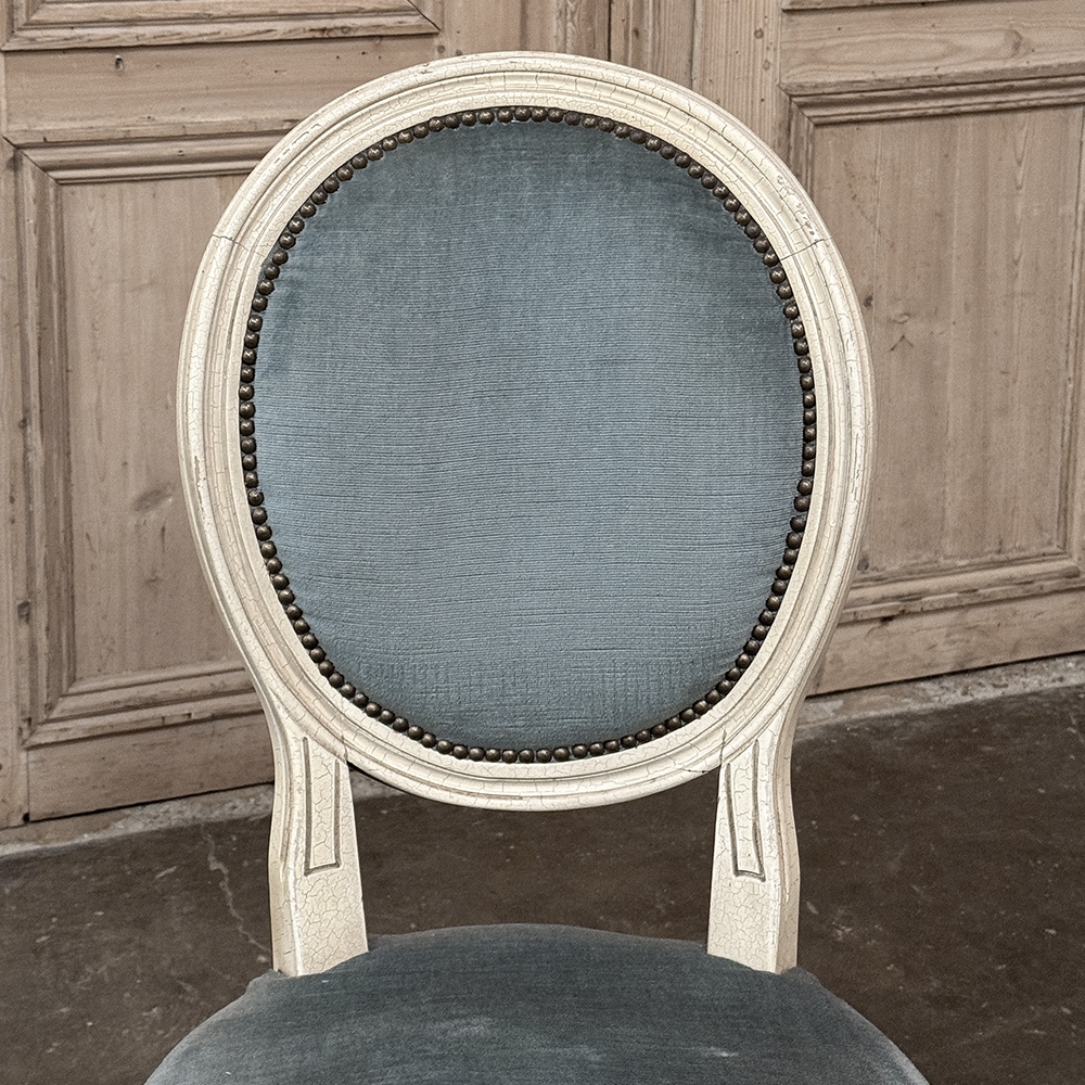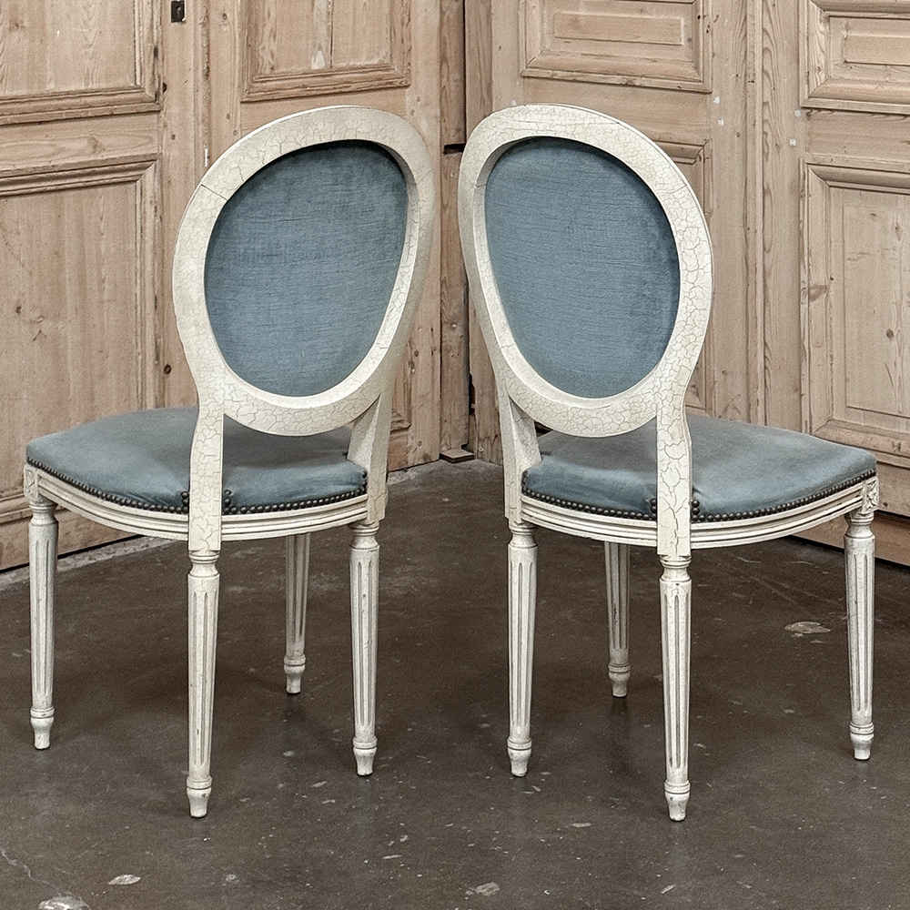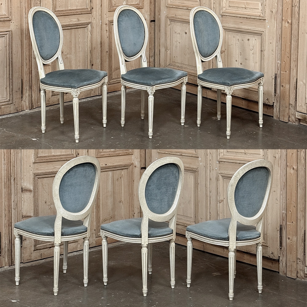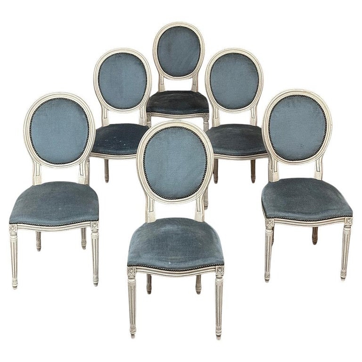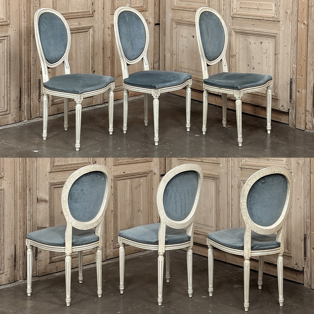 Set of 6 Antique French Louis XVI Painted Dining Chairs with Mohair are the ideal choice for lending a light and airy elegance to your dining experience! Hand-crafted from select hardwoods, each sports a contoured oval seat back to wrap your torso in comfort, with generously sized seats perfect for dining, all upholstered in mohair which is showing some signs of age but still serviceable. The frames are finely contoured, and feature rosette accents and tapered & fluted treatment to each and every leg. The painted finish has achieved both a lovely patina and a "crackling" aging effect that adds a little casual aspect to the formality of the set.