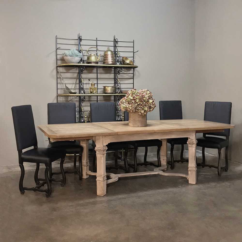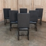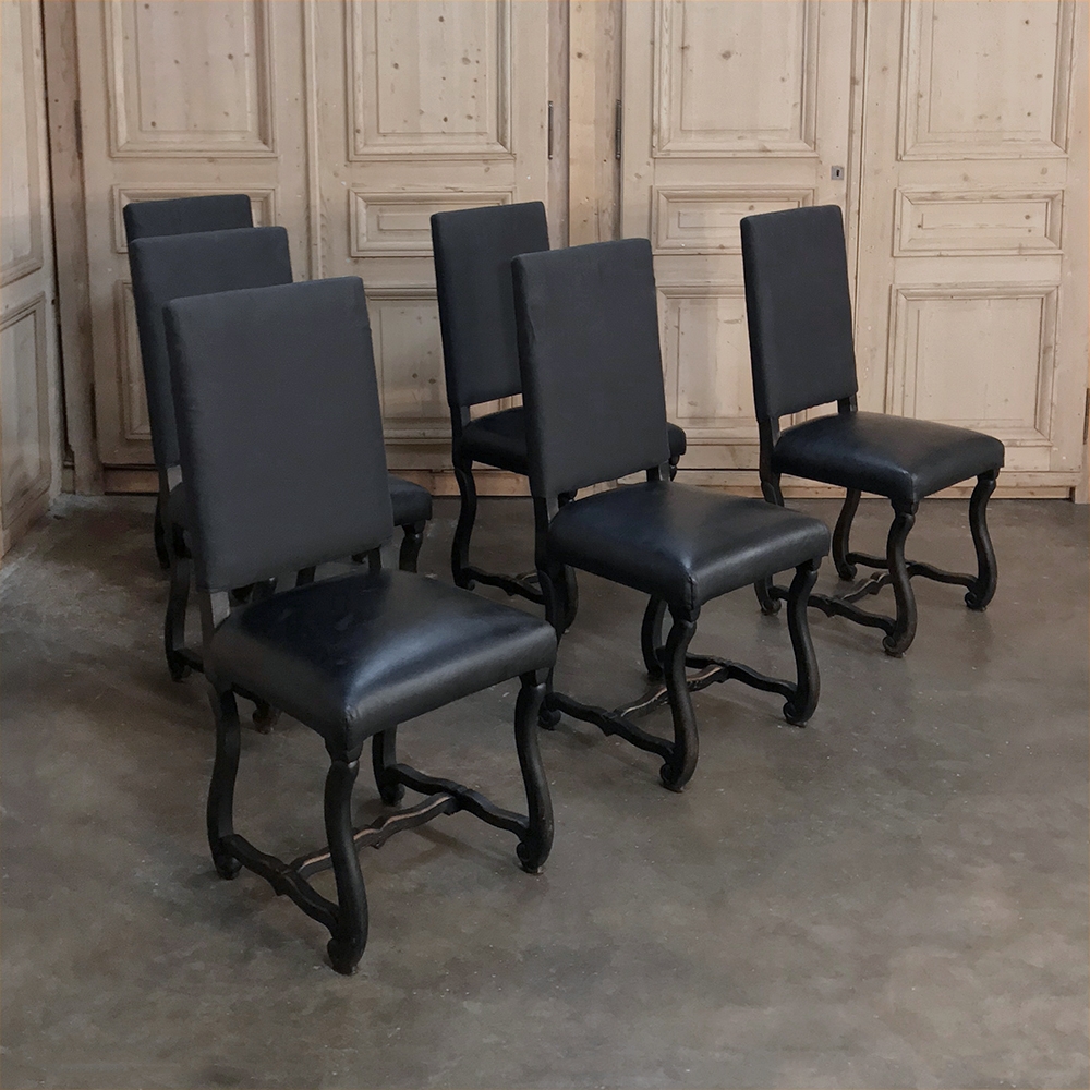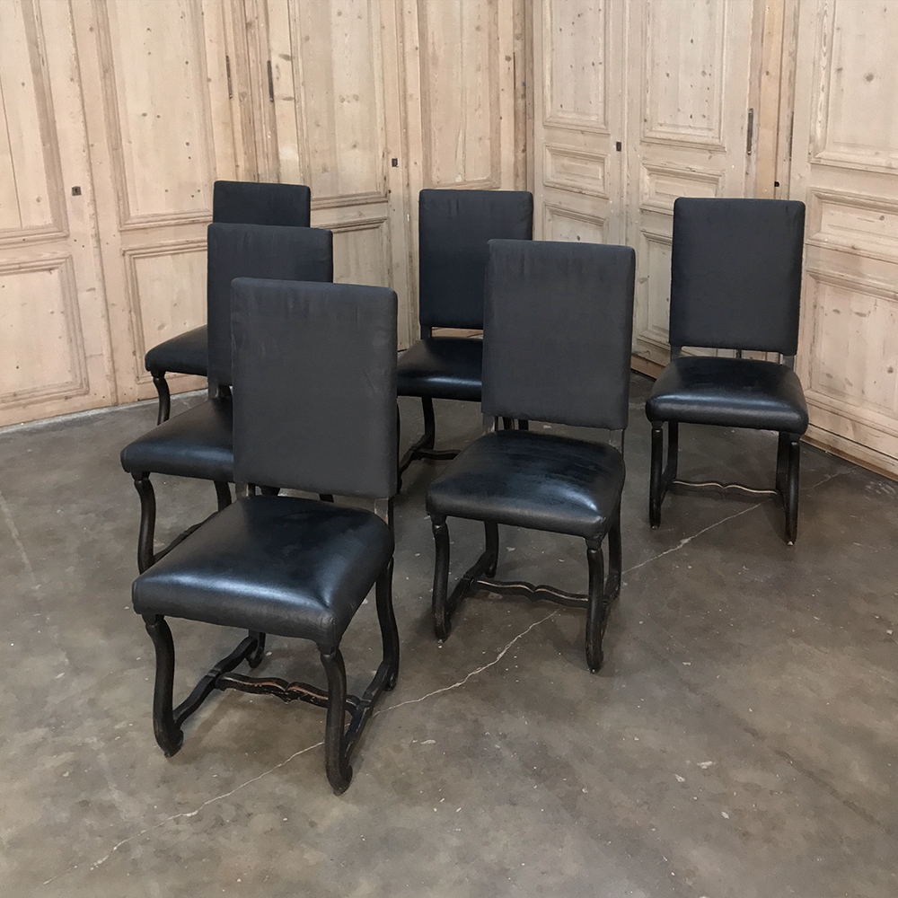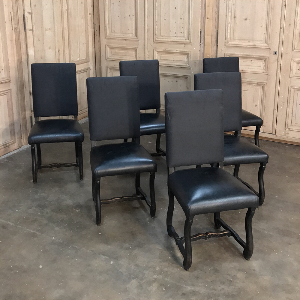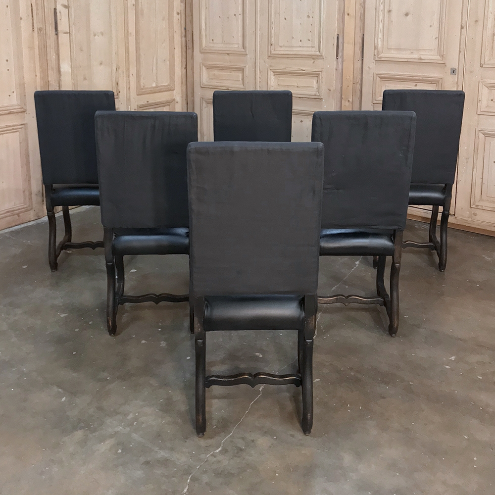 Set of 6 Antique French Os de Mouton Dining Chairs with Faux Leather feature faux leather seats and black linen upholstery for the seatbacks, both of which are in serviceable condition. Hand-crafted French classic Os de Mouton frames from solid old-growth oak are stained in a dark weathered finish.