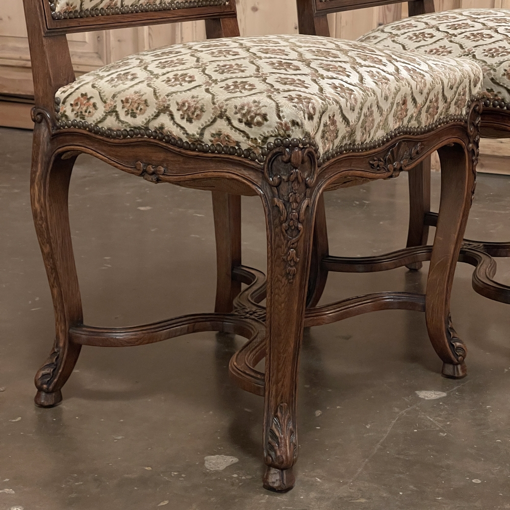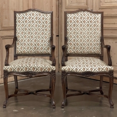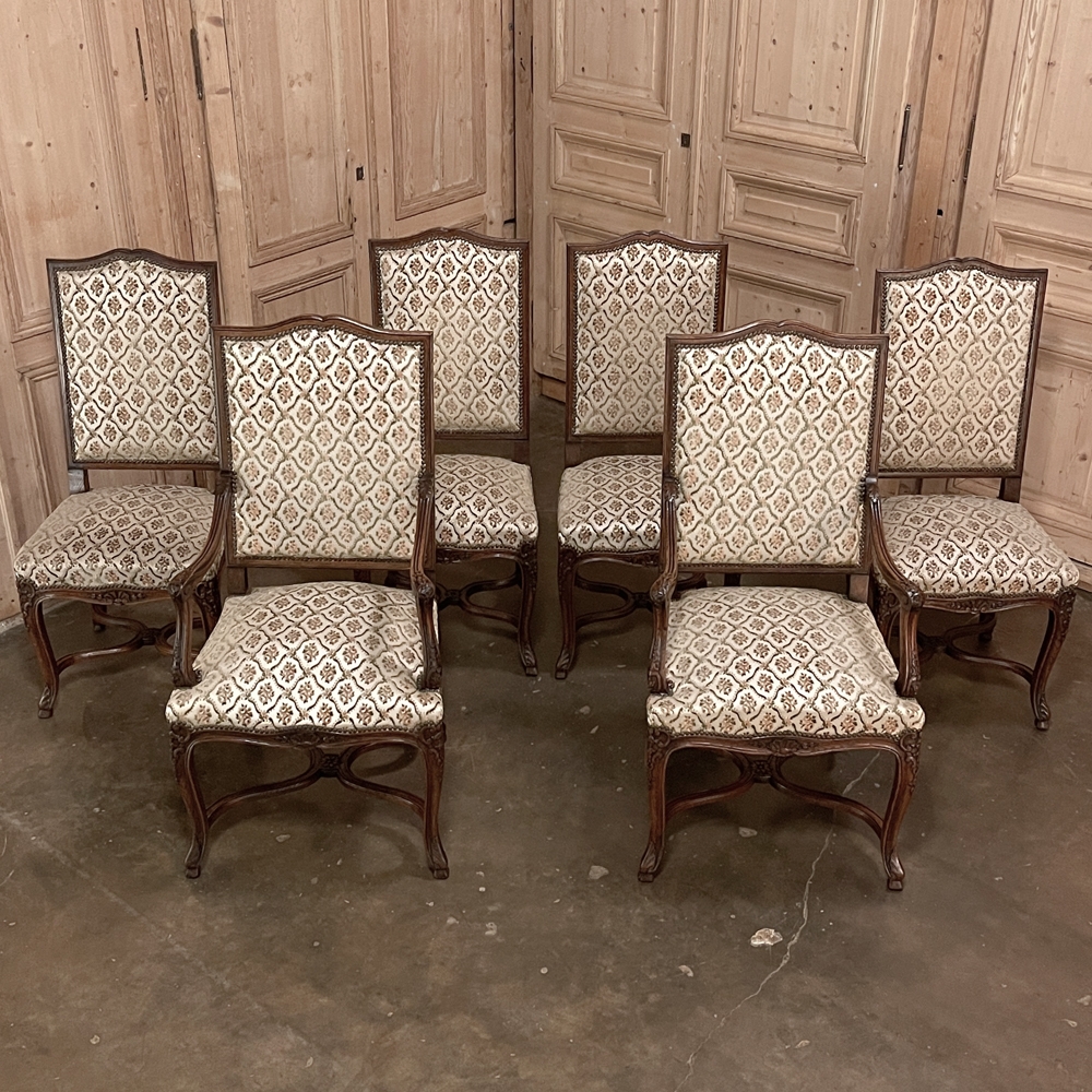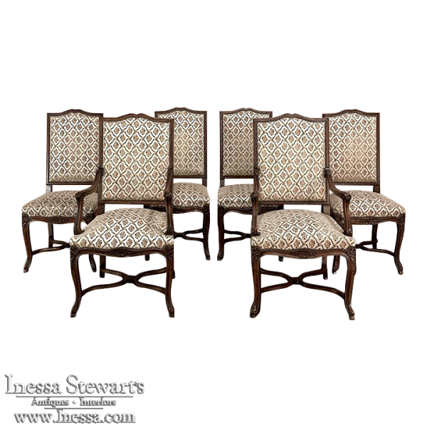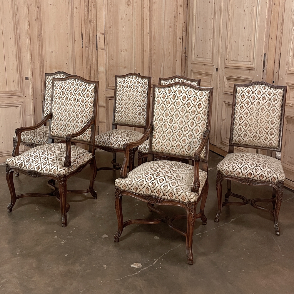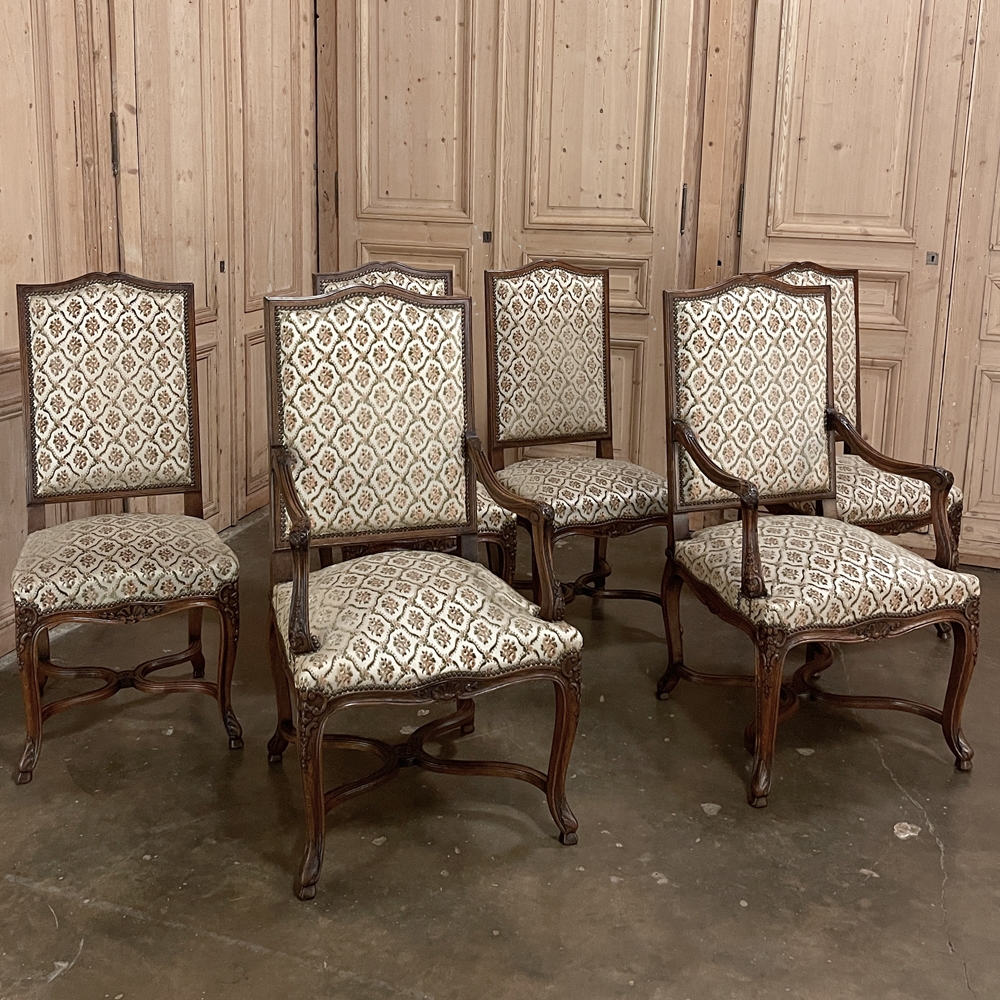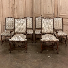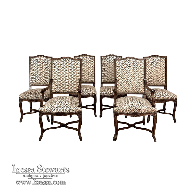 SaleSet of 6 Antique French Regence Dining Chairs includes 2 Armchairs and represent the perfect combination of form, function and comfort! Gracefully arched seatbacks are generously sized, as are the seats, and all upholstered in fine, luxurious tapestry fabric. The lower frameworks are artistically carved with shell, floral and foliate motifs and feature gracious, elegant curves in a naturalistic form, including the cabriole legs, lyre stretchers, and even the armrests on the two matching armchairs included in the set!