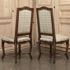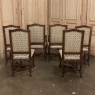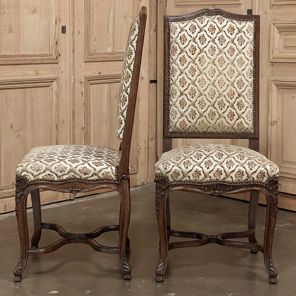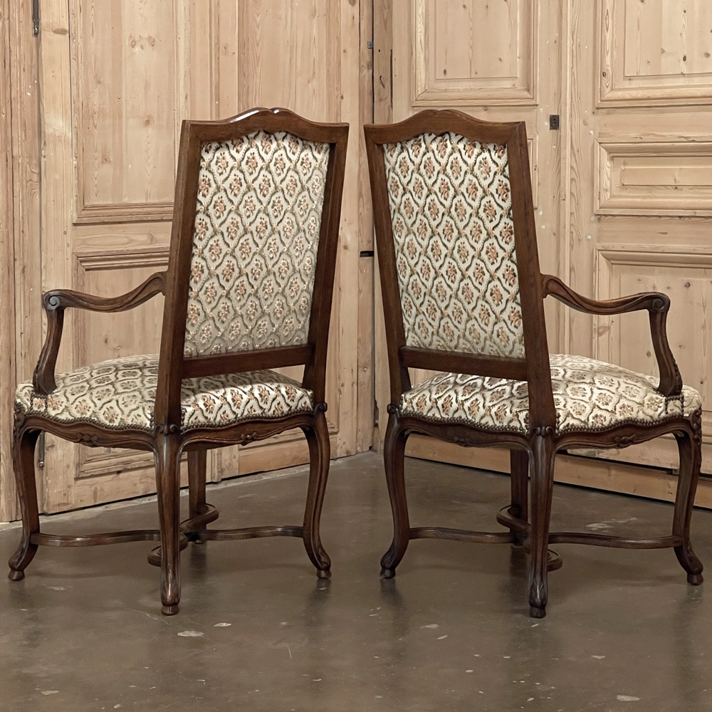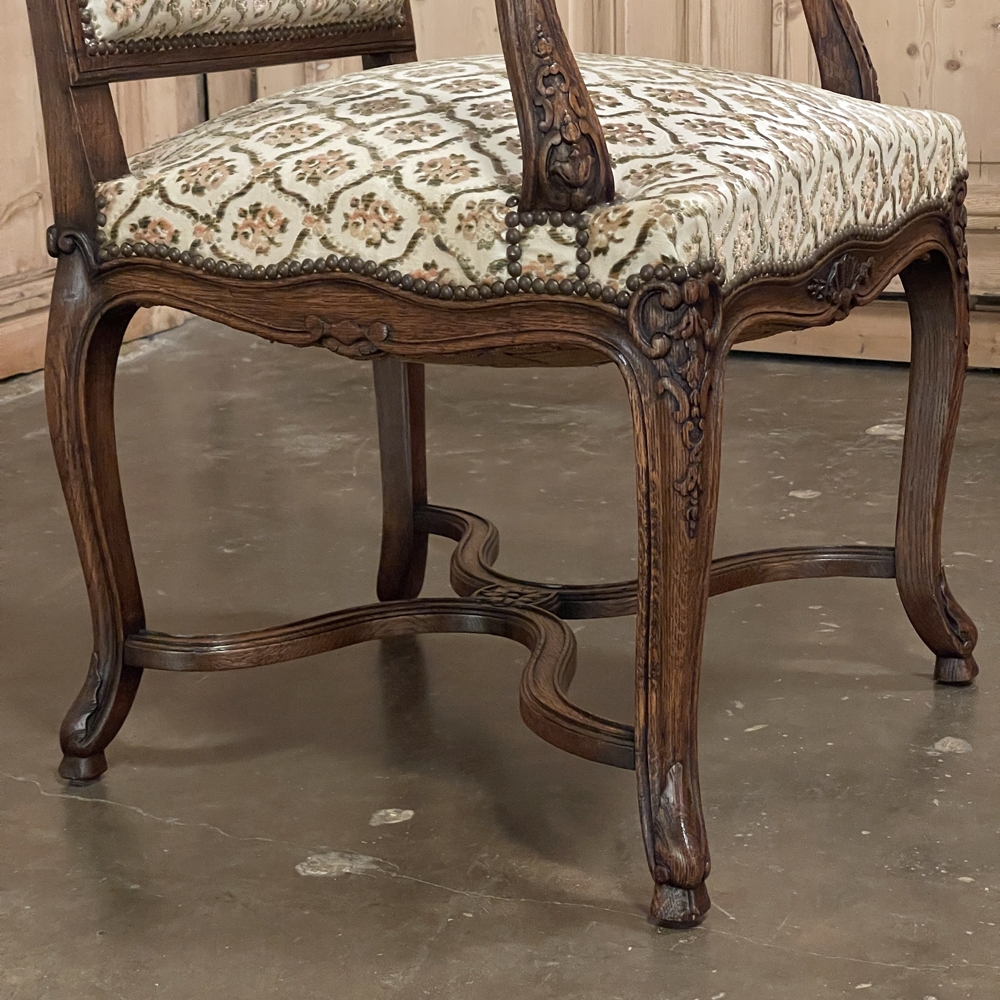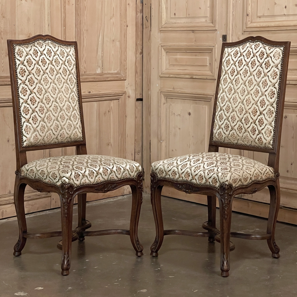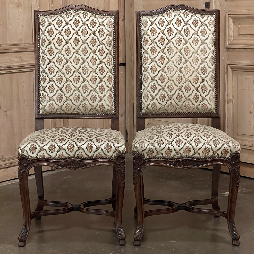 SaleSet of 6 Antique French Regence Dining Chairs includes 2 Armchairs and represent the perfect combination of form, function and comfort! Gracefully arched seatbacks are generously sized, as are the seats, and all upholstered in fine, luxurious tapestry fabric. The lower frameworks are artistically carved with shell, floral and foliate motifs and feature gracious, elegant curves in a naturalistic form, including the cabriole legs, lyre stretchers, and even the armrests on the two matching armchairs included in the set!