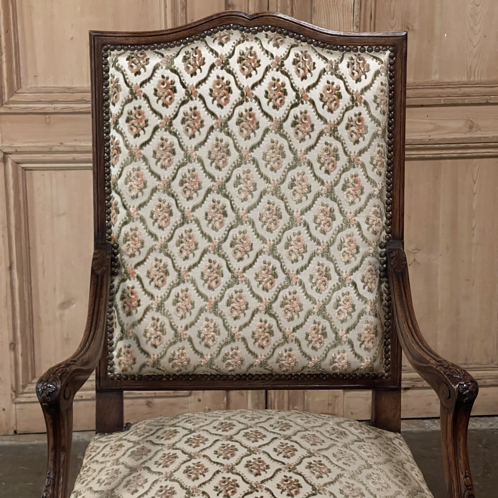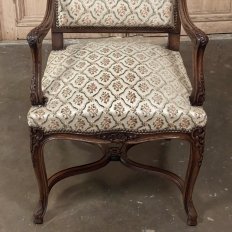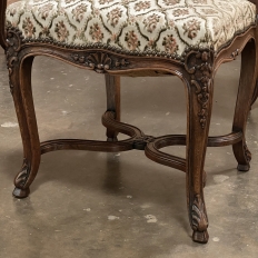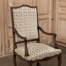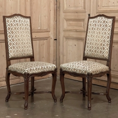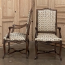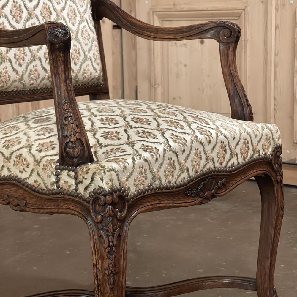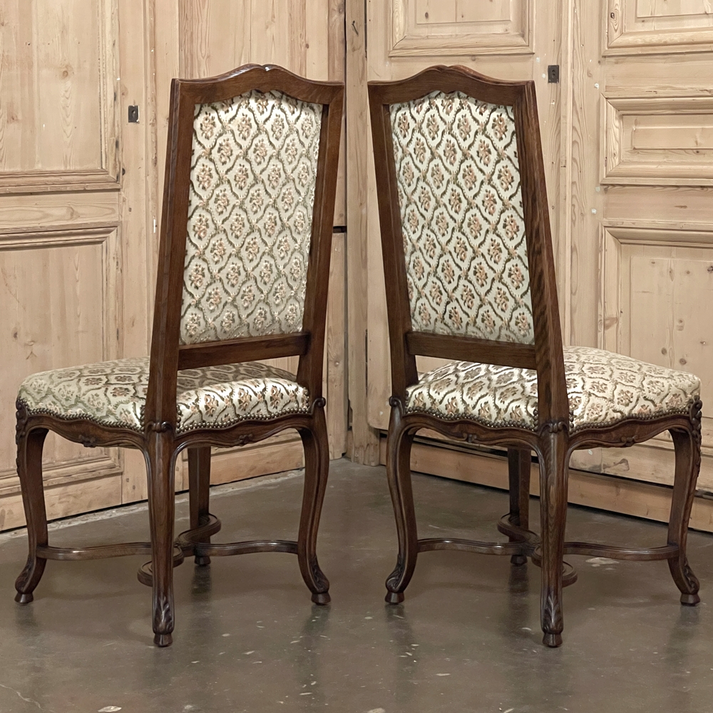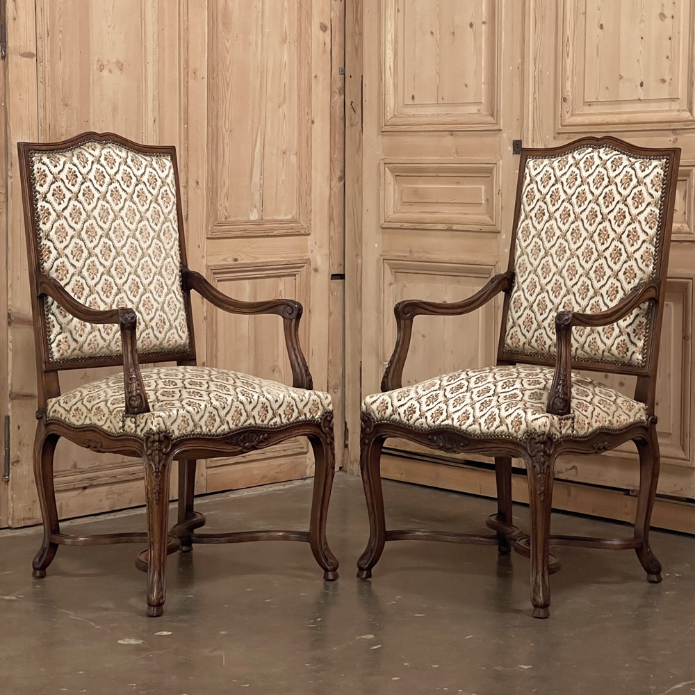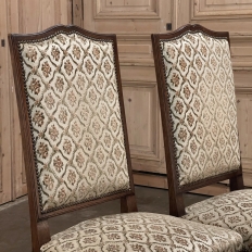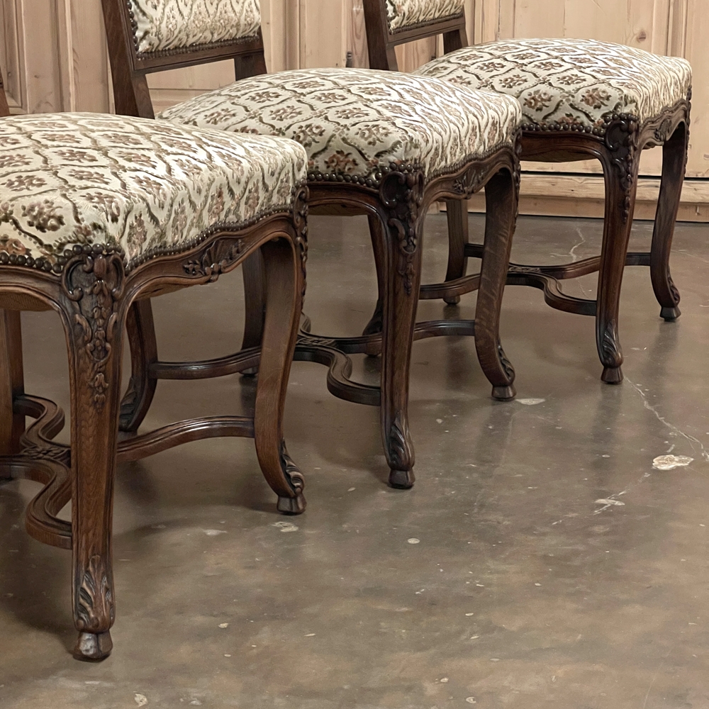 SaleSet of 6 Antique French Regence Dining Chairs includes 2 Armchairs and represent the perfect combination of form, function and comfort! Gracefully arched seatbacks are generously sized, as are the seats, and all upholstered in fine, luxurious tapestry fabric. The lower frameworks are artistically carved with shell, floral and foliate motifs and feature gracious, elegant curves in a naturalistic form, including the cabriole legs, lyre stretchers, and even the armrests on the two matching armchairs included in the set!