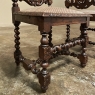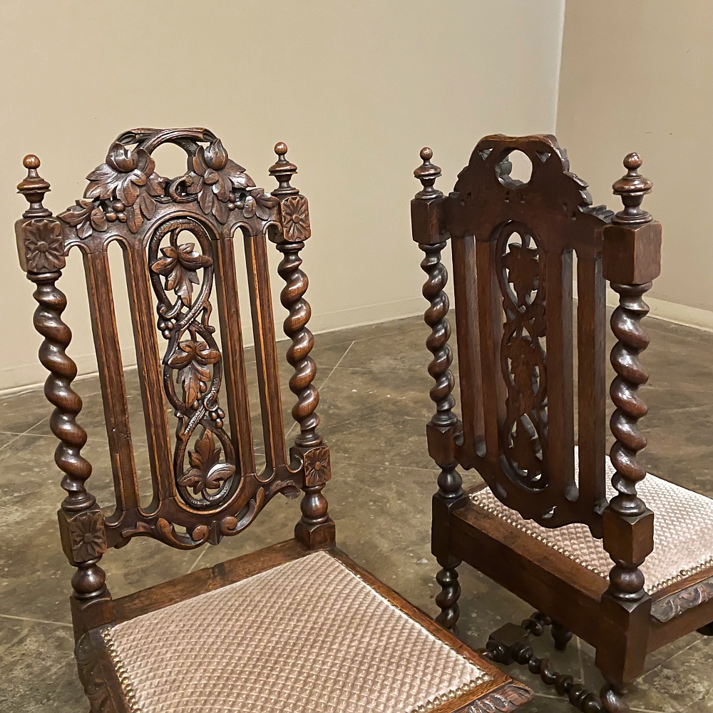 Set of 6 Antique French Renaissance Barley Twist Dining Chairs are the perfect answer for providing a charming Old World look for your dining enjoyment! Each features an amazingly crafted framework, which includes a backsplat carved with grape vines, a theme also used on the crown of the seatback, with a brace of clockwise & counter-clockwise barley twist columns providing the upright support, each fitted with two plinths carved with rosettes, and topped with a turned finial. The comfortable seats are upholstered in expensive fabric, and framed on three sides with demilune gadrooning. Support is provided by the same style as the seatback, with rosettes adorning plinths, and barley twist columns creating the legs and cross stretchers.
