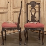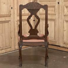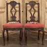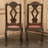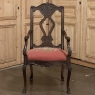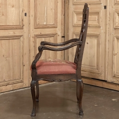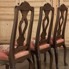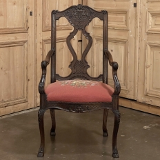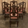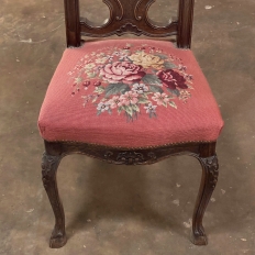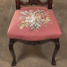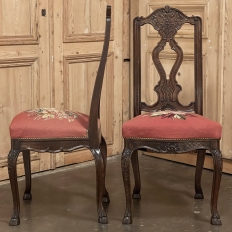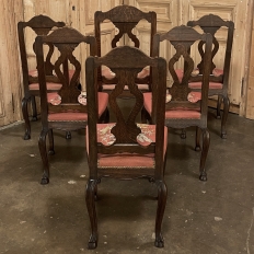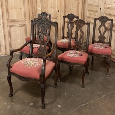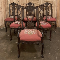 SaleSet of 6 Antique Liegeoise Needlepoint Dining Chairs includes one armchair! The exceptional quality of the set is immediately apparent, each being sculpted from select old-growth oak that is dense and hard to carve but once sculpted by a skilled artisan, will last much longer than other woods. The graceful form of the design is inspired by the Louis XIV French concept, with an open urn shaped backsplat, triple arched seatback crown, and generously sized seats. The armchair boasts two elegantly contoured armrests that are quite comfortable, and carved with acanthus plumes complementing the shell, acanthus plumes and cross hatching of the apron and four cabriole legs below. Each leg is tipped with cloven hoof feet. The seats steal the show, however, with hand-knotted needlepoint tapestry that is as durable as it is beautiful. Two of the chairs appear to have a similar design, and two more each have a similar design, with the fifth chair unique in the set. The armchair needlepoint is also unique in the set. Imagine the hour after hour of meticulous labor required to produce such a set, from the excellent sculpture of the frameworks to the artistry of the colorful tapestry seats!
