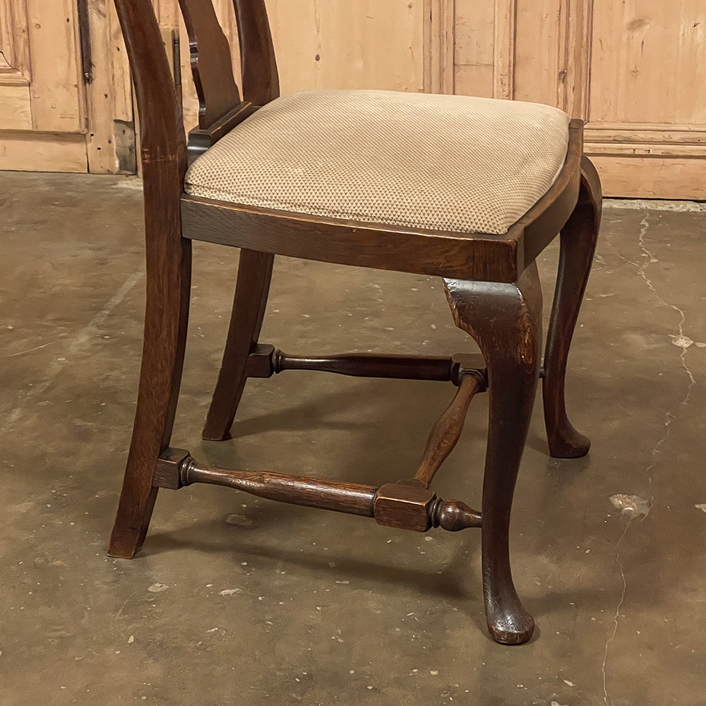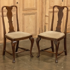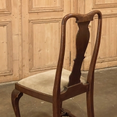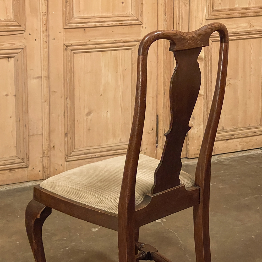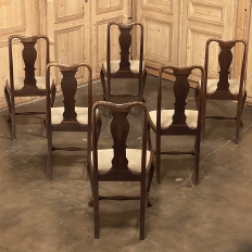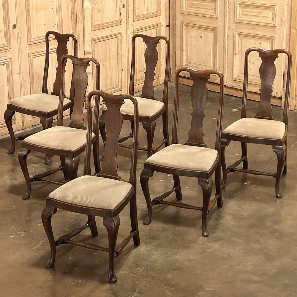 Set of 6 Antique Queen Anne Chestnut Dining Chairs are ideal for adding understated elegance for either formal or more casual dining settings. The ergonomically curved seatbacks with solid splats are sturdily made, and connect to a generously sized seat with upholstery that remains quite serviceable. A framework surrounds the seat creating a simple apron, whereupon the back supports continue in one piece to form the back legs, with the trademark Queen Anne form chosen for the front legs, tipped with club feet. Connected with an offset "H" stretcher consisting of turnings from solid wood, they provide grace, beauty, and will also provide enjoyment for many hundreds of meals to come!