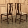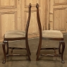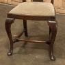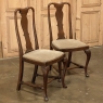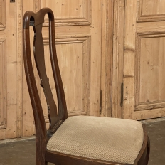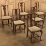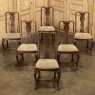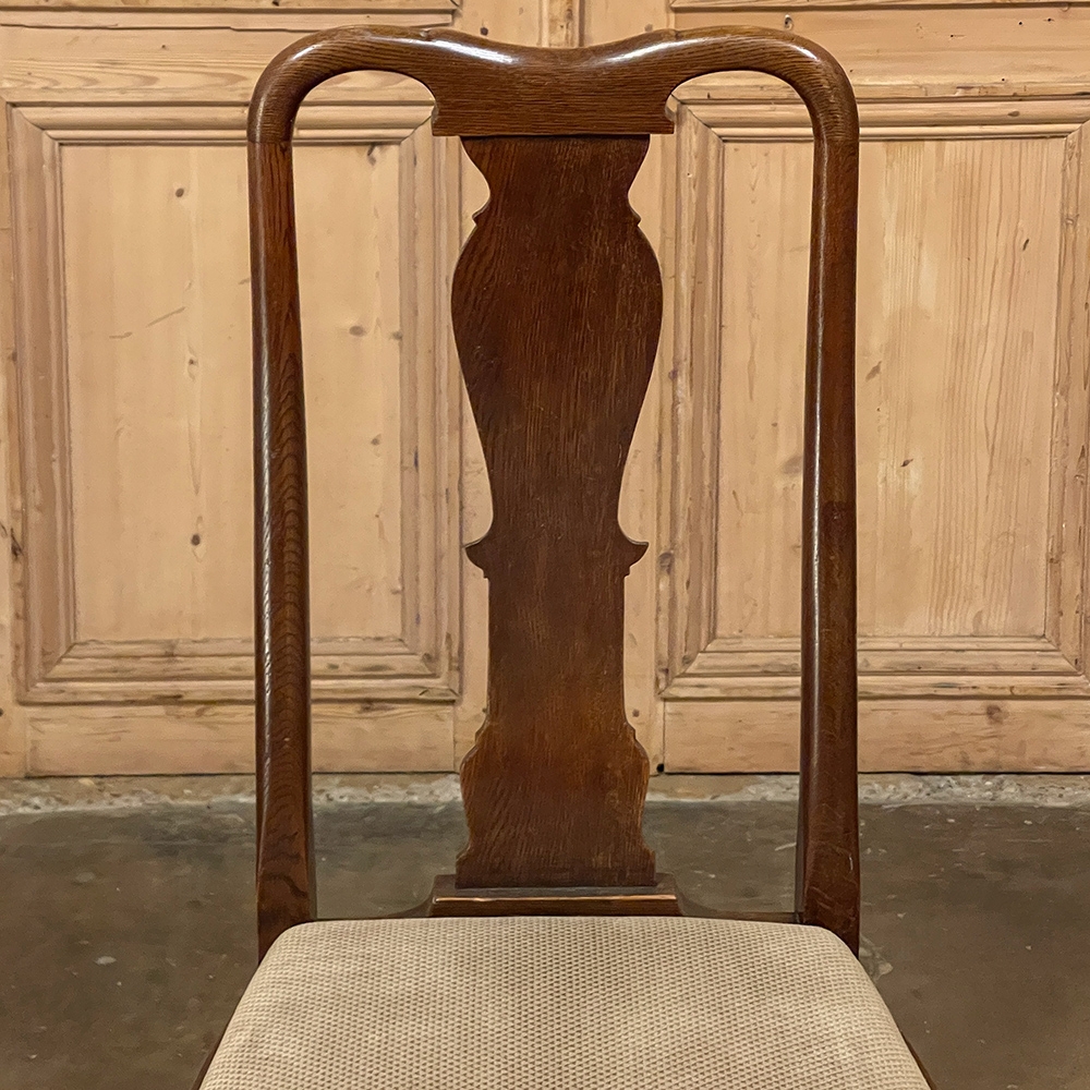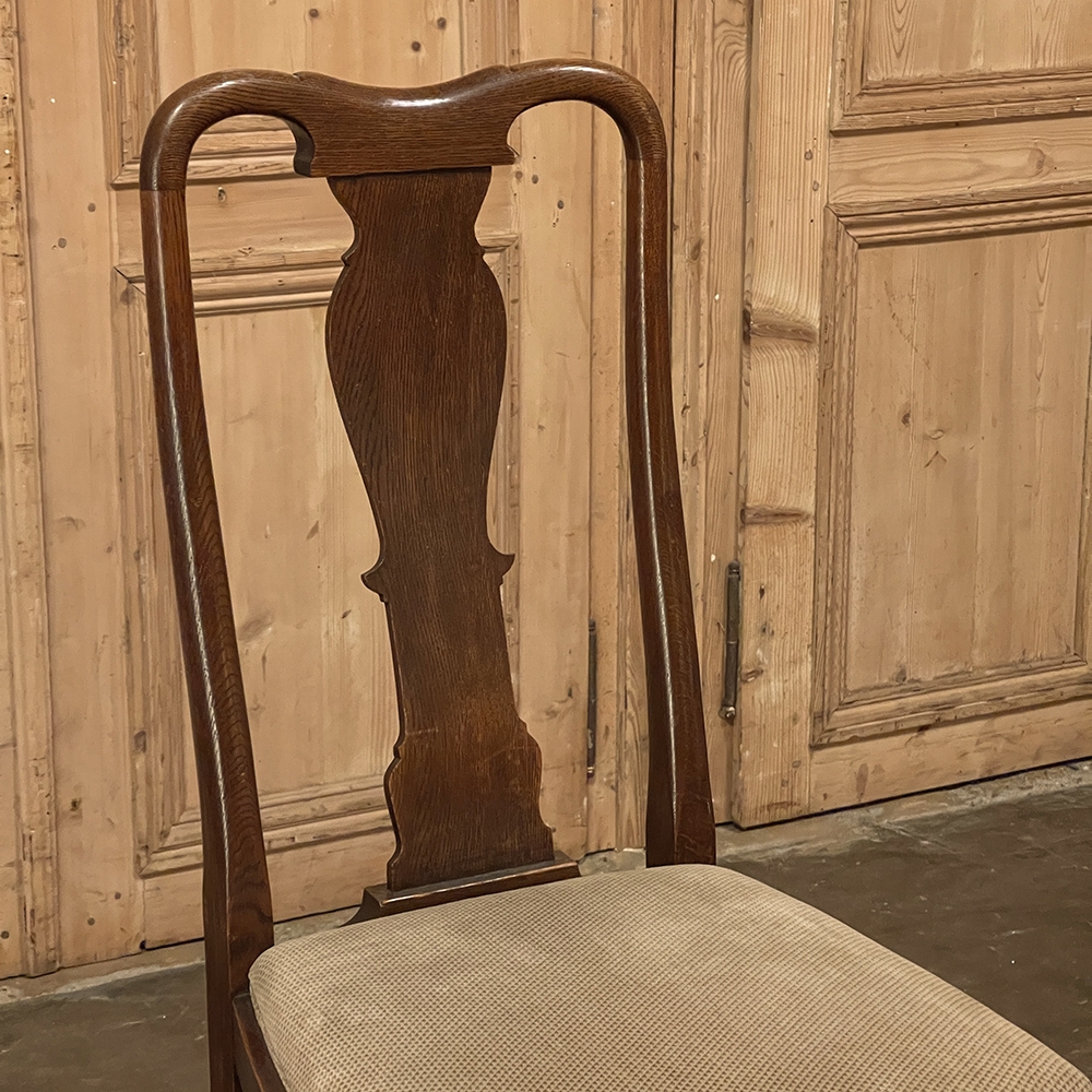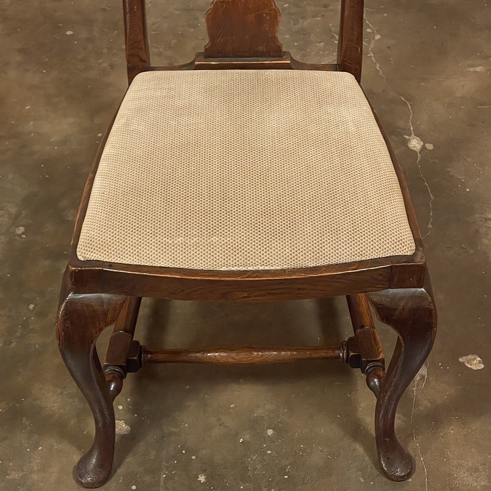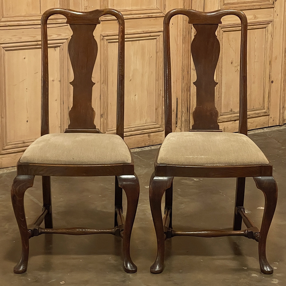 Set of 6 Antique Queen Anne Chestnut Dining Chairs are ideal for adding understated elegance for either formal or more casual dining settings. The ergonomically curved seatbacks with solid splats are sturdily made, and connect to a generously sized seat with upholstery that remains quite serviceable. A framework surrounds the seat creating a simple apron, whereupon the back supports continue in one piece to form the back legs, with the trademark Queen Anne form chosen for the front legs, tipped with club feet. Connected with an offset "H" stretcher consisting of turnings from solid wood, they provide grace, beauty, and will also provide enjoyment for many hundreds of meals to come!
