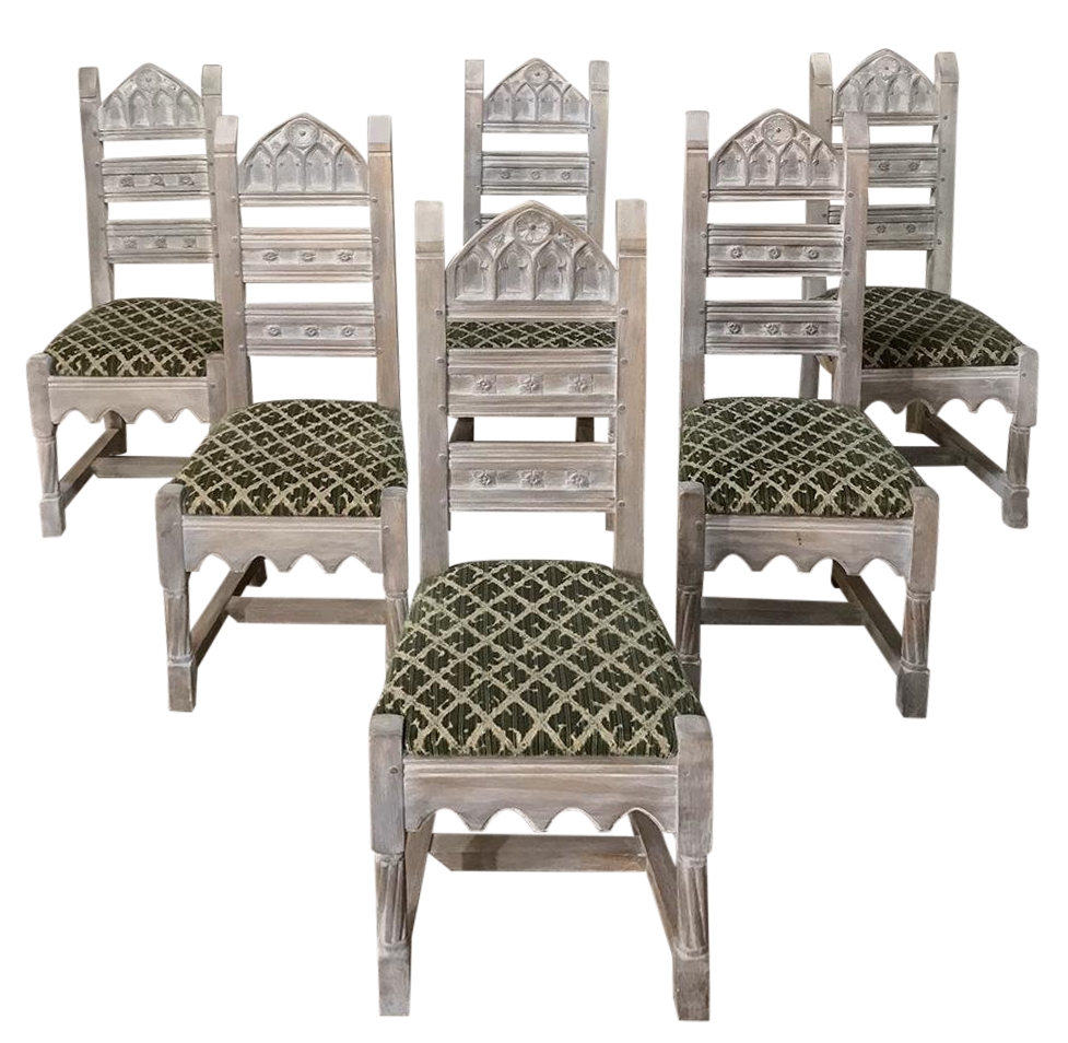 Set of 6 Antique Rustic French Gothic Whitewashed Dining Chairs