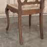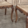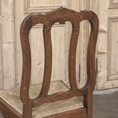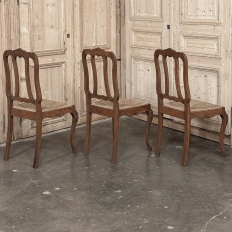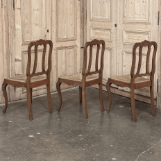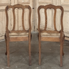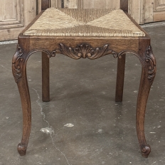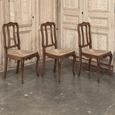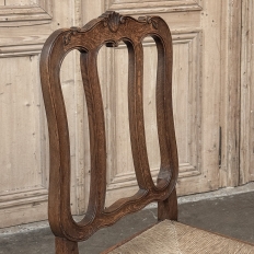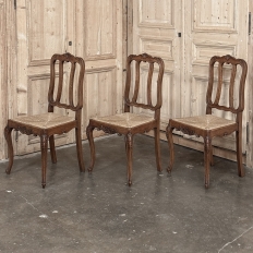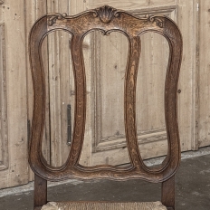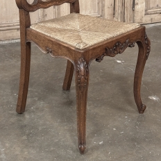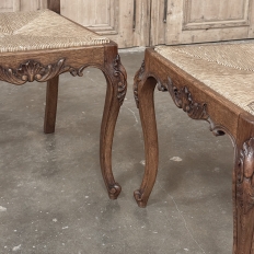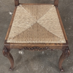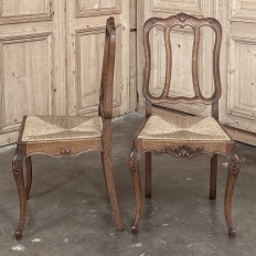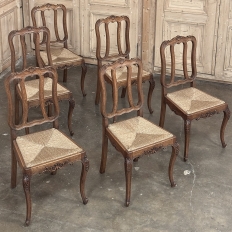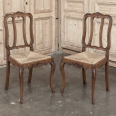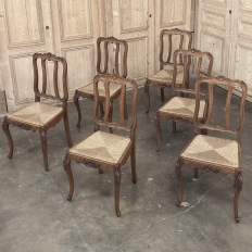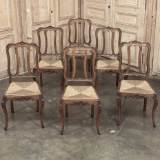 Set of 6 Country French Dining Chairs with Rush Seats are the ultimate in relaxed, casual dining style. Hand-crafted from solid oak frames, each boasts the classic "lyre" shaped back so noted because of its resemblance to the ancient musical instrument. Seats are trapezoidal and comfortably finished in rush, so that one can use them as is, or add cushions in coordinating fabric. The seats feature undulating aprons and elegant cabriole legs, with carved embellishment appearing in the form of foliates and shells appearing at the top of the seat back crown down to the shoulders of the legs, with escargot feet to finish the design.