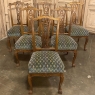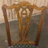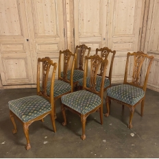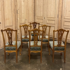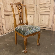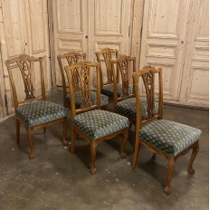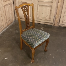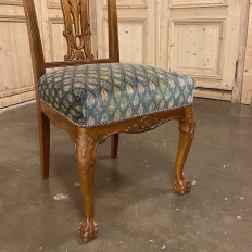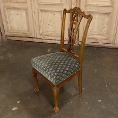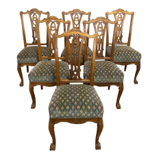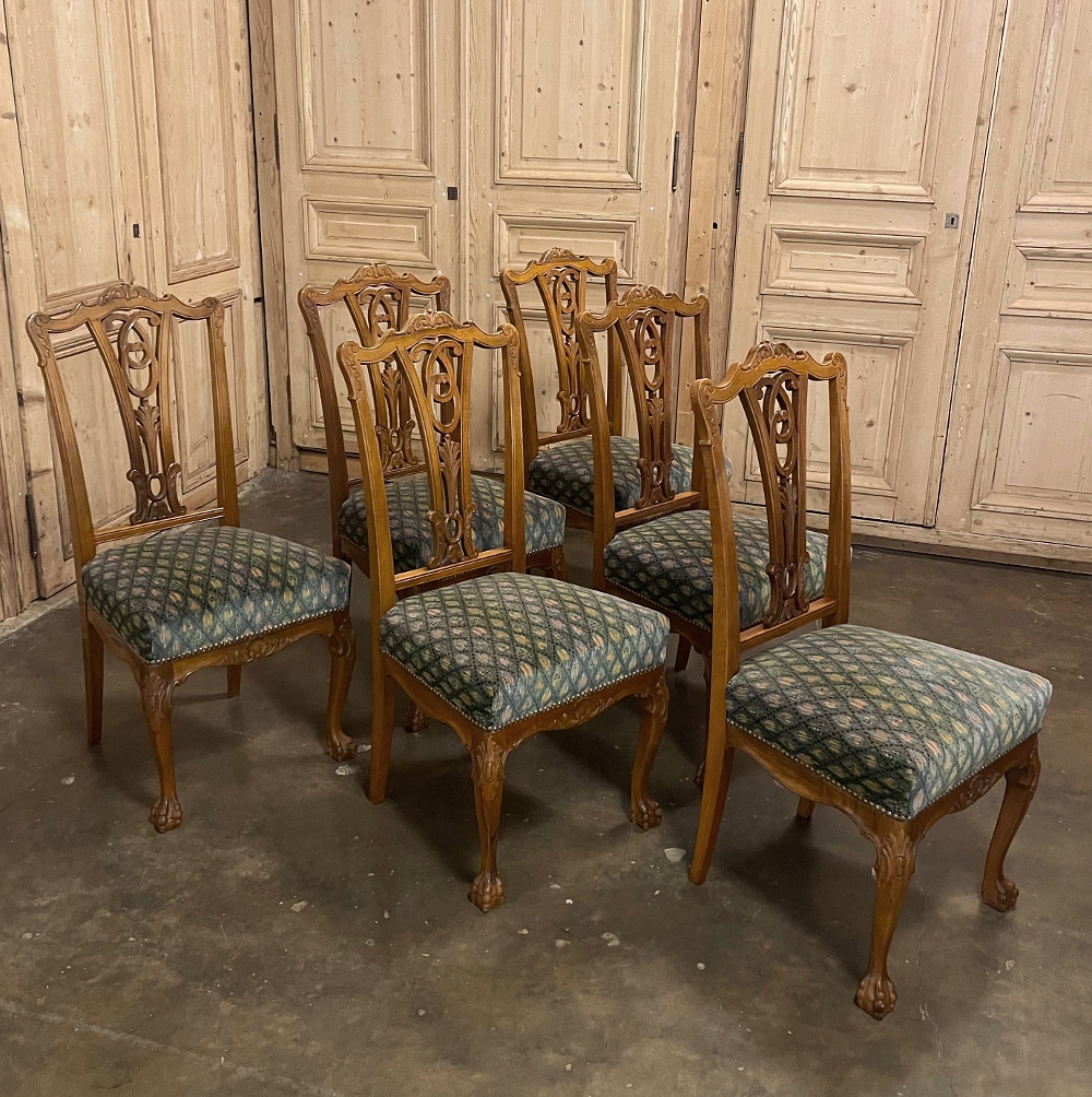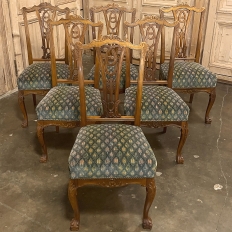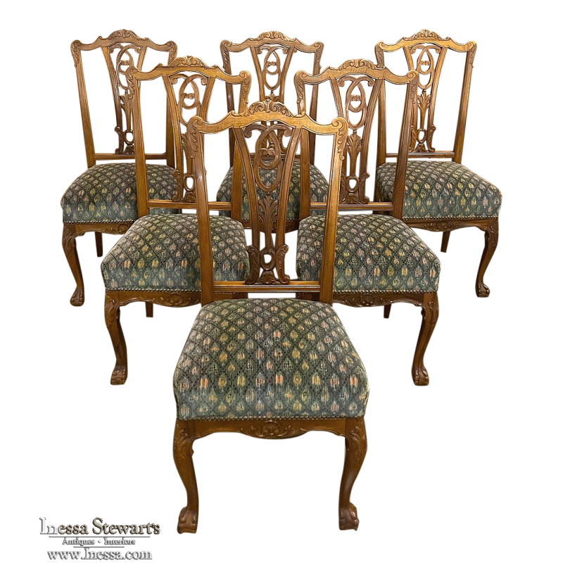 Set of 6 Vintage English Chippendale Mahogany Dining Chairs will add stylish flair to your dining experience, while creating visual interest due to the sheer natural beauty of the carved wood frameworks! Multiple arched seatback crown presides over the fan-shaped seatback, centered with a scrolled splat. High quality damascene fabric seats are generously sized and quite comfortable, and are supported by beautifully carved aprons and scrolled legs with talon & ball feet, with carvings depicting shell and foliate motifs.