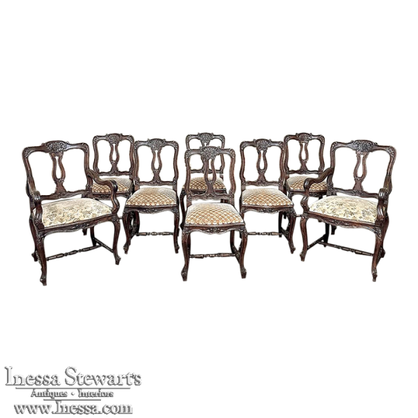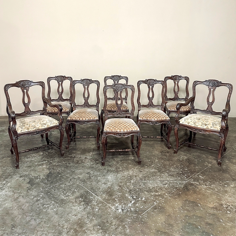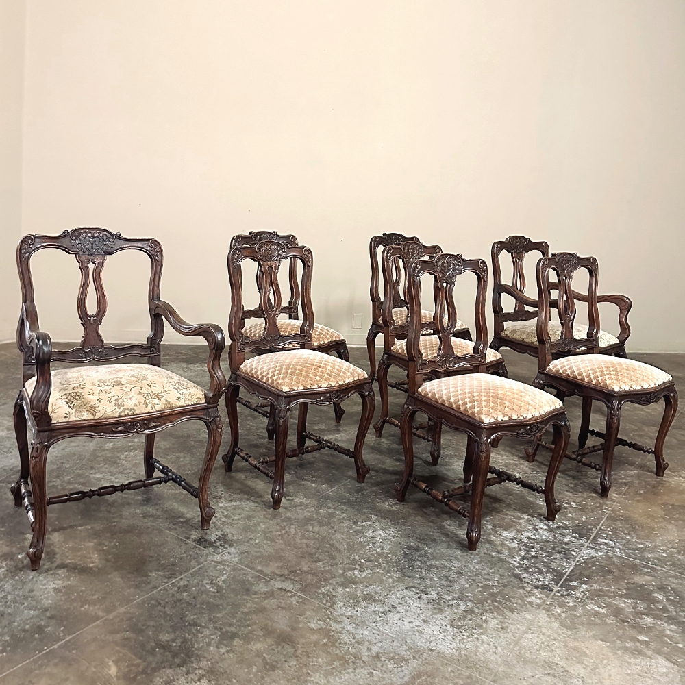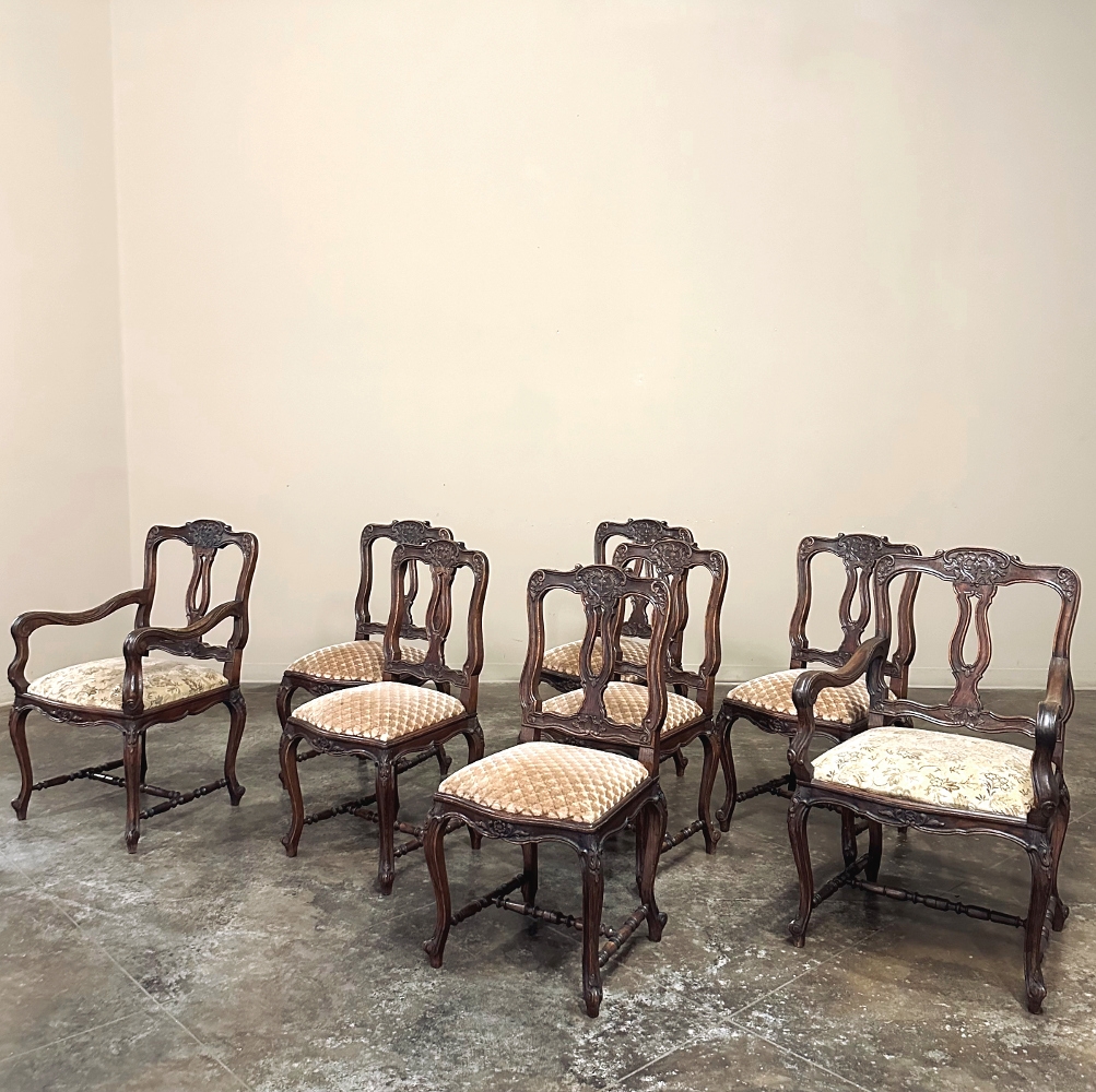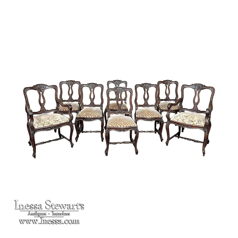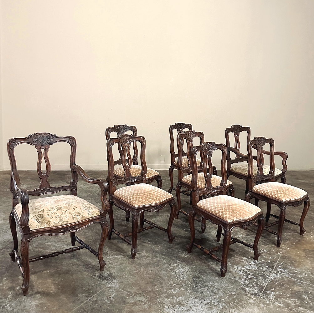 Set of 8 Antique Country French Upholstered Dining Chairs includes 2 Armchairs feature amazingly artistic contours that create a timeless, naturalistic presence. All the chairs feature intricately detailed carvings depicting stylized shell, floral and foliate motifs, appearing from the seatback crowns to the escargot foot tips. Luxurious pattern velvet upholstery is in very good condition, ready to provide comfort during your dining experience3. Turned "H" stretchers connect the legs below to add strength and longevity to the design. The armchairs differ in their slightly larger size and of course, amazingly contoured armrests and supports.