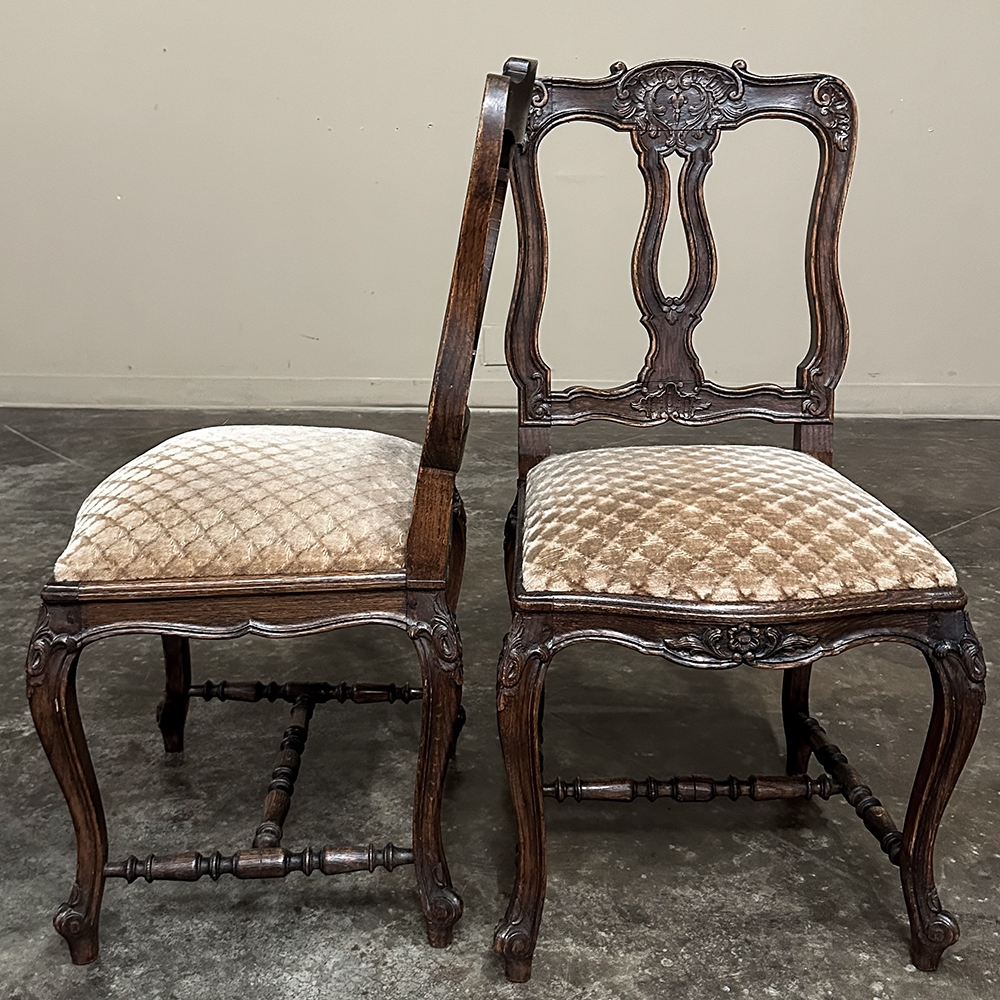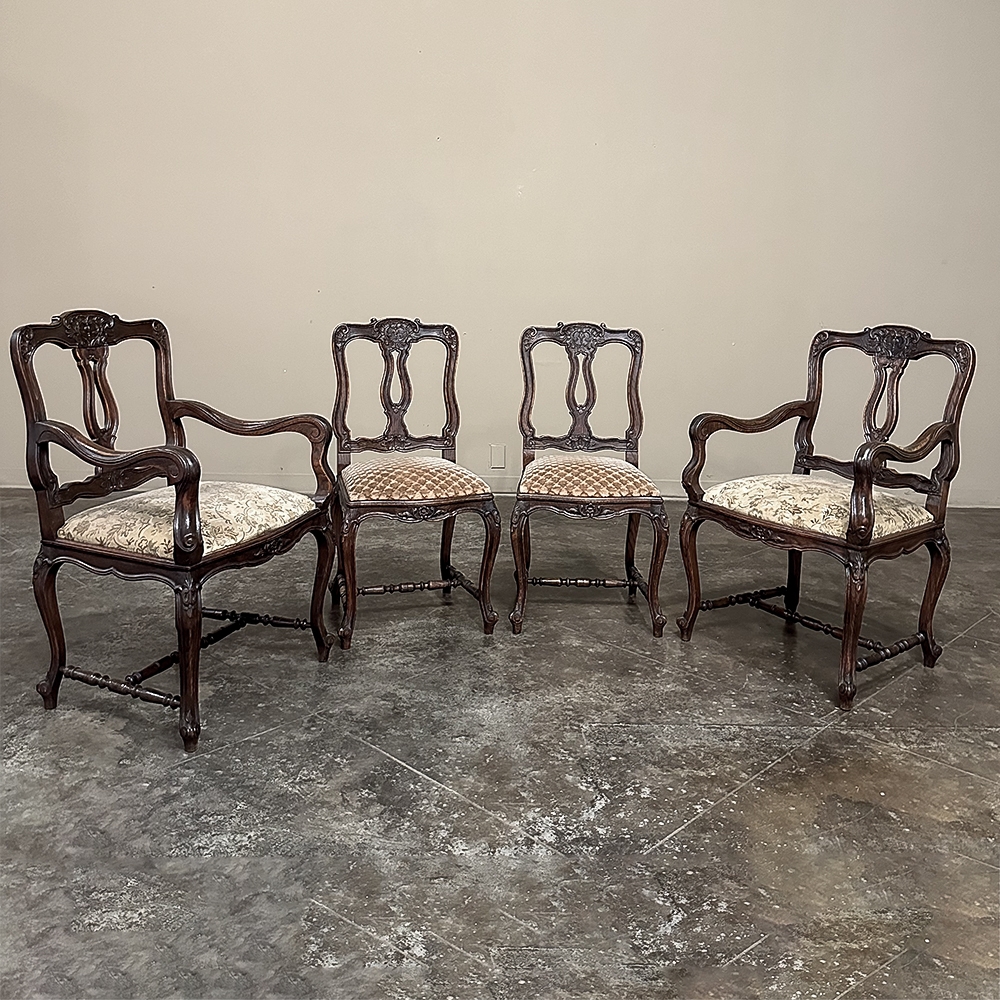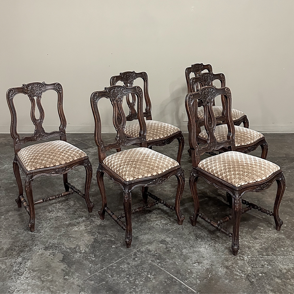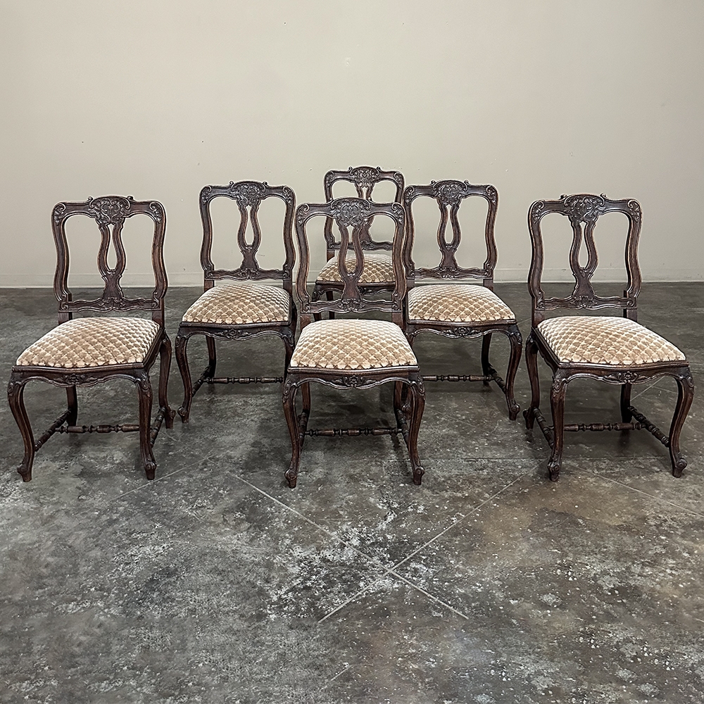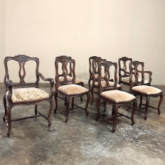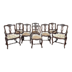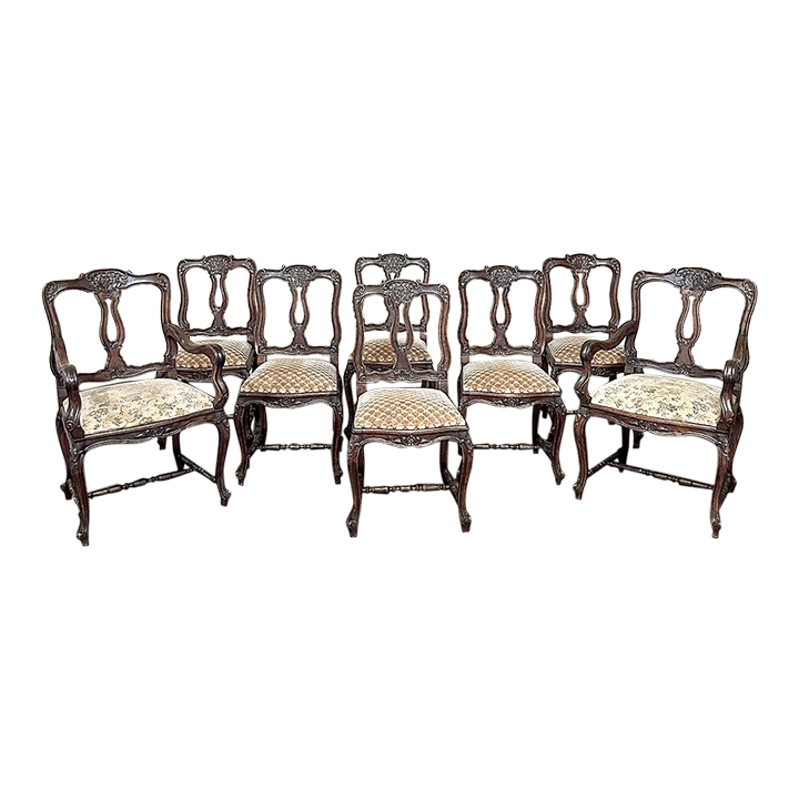 Set of 8 Antique Country French Upholstered Dining Chairs includes 2 Armchairs feature amazingly artistic contours that create a timeless, naturalistic presence. All the chairs feature intricately detailed carvings depicting stylized shell, floral and foliate motifs, appearing from the seatback crowns to the escargot foot tips. Luxurious pattern velvet upholstery is in very good condition, ready to provide comfort during your dining experience3. Turned "H" stretchers connect the legs below to add strength and longevity to the design. The armchairs differ in their slightly larger size and of course, amazingly contoured armrests and supports.