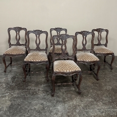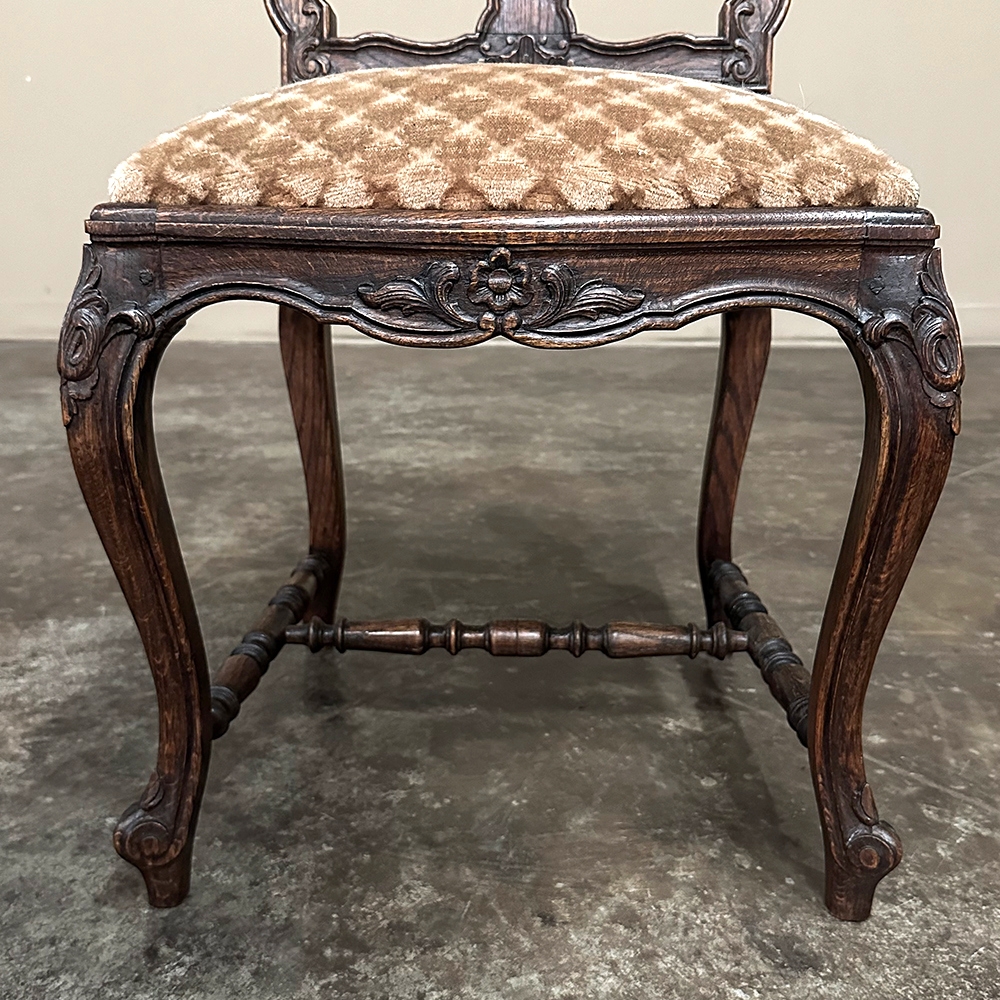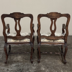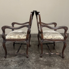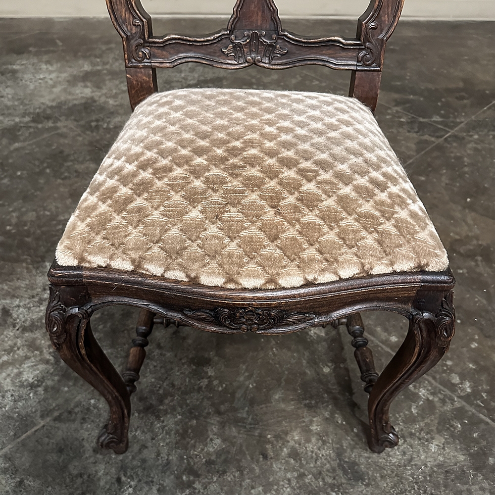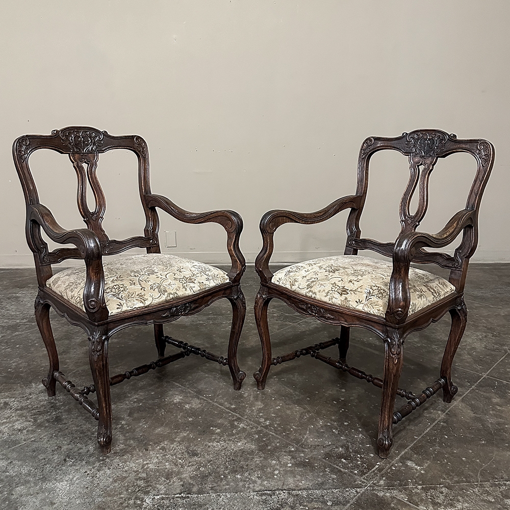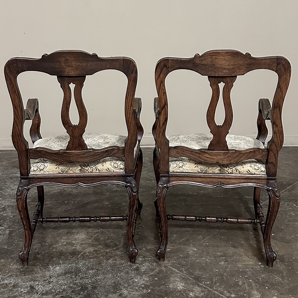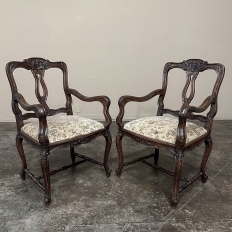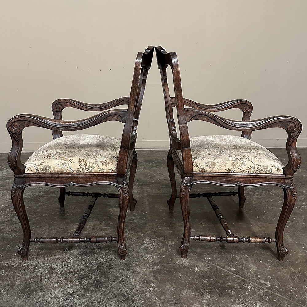 Set of 8 Antique Country French Upholstered Dining Chairs includes 2 Armchairs feature amazingly artistic contours that create a timeless, naturalistic presence. All the chairs feature intricately detailed carvings depicting stylized shell, floral and foliate motifs, appearing from the seatback crowns to the escargot foot tips. Luxurious pattern velvet upholstery is in very good condition, ready to provide comfort during your dining experience3. Turned "H" stretchers connect the legs below to add strength and longevity to the design. The armchairs differ in their slightly larger size and of course, amazingly contoured armrests and supports.