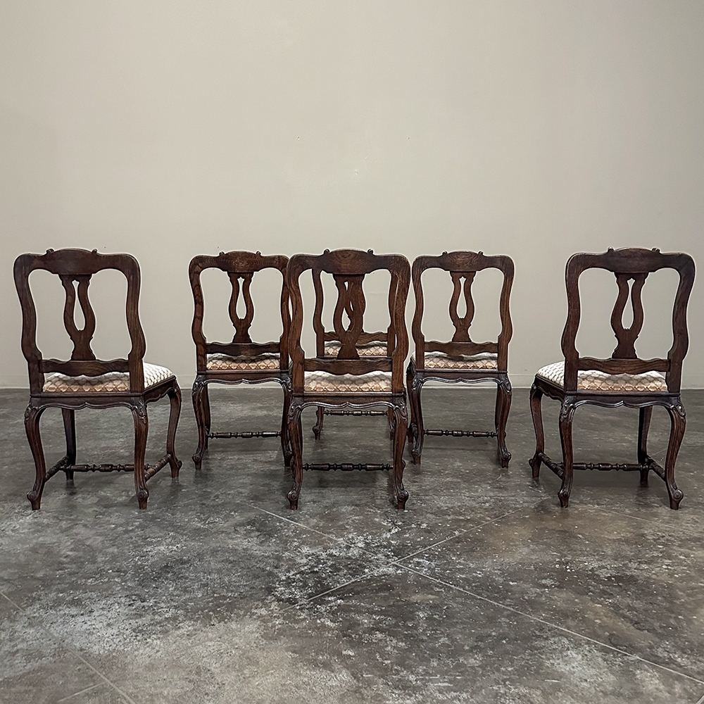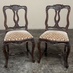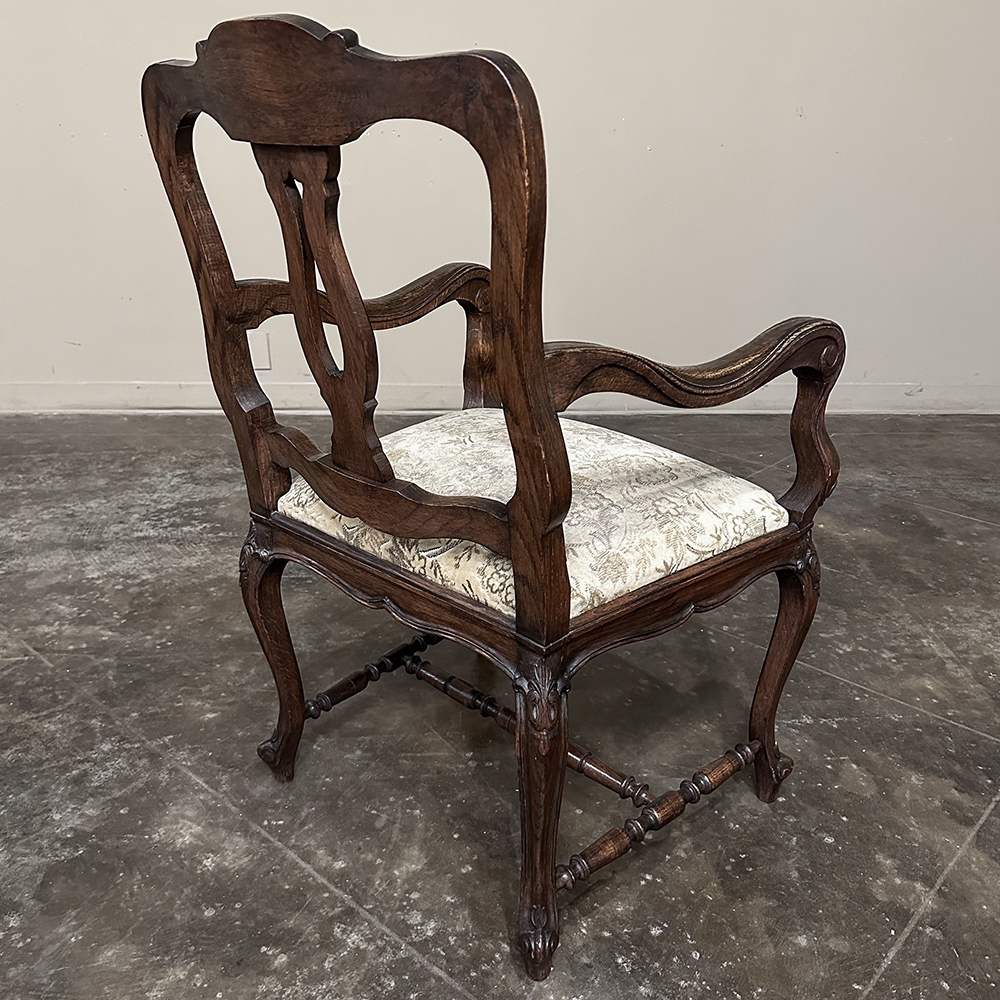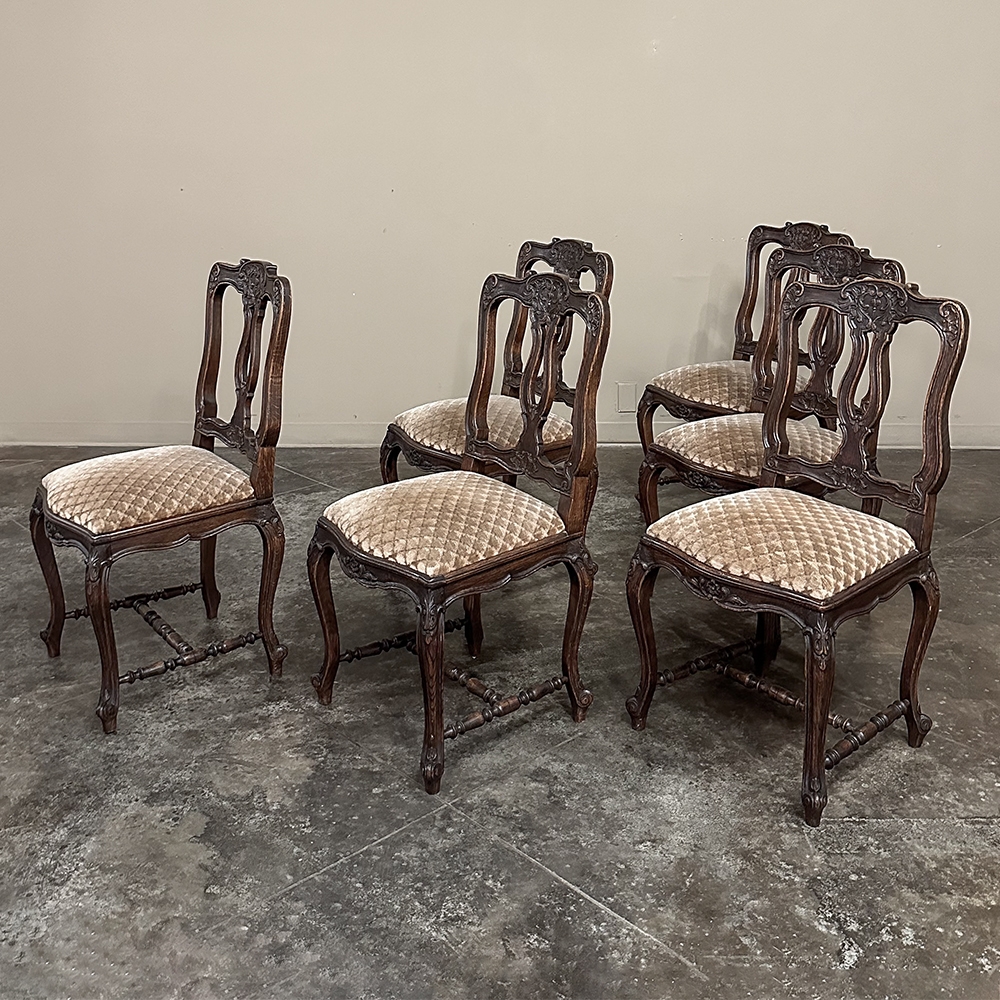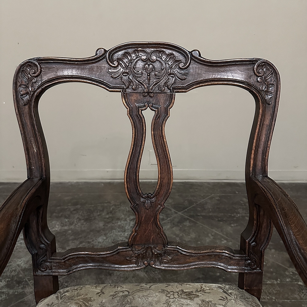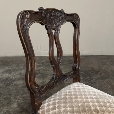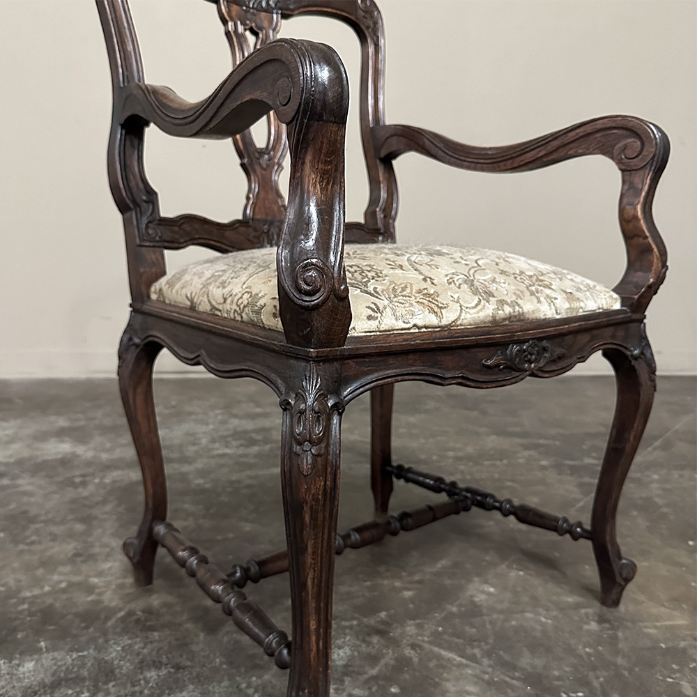 Set of 8 Antique Country French Upholstered Dining Chairs includes 2 Armchairs feature amazingly artistic contours that create a timeless, naturalistic presence. All the chairs feature intricately detailed carvings depicting stylized shell, floral and foliate motifs, appearing from the seatback crowns to the escargot foot tips. Luxurious pattern velvet upholstery is in very good condition, ready to provide comfort during your dining experience3. Turned "H" stretchers connect the legs below to add strength and longevity to the design. The armchairs differ in their slightly larger size and of course, amazingly contoured armrests and supports.