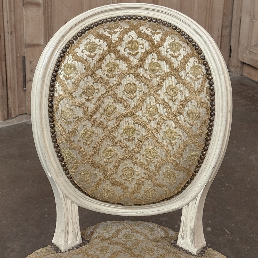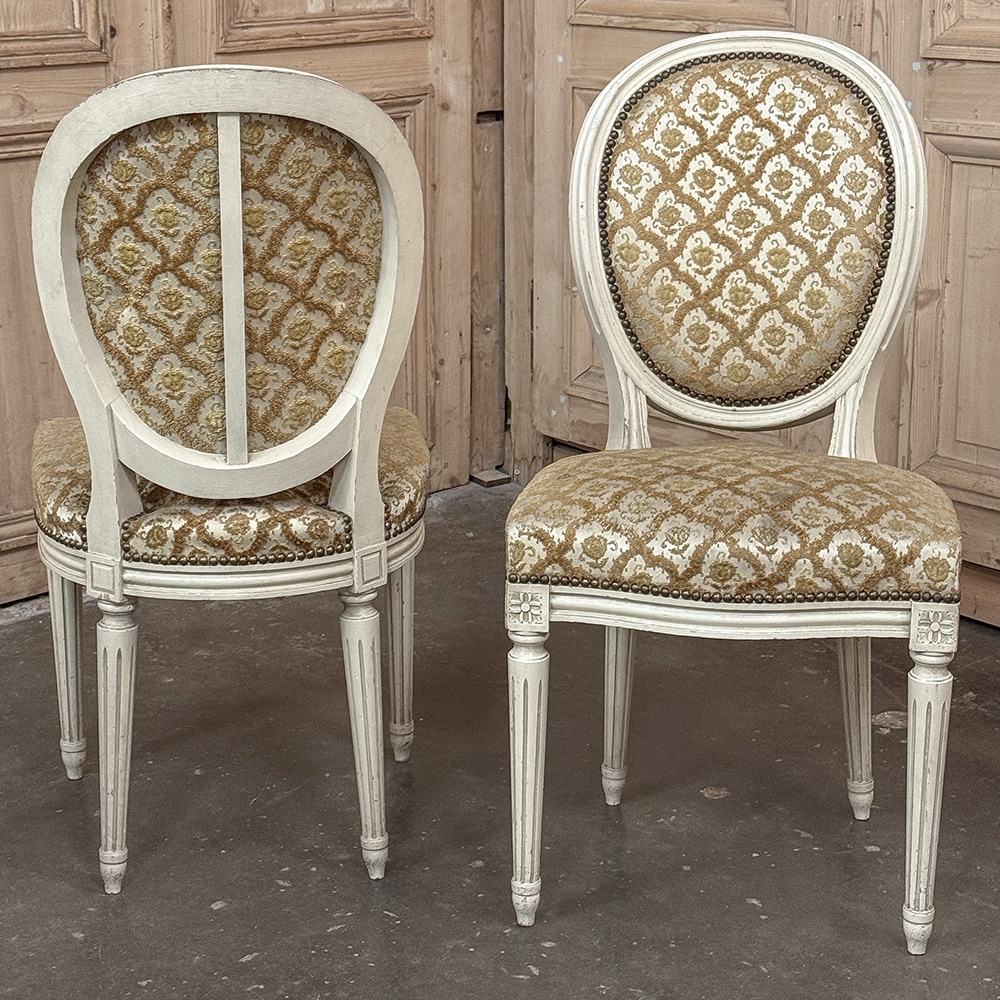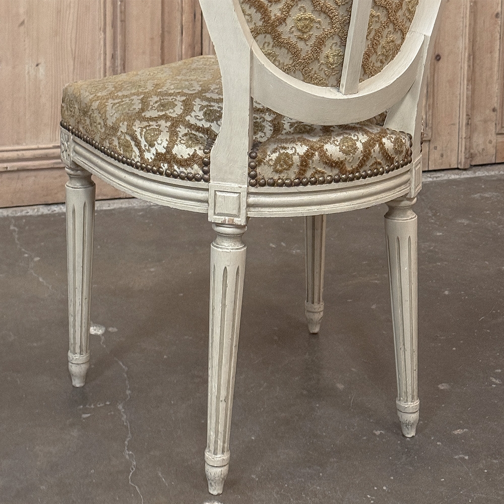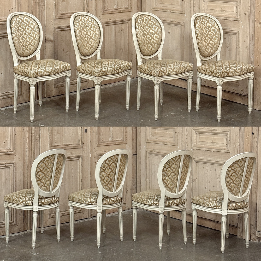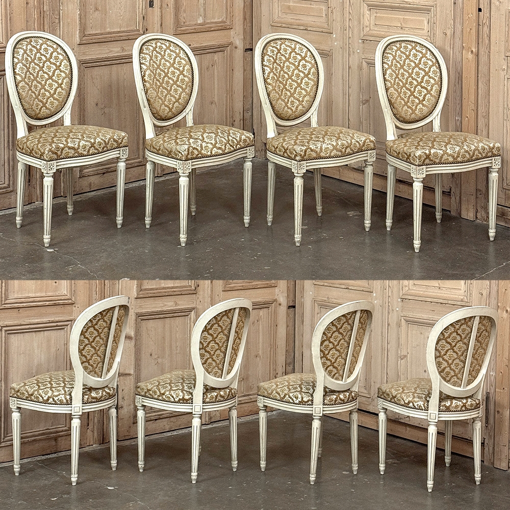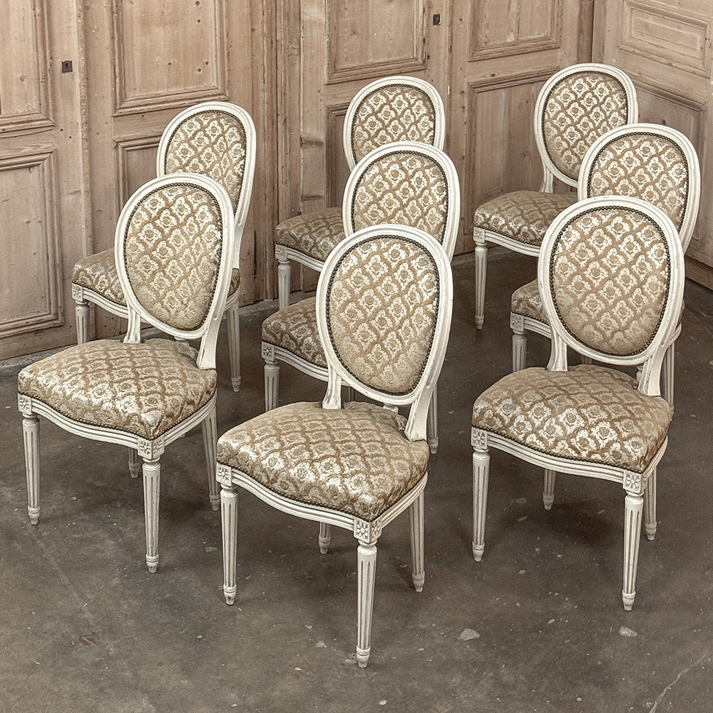 Set of 8 Antique French Louis XVI Painted Dining Chairs with Damascene Upholstery will add a certain sophisticated grace and elegance to your dining experience. Hand-crafted from select hardwoods, then carefully sculpted in the neoclassical style that so enamored King Louis XVI, each boasts contoured oval seat backs and ergonomically shaped seats lavishly upholstered in a luxurious damascene fabric that is simultaneously visually striking and neutral in color palette. Rosettes and flutes adorn the frames and legs, all highlighted by the slightly distressed painted finish that adds a light and airy effect. Plus, the set of eight gives you two more chairs than the typical six.