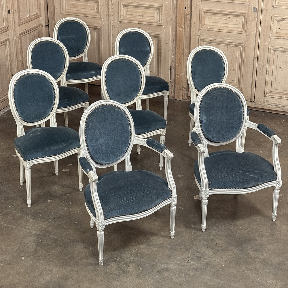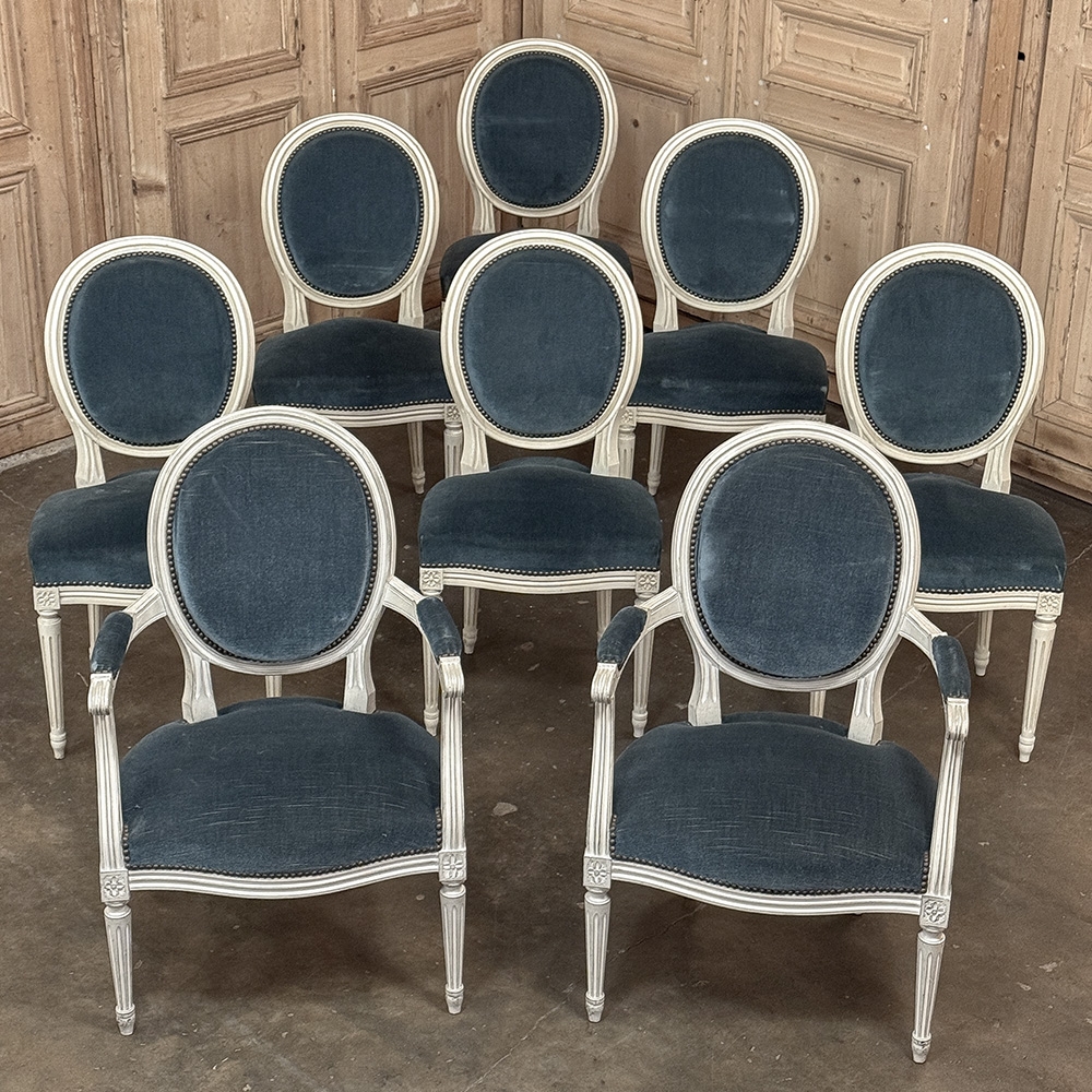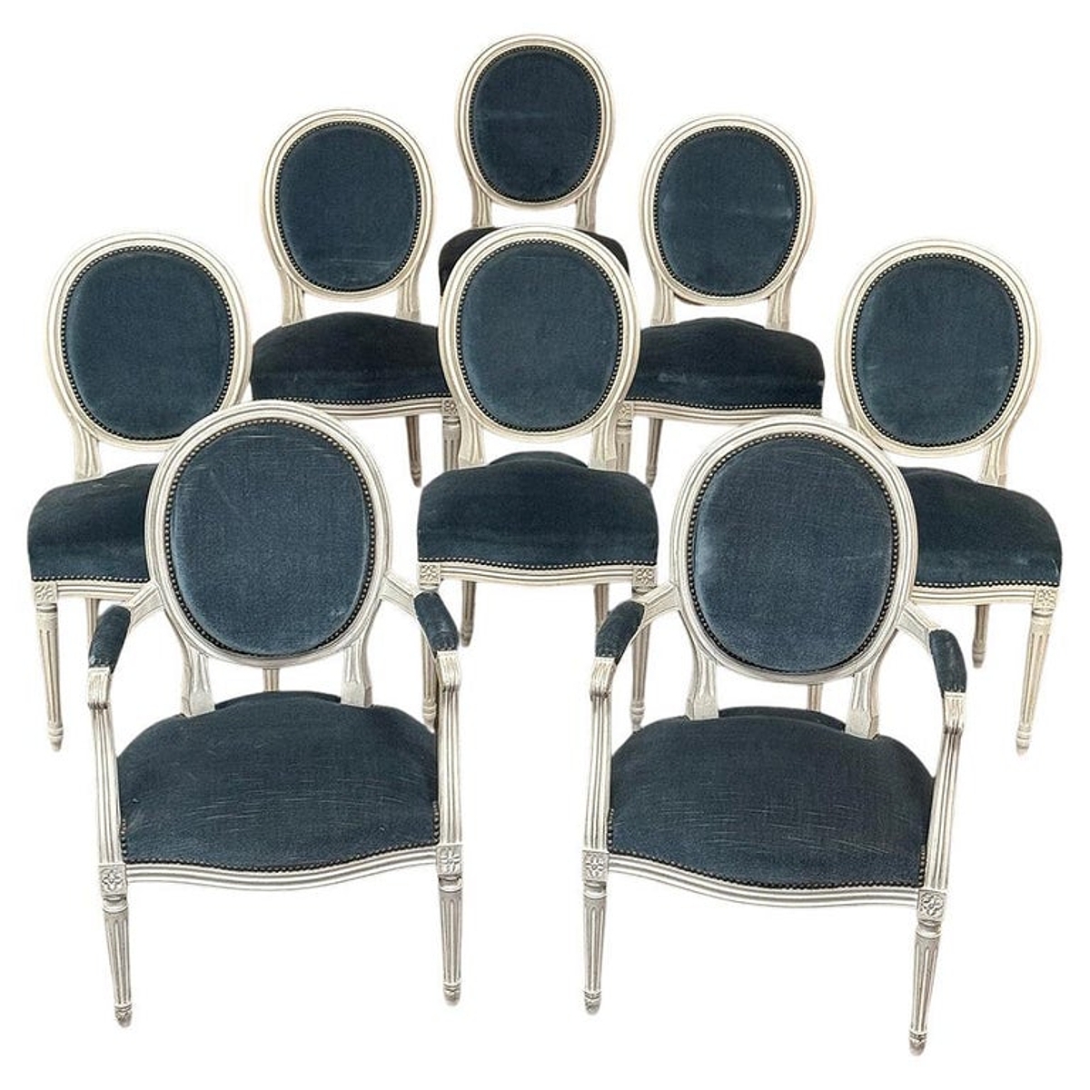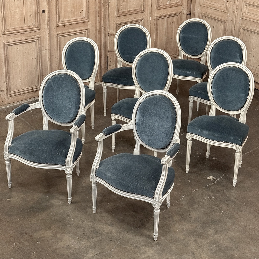 Set of 8 French Louis XVI Painted Dining Chairs includes 2 Armchairs will and classic style, color and comfort to your dining experience. Crafted from fine hardwoods, each features a contoured, oval seat back that wraps your torso in comfort, while the upholstered seats are nicely cushioned, with all covered in mohair that has seen some use, but is still serviceable, and in a rich dark cornflower blue. The frames are nicely molded above and below, but the lower parts of the chairs feature rosette accents and tapered & fluted legs. The set includes two armchairs, with wraparound armrests nicely padded and subtly carved, with the painted finish having achieved a lovely patina over the decades providing the perfect finishing touch!