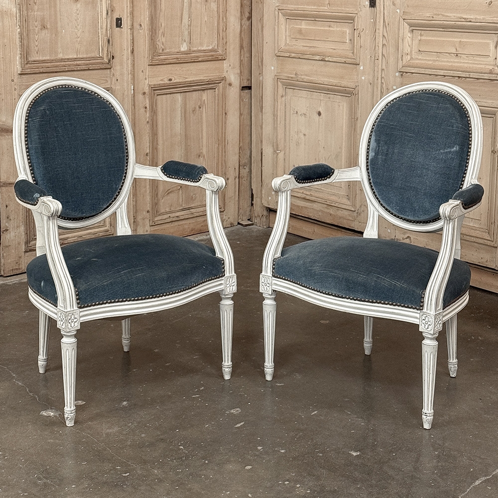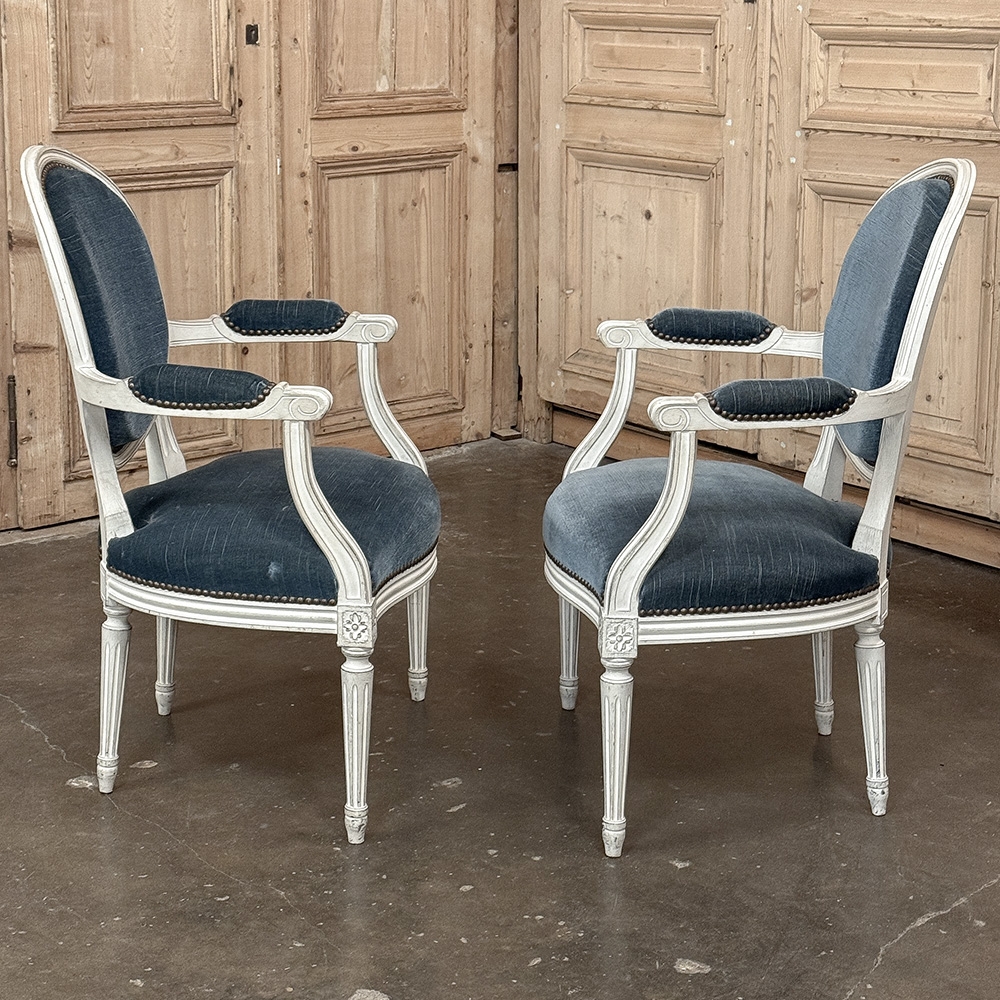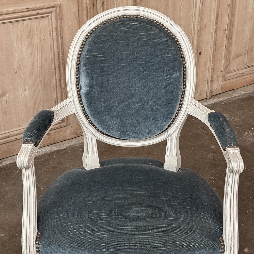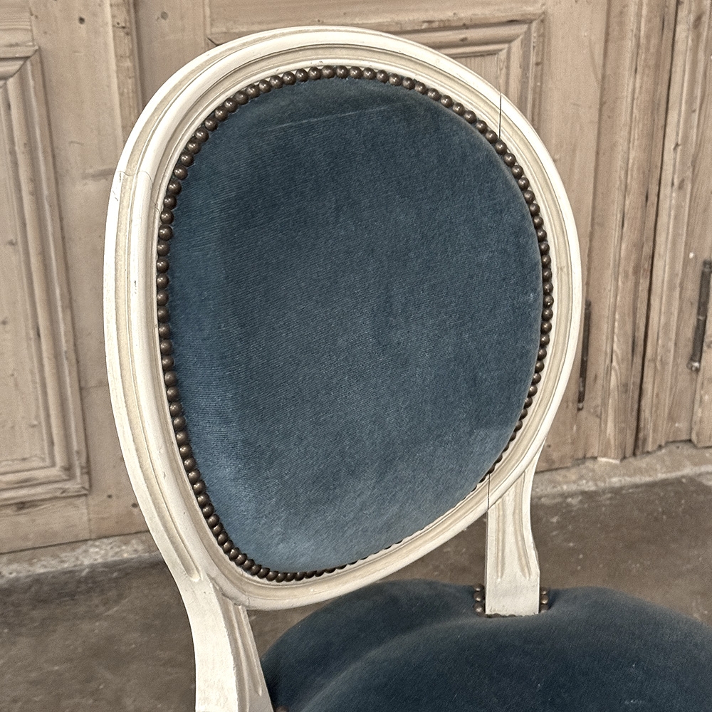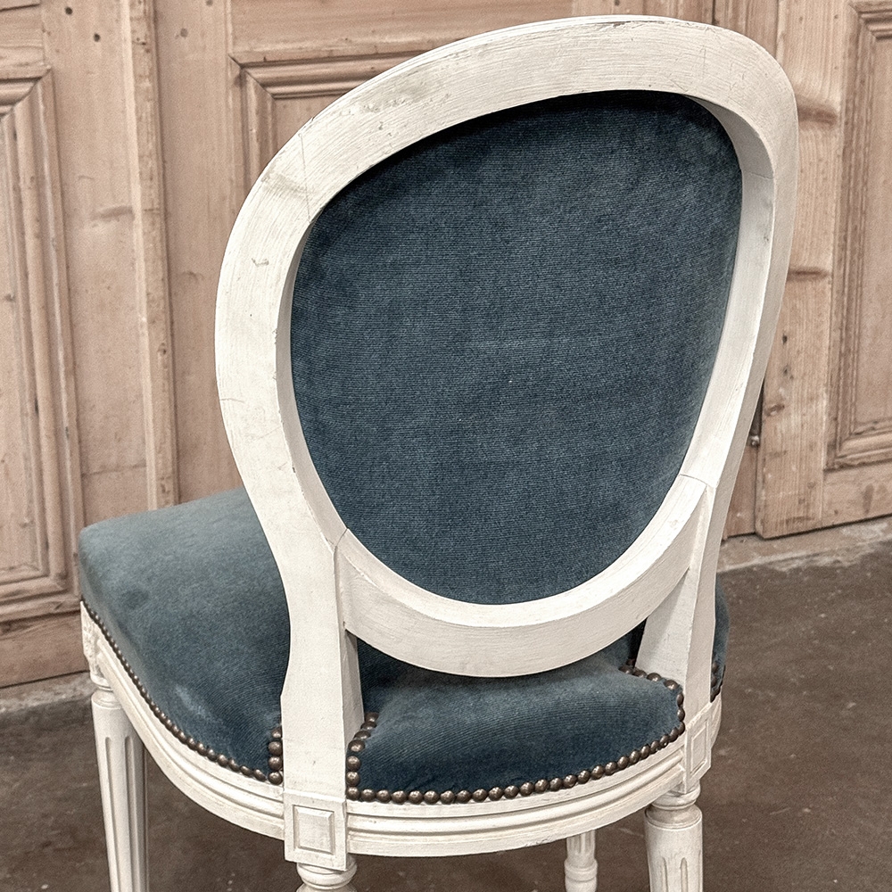 Set of 8 French Louis XVI Painted Dining Chairs includes 2 Armchairs will and classic style, color and comfort to your dining experience. Crafted from fine hardwoods, each features a contoured, oval seat back that wraps your torso in comfort, while the upholstered seats are nicely cushioned, with all covered in mohair that has seen some use, but is still serviceable, and in a rich dark cornflower blue. The frames are nicely molded above and below, but the lower parts of the chairs feature rosette accents and tapered & fluted legs. The set includes two armchairs, with wraparound armrests nicely padded and subtly carved, with the painted finish having achieved a lovely patina over the decades providing the perfect finishing touch!