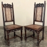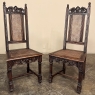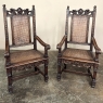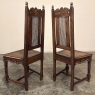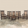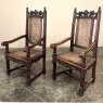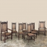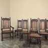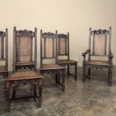 Set of 8 Italian Neoclassical Walnut Caned Dining Chairs includes 2 Armchairs is the perfect solution for elegant yet comfortable dining! The cane seats and seat backs allow airflow and a little flex, and can be supplemented with seat cushions for longevity and color coordination. The chair frames are crafted from solid walnut, and feature classic architecture inspired by the ancient Roman and Greeks, and include seatback crowns sculpted with cornucopias, shells, flowers and foliates mirrored by the aprons just under each seat. Charming cherubs appear at the tops of each seat back post, for a total of 16 individual sculptures. Greek coin bordering, acanthus fronds on the armrests, and rosettes adorning the columnar legs complete the look.