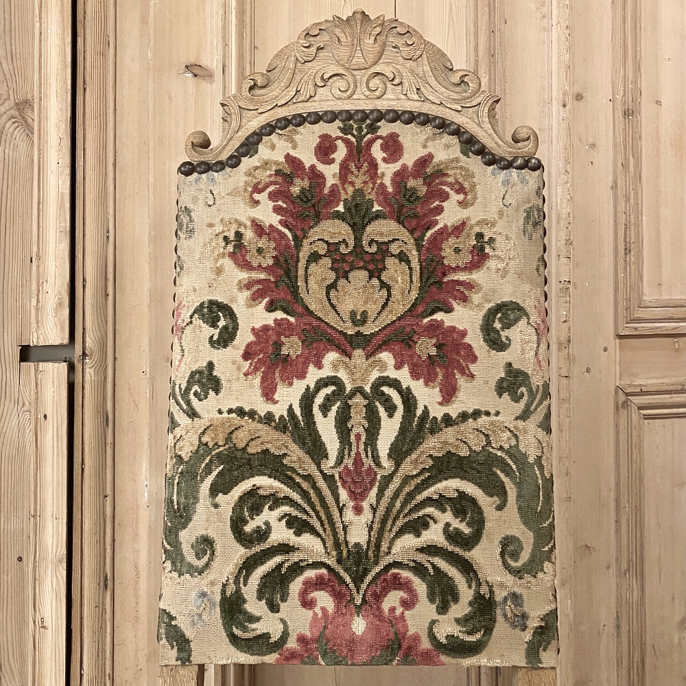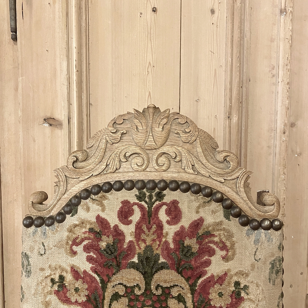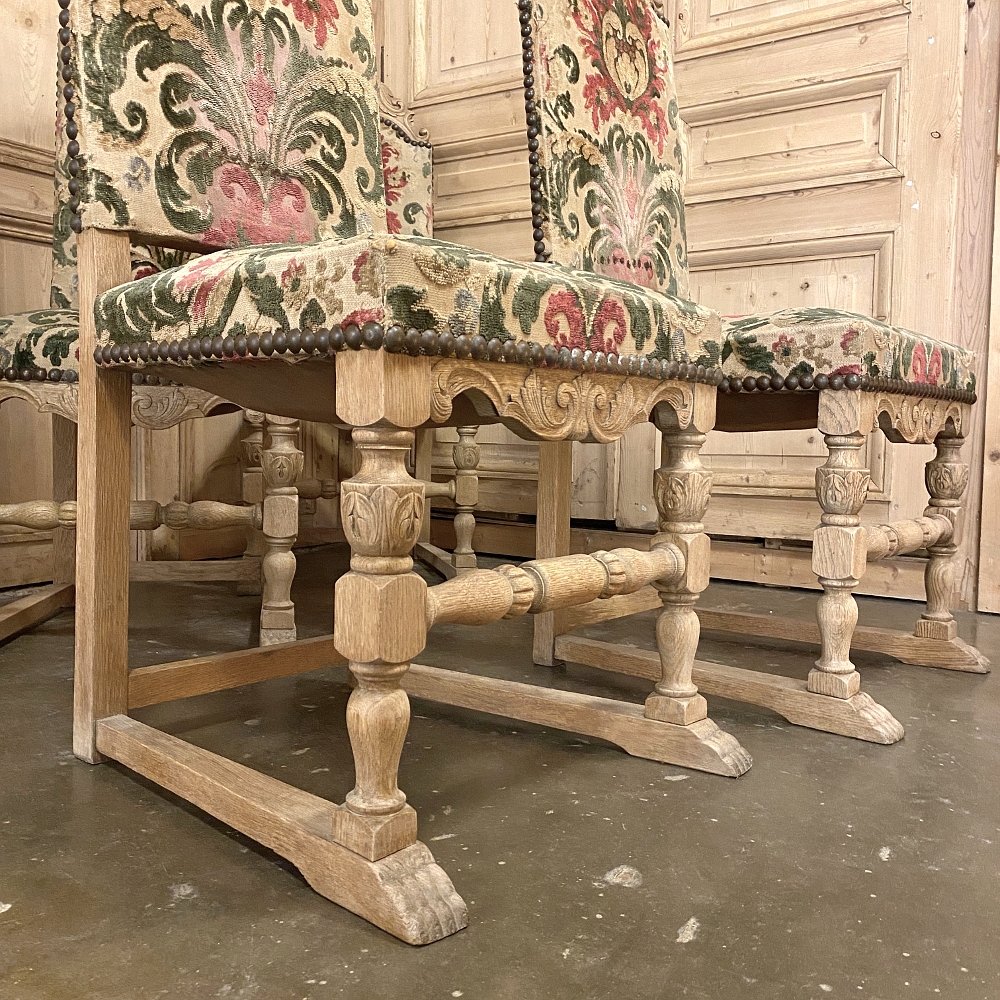 Originally stained and later stripped by our staff, the frames now reveal the natural beauty and texture of the wood with a lighter, more relaxed finish that still honors the age and character of the chairs. The upholstery is original to the set and displays a foliate design in soft tones of rose, green, and cream. It remains in serviceable condition, though reupholstery may eventually be desired.
