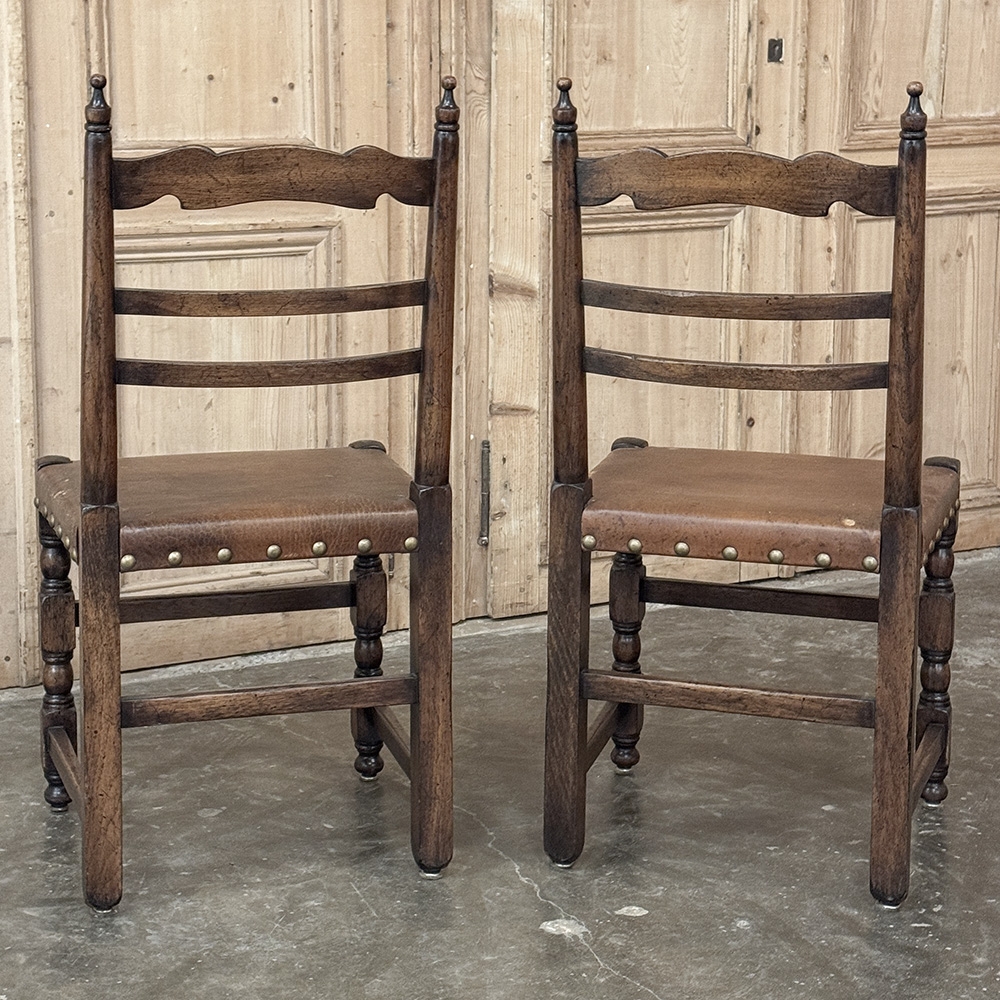 Each chair rests on classic turned legs joined by robust stretchers, reflecting the honest construction and time-honored joinery long associated with provincial French furniture. The shaped crest rails introduce a gentle curve to the backs, softening the strong lines while preserving their rustic character.