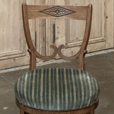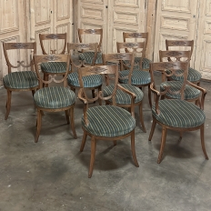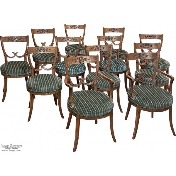 Set of Twelve 18th Century Swedish Gustavian Dining Chairs includes 2 Armchairs were built to grace an elegant mansion in Sweden, now ready to add style, flair and timeless elegance to your own dining experience!  The shield-back seats all feature a diamond rosette with beaded framing, and french bordering accenting the shield forms, but no other carved embellishment.  That doesn't mean there's no style flair, though, as the frameworks are the epitome of elegance, with gently splayed legs and curved seats designed for maximum comfort and stability.  Note the pegged mortise & tenon construction.  Recently upholstered with striped mohair and brass tacks, they're ready for yet another generation's enjoyment!