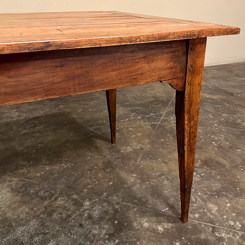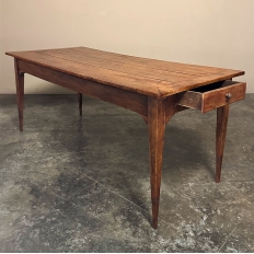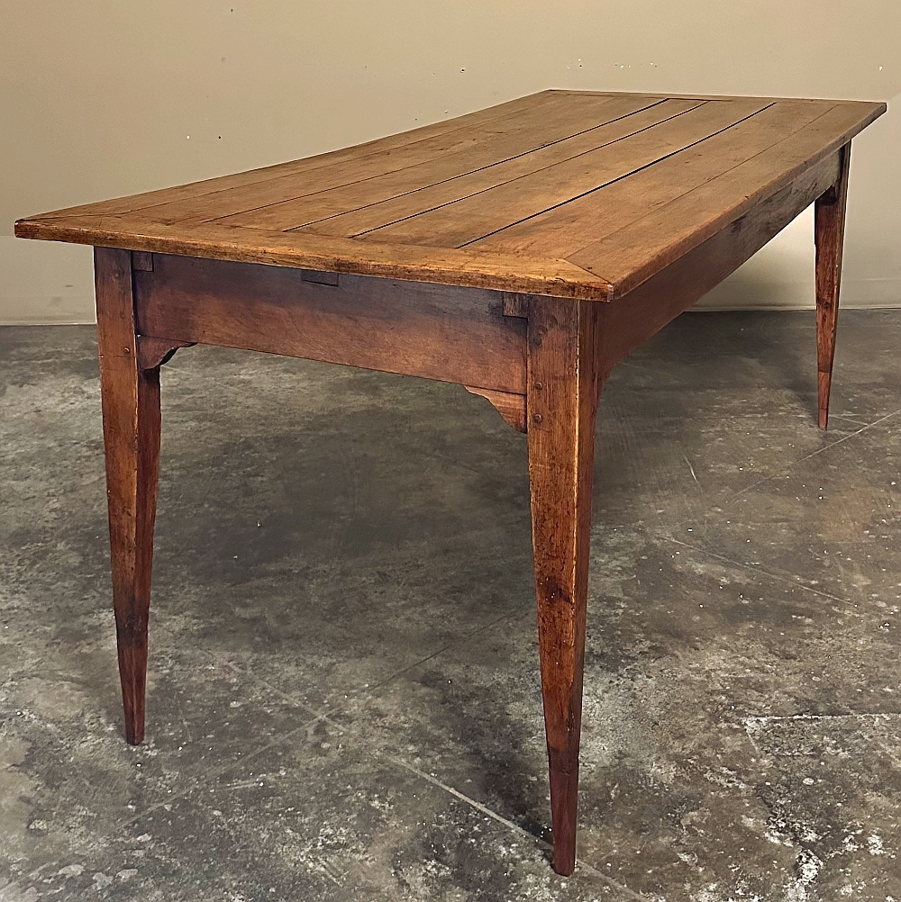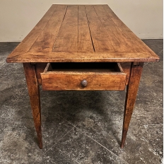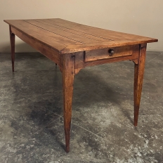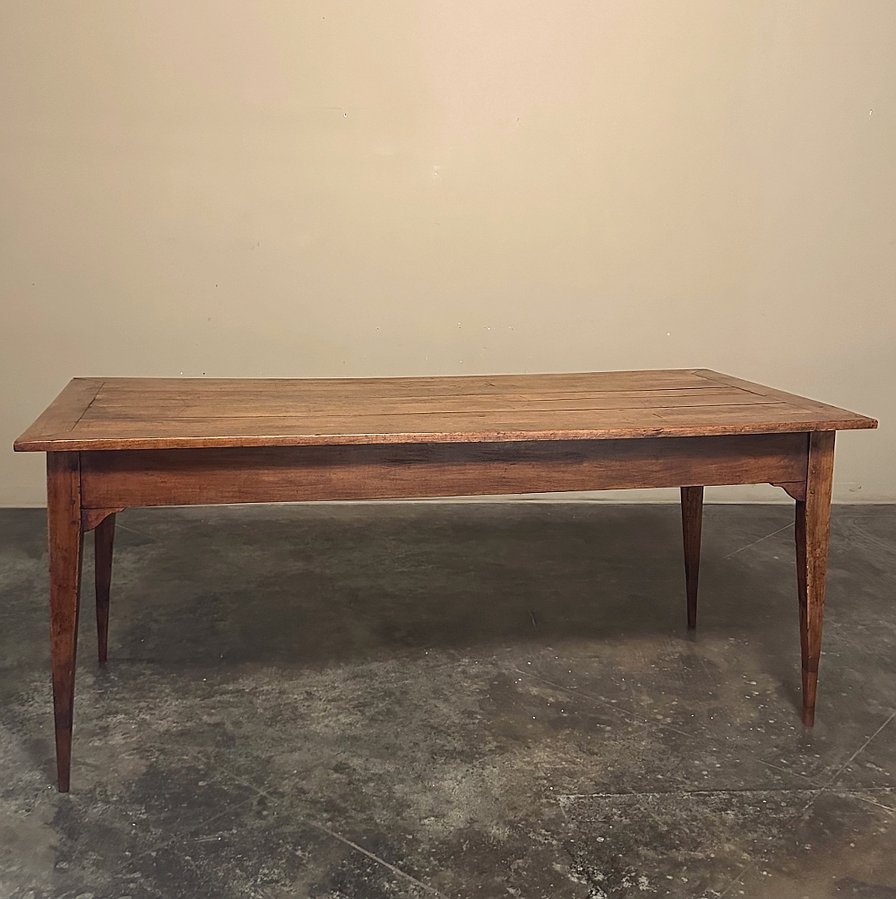 19th Century Country French Fruitwood Farm Table ~ Dining Table will comfortably seat six to eight, and was crafted entirely by hand from indigenous fruitwoods like cherry and apple. The solid plank top is supported by an apron all around connected to four tapered legs on each corner. The legs have been extended by our expert in-house staff to accommodate 21st century physiques. A drawer on one end was for storing napkins, carving knives or other utensils. Imagine all the stories this 175 year-old table has to tell, and those it has yet to tell in the future!