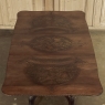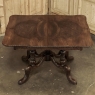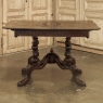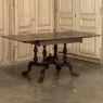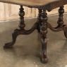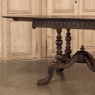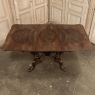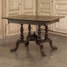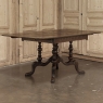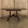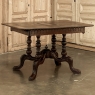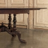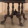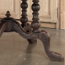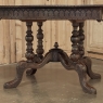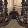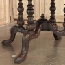 19th Century Dining Table by Horrix with Original Carved Leaf is yet another example of the superlative craftsmanship exhibited by the storied maker during the period. Set upon an unusual base with four turned pedestals atop a boldly scrolled four-legged structure, it features an apron carved on all four sides that conceals a pocket into which the single original carved leaf can be housed until needed. The legs are not only turned but tastefully carved, and the scrolled base features intricate carved detail as well, with the four legs converging at the center topped with a roundel and acorn finial. The carvings on the apron depict a repeating foliate design, foreshortened on the short side that contains the slot for the leaf. In a trademark feature, the table top itself is carved with three distinct motifs ~ one glorifying ripe pears on the tree, the other fully laden grapevines, while the leaf is carved with apples ready to be picked from the tree, all carved in incredible intaglio and bas relief style. Even the edge of the table has been carved with a stylized Greek coin pattern!
