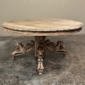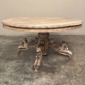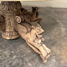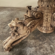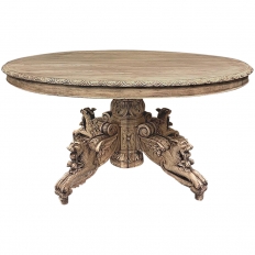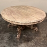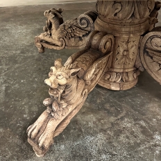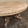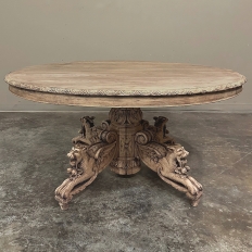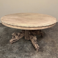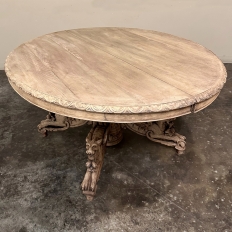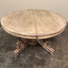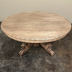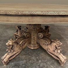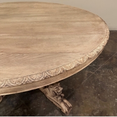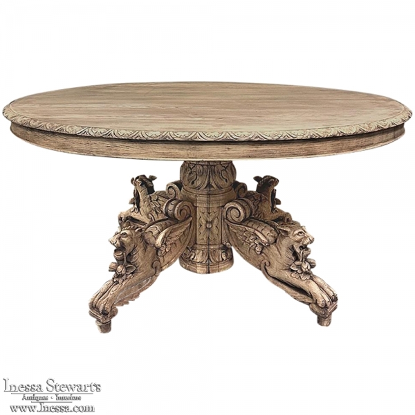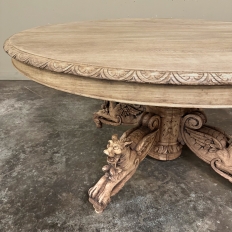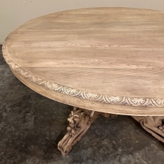19th Century French Renaissance Oval Center Table ~ Dining Table in Stripped Oak makes an unforgettable style statement while exuding a softened appearance thanks to our proprietary stripping process that leaves the natural color and patina of the century-old wood. The solid plank top is supported by a tailored, subtly edged apron all around, and the entire top is supported by a central pedestal carved with acanthus plumes and rosettes and fitted with four elaborately carved legs. The legs depict lions with the bounty of the earth spewing forth from their open mouths, transitioning to richly scrolled tip. The carving as well as the intrinsic beauty of the wood have all been wonderfully preserved for you and your family to enjoy for decades to come.