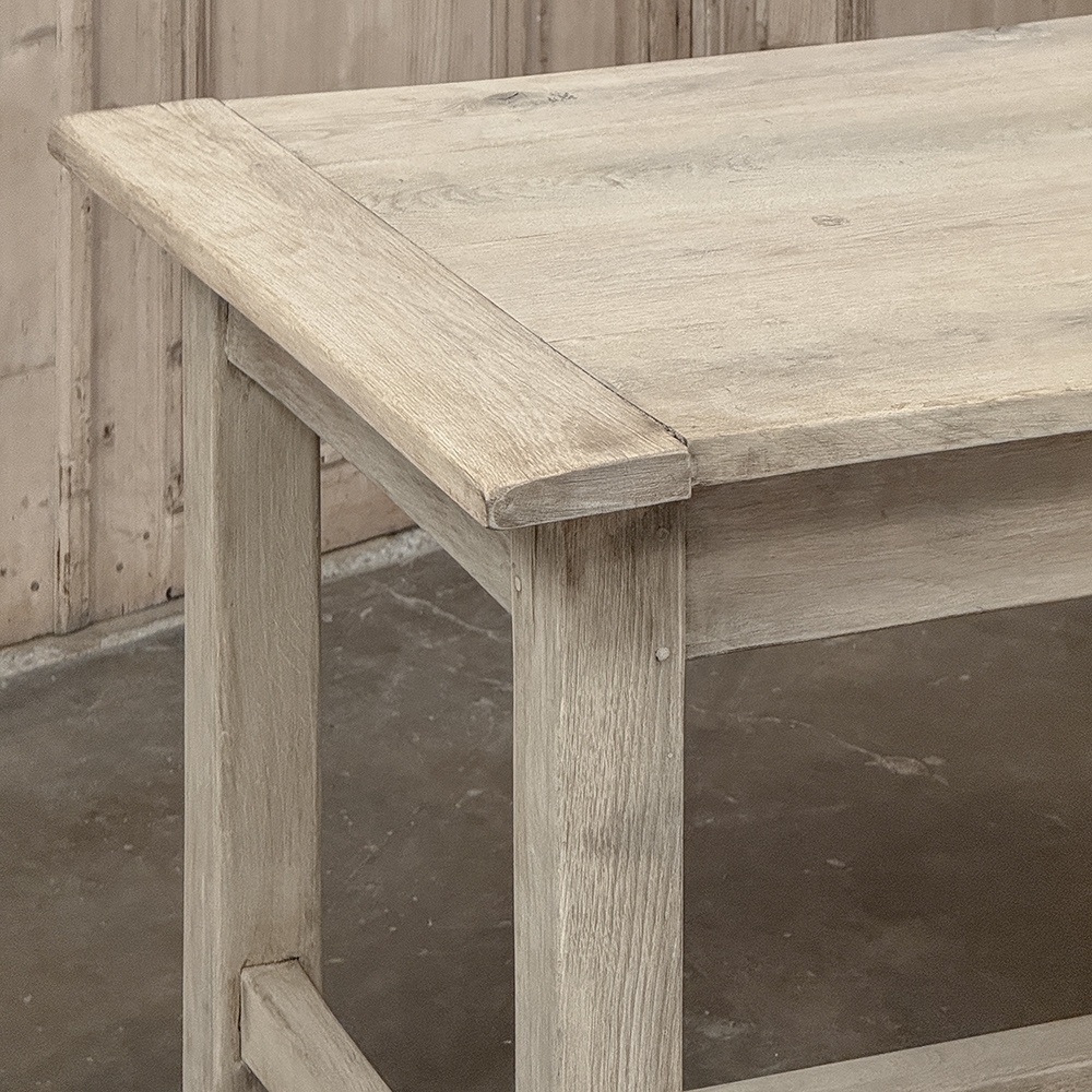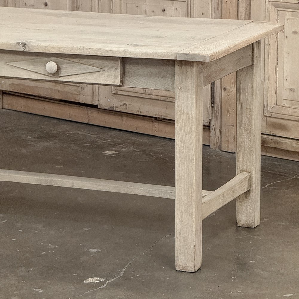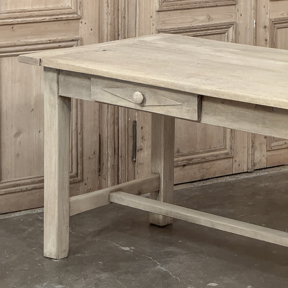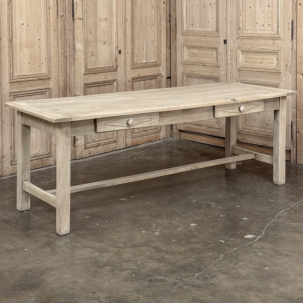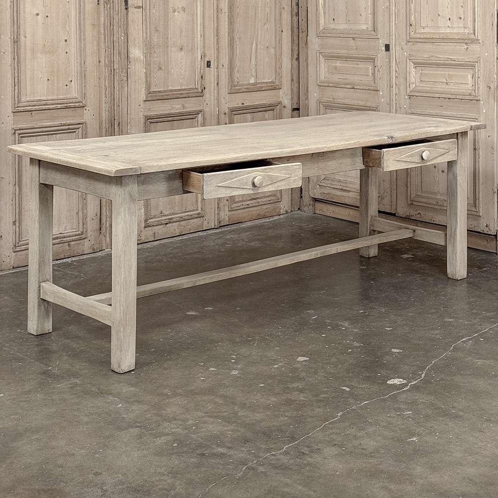 19th Century Rustic Table ~ Desk in Stripped Oak is a truly timeless design inspired by rural craftsmen who performed wonderful feats of furniture crafting using what are today considered primitive tools. Those craftsmen did have lots of beautiful seasoned old-growth oak with which to work, and used techniques handed down from generation to generation to produce works that literally last for generations. The solid plank top resists aging, and is supported by four sturdy posts held together by an "H" stretcher below and an apron above, all joined with mortise & tenons rendered by hand. The "H" stretcher design allows for maximum foot room, and two drawers fitted with turned wood knobs add a nice touch. Painstakingly stripped using our proprietary process that retains the patina and sheer natural beauty of the old wood, all performed by our expert in-house staff.