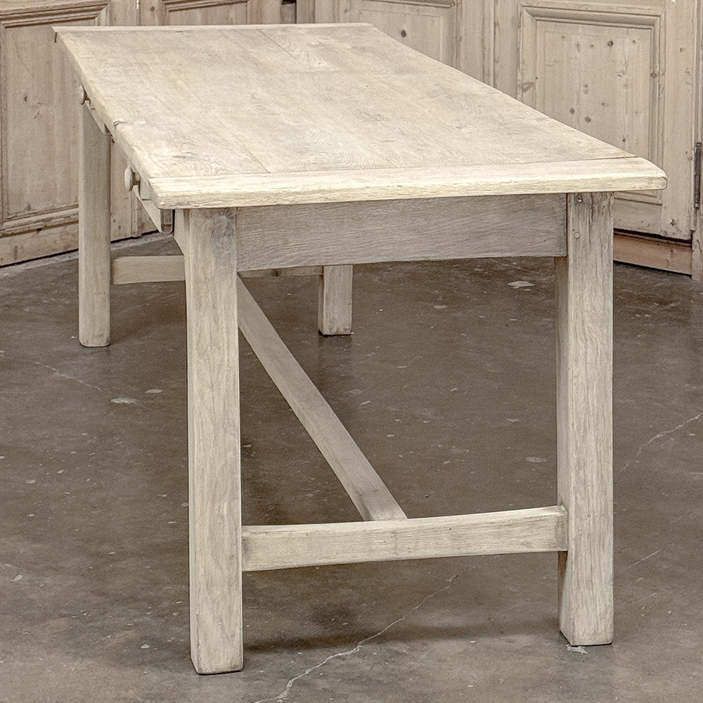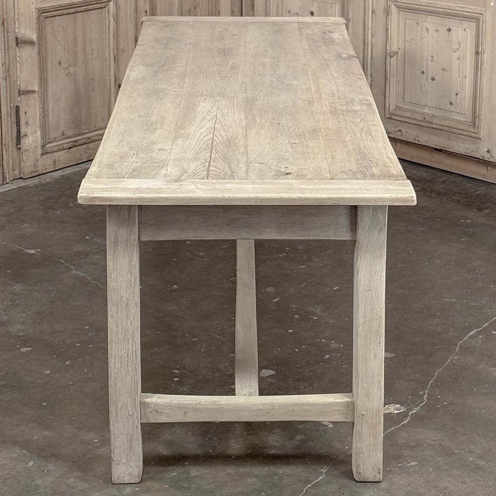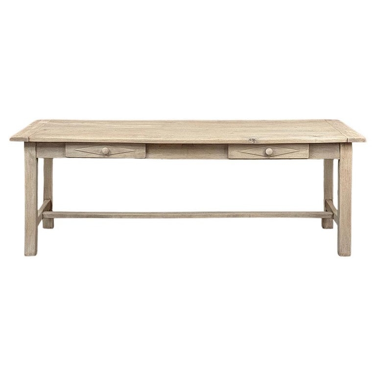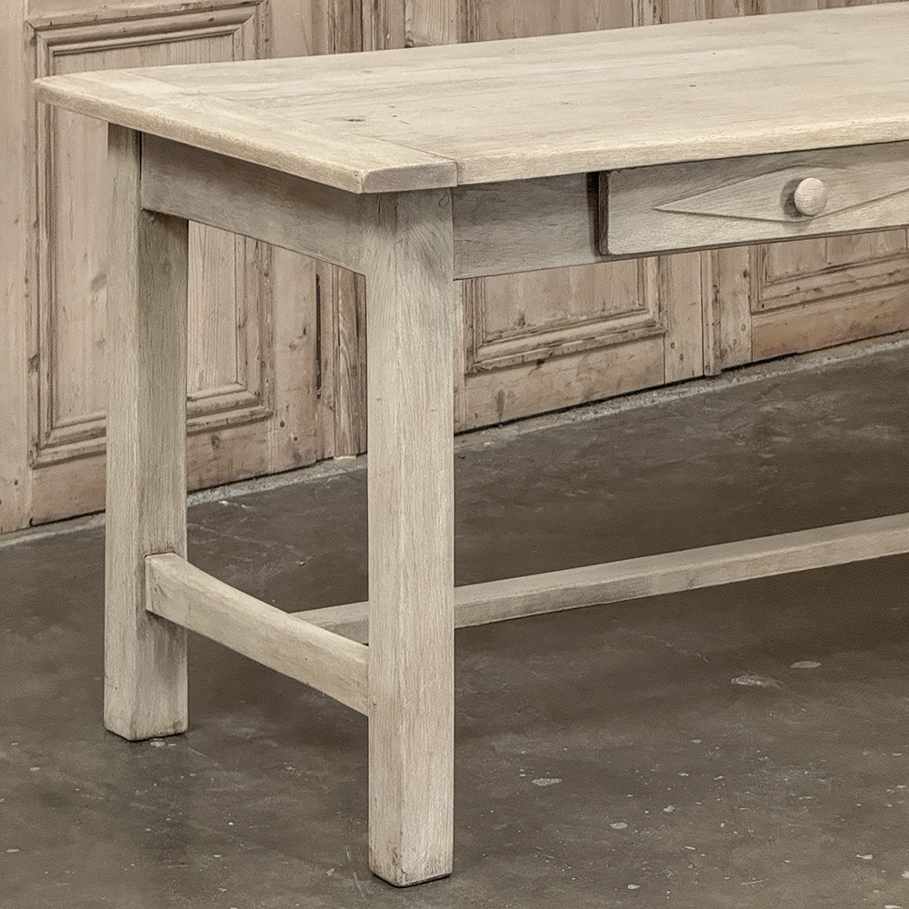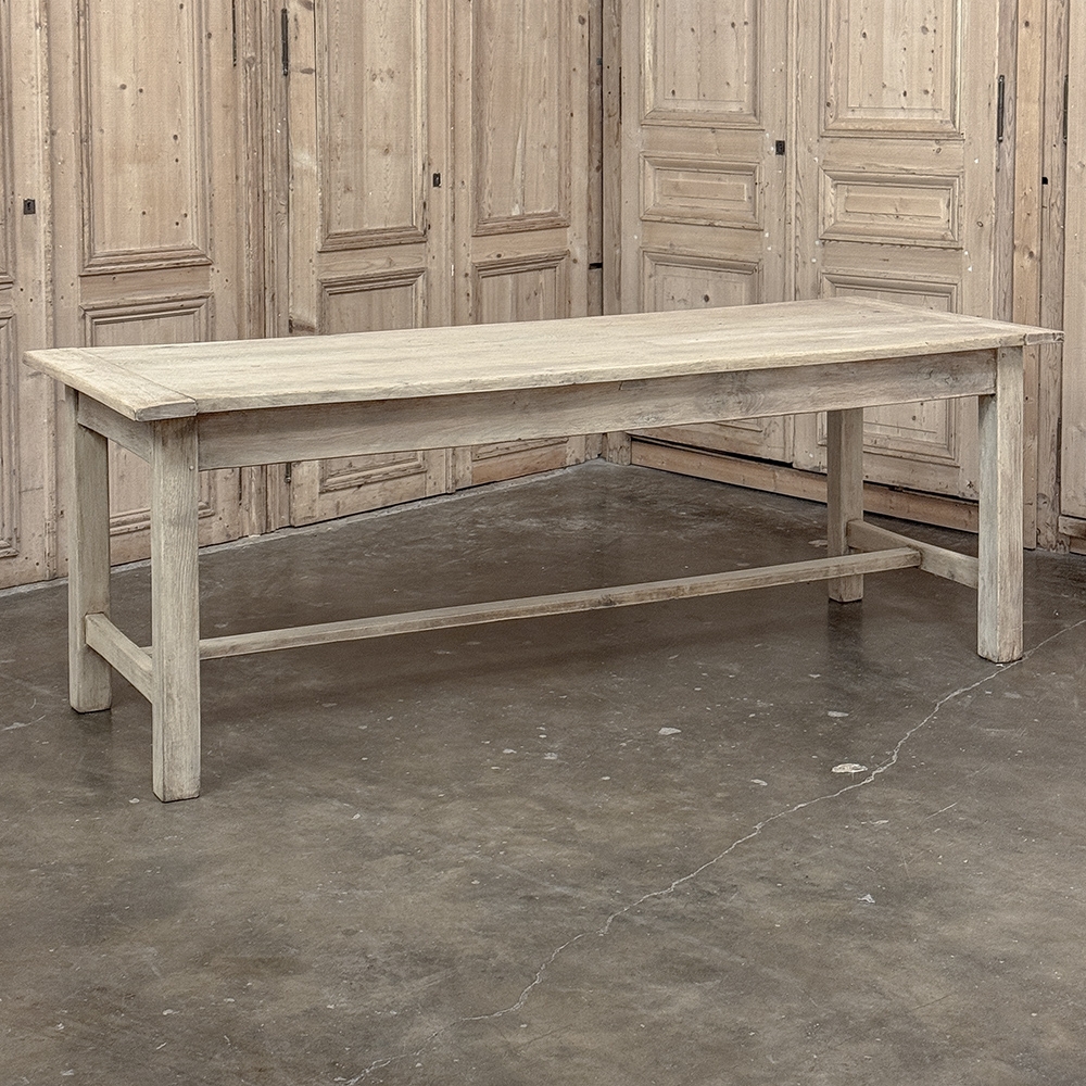 19th Century Rustic Table ~ Desk in Stripped Oak is a truly timeless design inspired by rural craftsmen who performed wonderful feats of furniture crafting using what are today considered primitive tools. Those craftsmen did have lots of beautiful seasoned old-growth oak with which to work, and used techniques handed down from generation to generation to produce works that literally last for generations. The solid plank top resists aging, and is supported by four sturdy posts held together by an "H" stretcher below and an apron above, all joined with mortise & tenons rendered by hand. The "H" stretcher design allows for maximum foot room, and two drawers fitted with turned wood knobs add a nice touch. Painstakingly stripped using our proprietary process that retains the patina and sheer natural beauty of the old wood, all performed by our expert in-house staff.