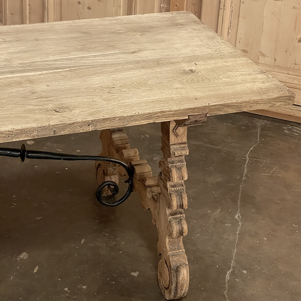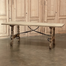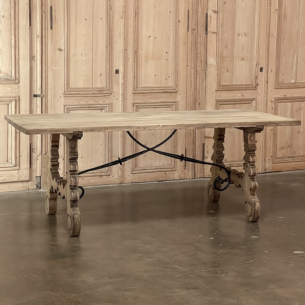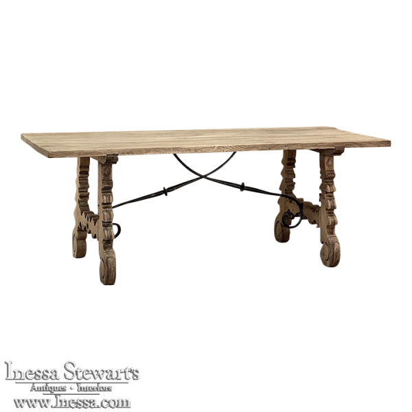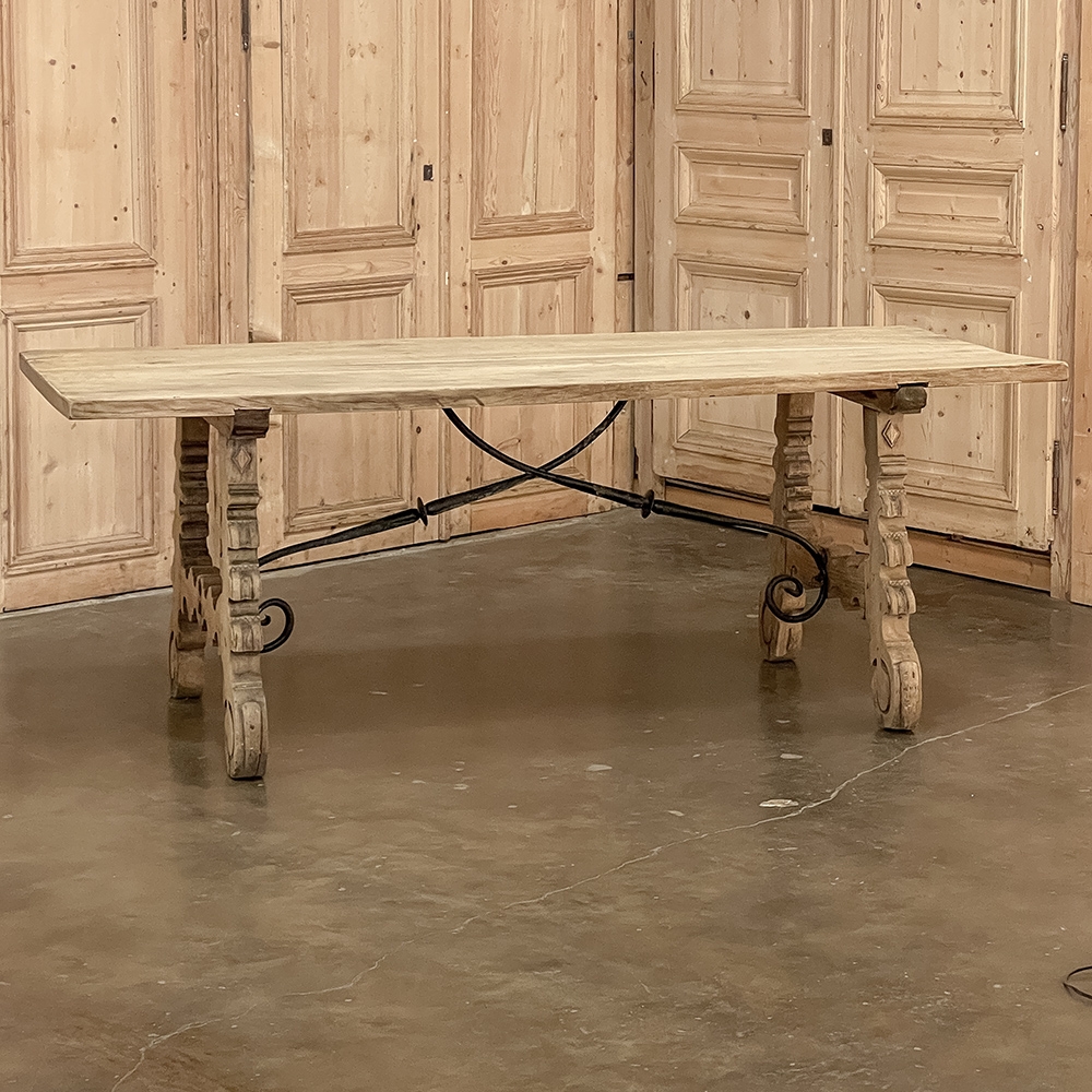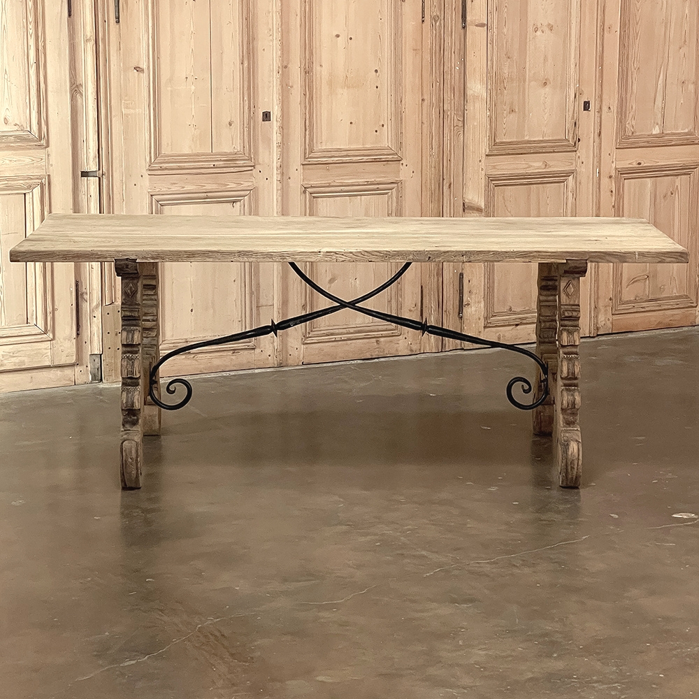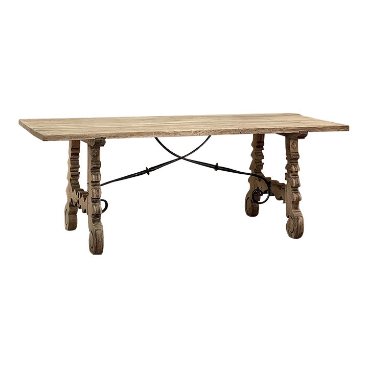 19th Century Spanish Dining Table in Stripped Oak features all the classic elements of the region, using techniques handed down from generation to generation for centuries! Old-growth oak was harvested in thick planks to create the piece, with the solid plank top dovetailed into the leg supports below, each of which was meticulously sawn by hand in an elaborate form reminiscent of a lyre, but with bold splayed scrolled feet for maximum stability. To reinforce the design, hand-forged wrought iron was carefully scrolled and affixed to the legs and underside of the table, providing maximum strength with minimal impact on leg room. The thick plank top also makes an apron unnecessary, providing more knee clearance than other designs. Painstakingly and gently stripped using our proprietary non-petrochemical, non-toxic method that retains the natural beauty and patina of the wood! Ready to serve your family for decades to come!