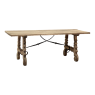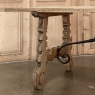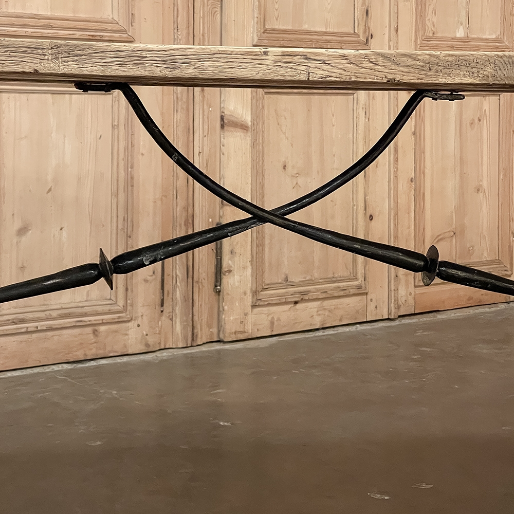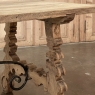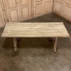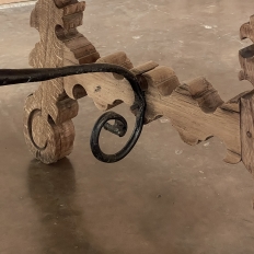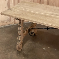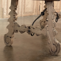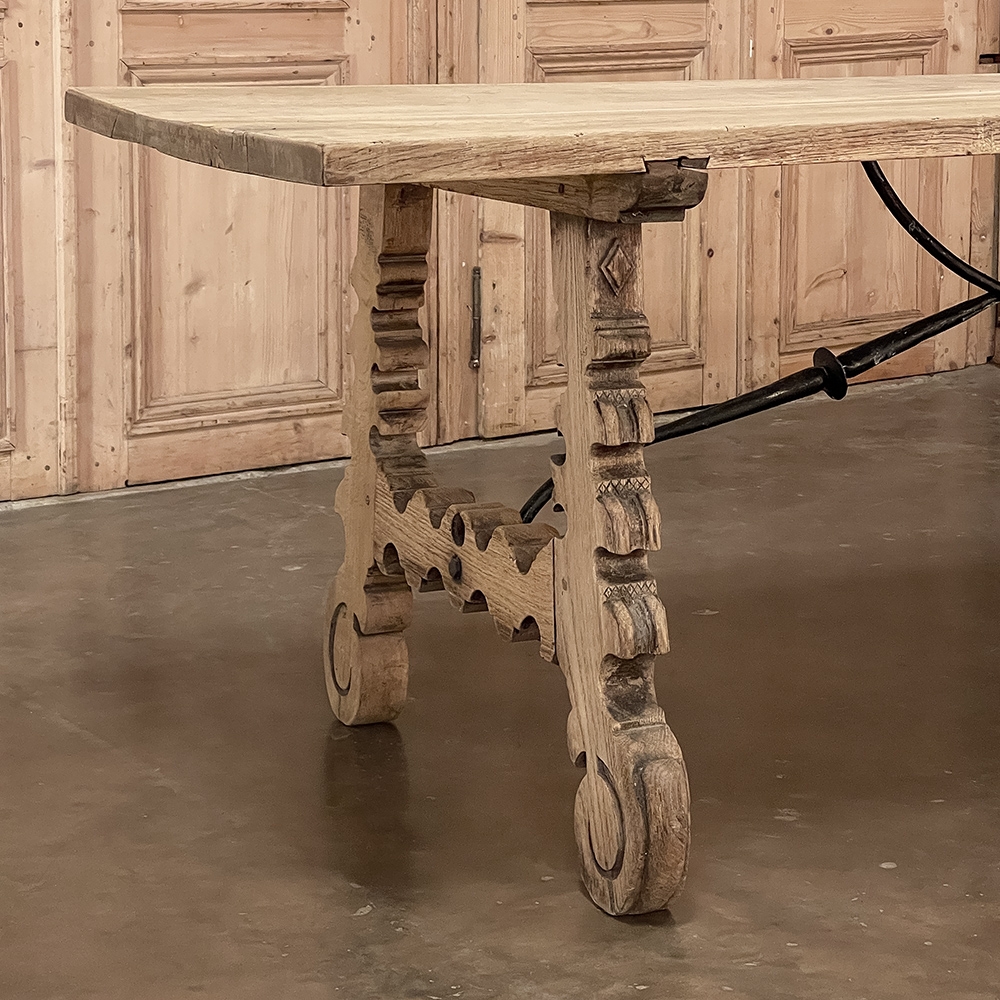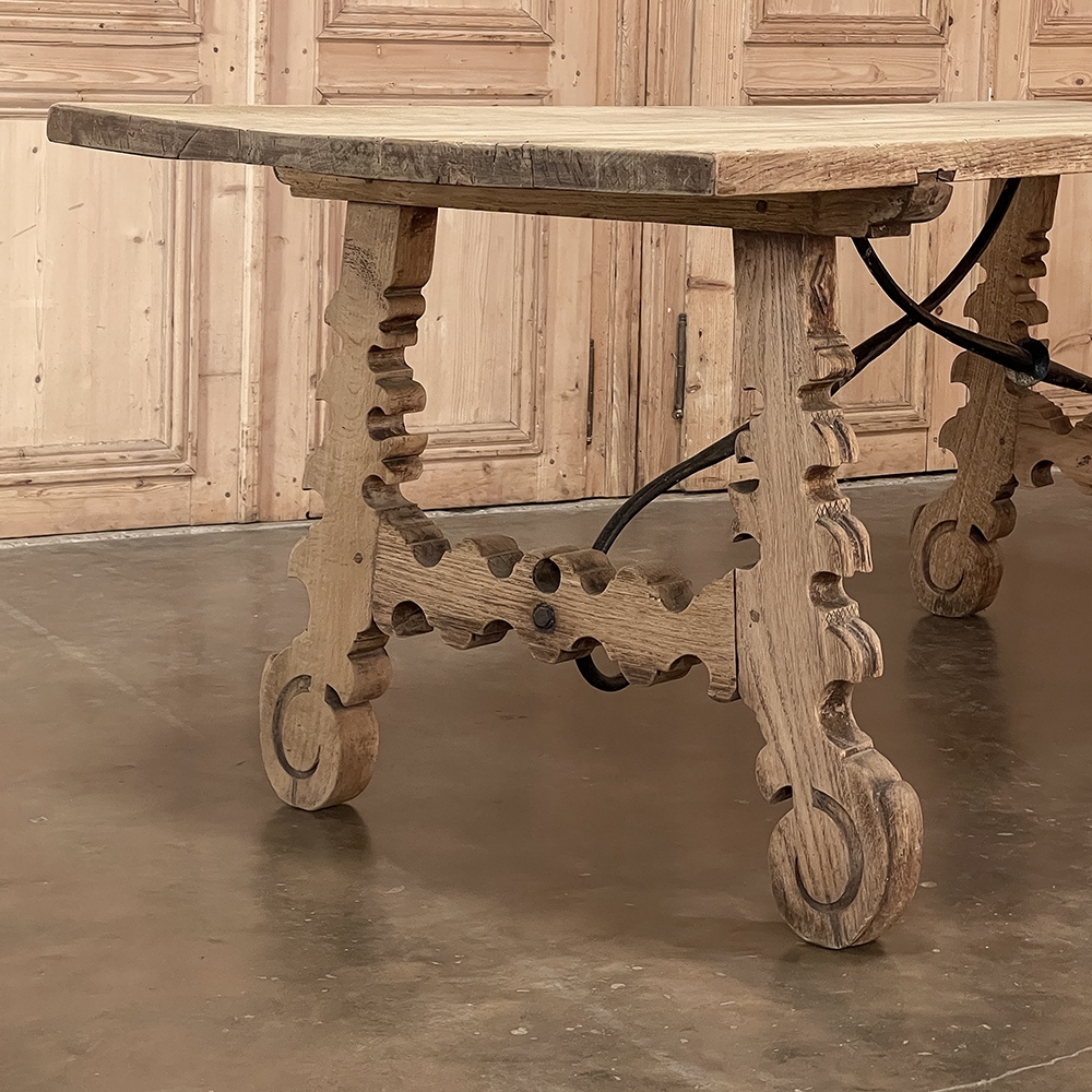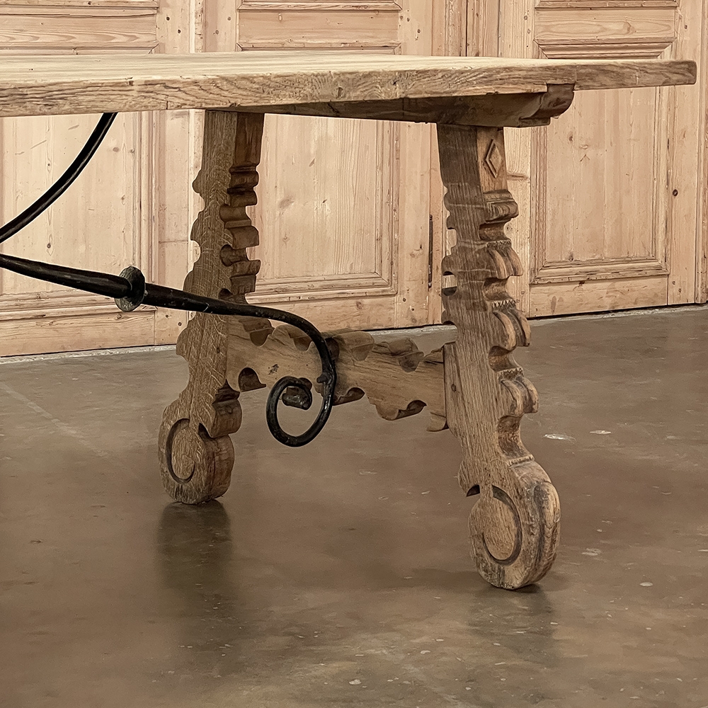 19th Century Spanish Dining Table in Stripped Oak features all the classic elements of the region, using techniques handed down from generation to generation for centuries! Old-growth oak was harvested in thick planks to create the piece, with the solid plank top dovetailed into the leg supports below, each of which was meticulously sawn by hand in an elaborate form reminiscent of a lyre, but with bold splayed scrolled feet for maximum stability. To reinforce the design, hand-forged wrought iron was carefully scrolled and affixed to the legs and underside of the table, providing maximum strength with minimal impact on leg room. The thick plank top also makes an apron unnecessary, providing more knee clearance than other designs. Painstakingly and gently stripped using our proprietary non-petrochemical, non-toxic method that retains the natural beauty and patina of the wood! Ready to serve your family for decades to come!