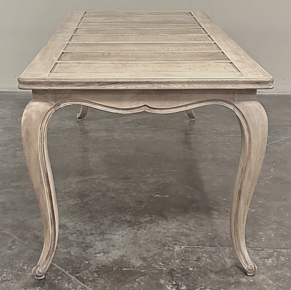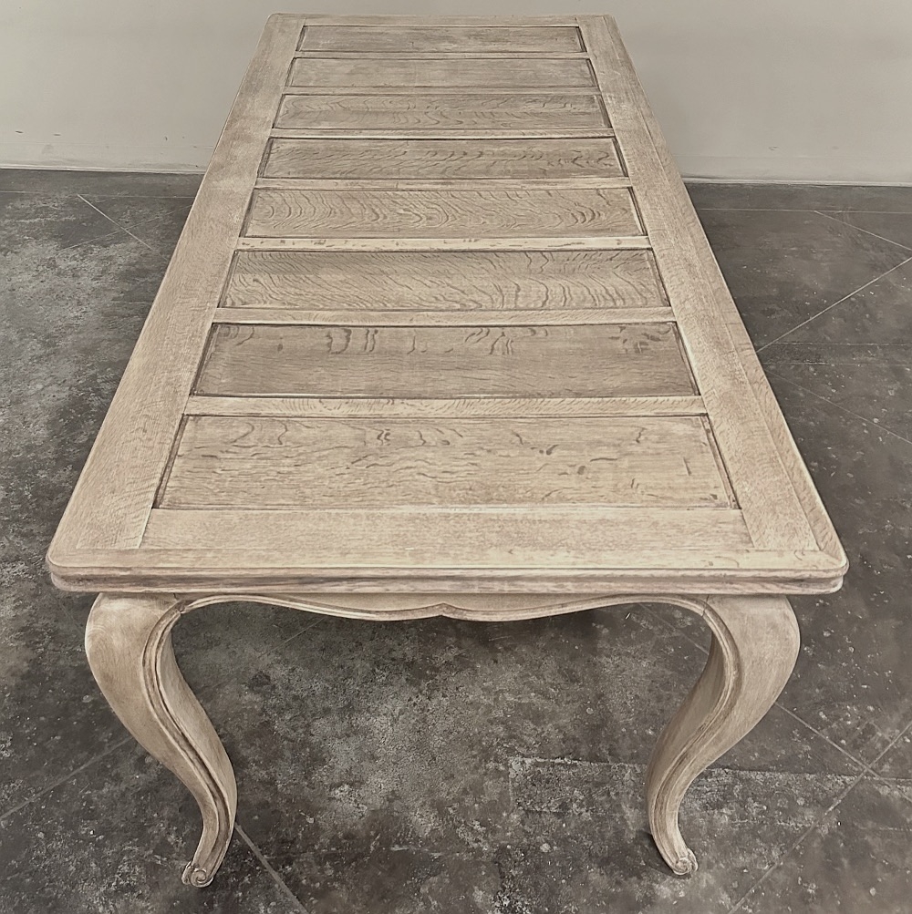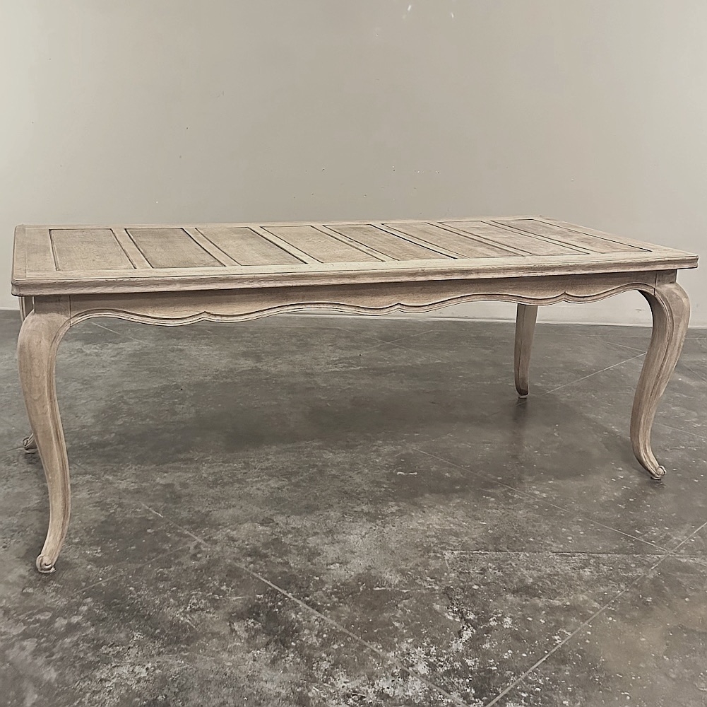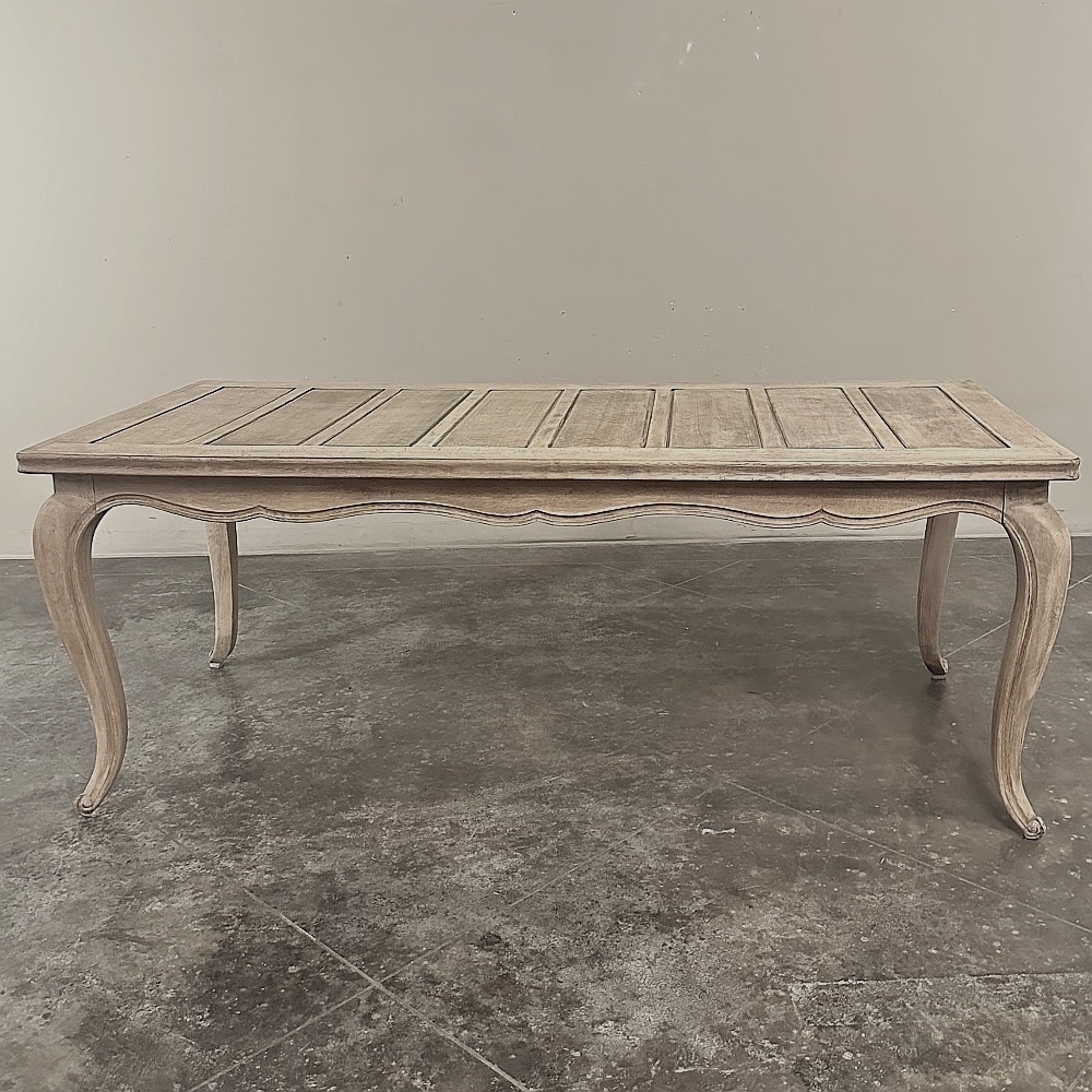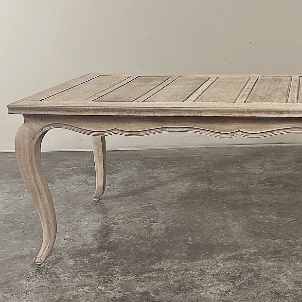 The long rectangular top is detailed with recessed panels, adding subtle architectural structure while maintaining the restrained elegance that defines Country French design. A gently undulating apron with a finely molded edge softens the silhouette, flowing gracefully into slender cabriole legs that terminate in delicate escargot feet. The overall effect is balanced and timeless—refined yet relaxed, perfectly suited to both classic interiors and more modern spaces seeking authentic European character.
