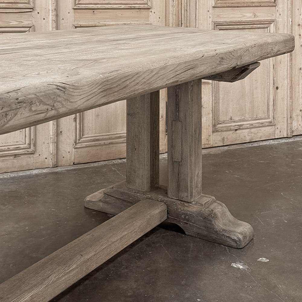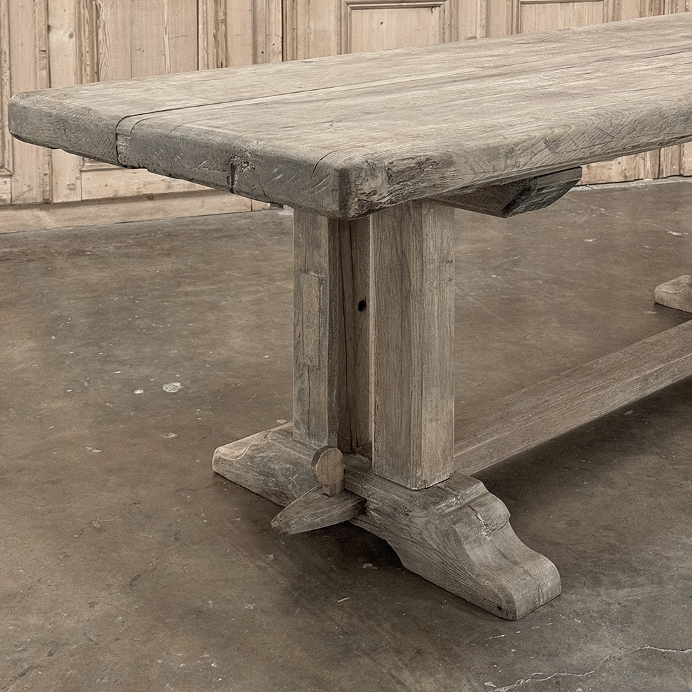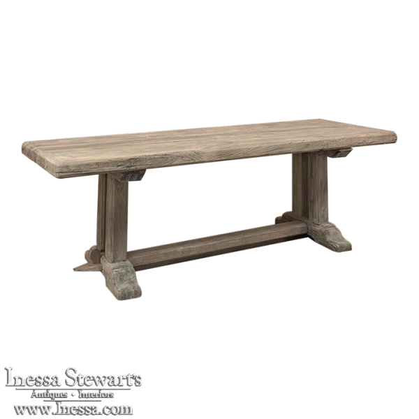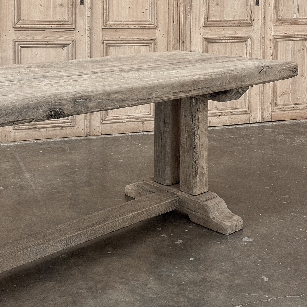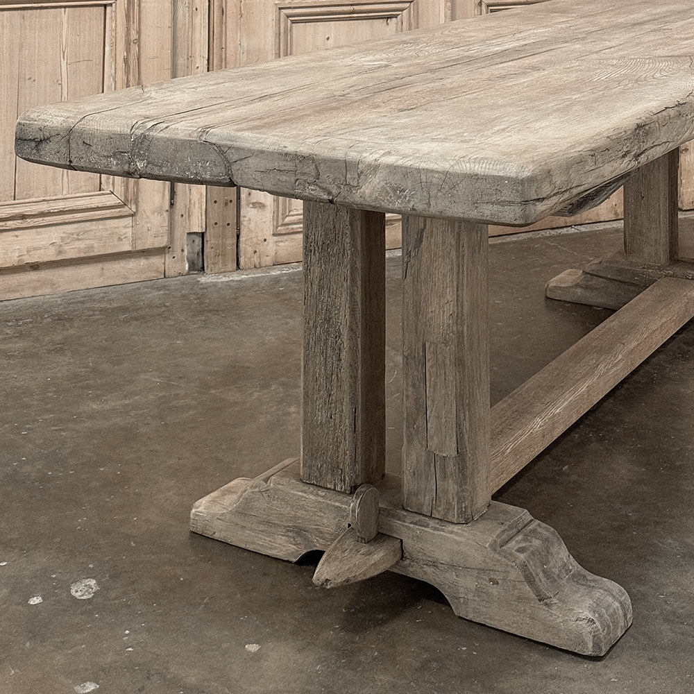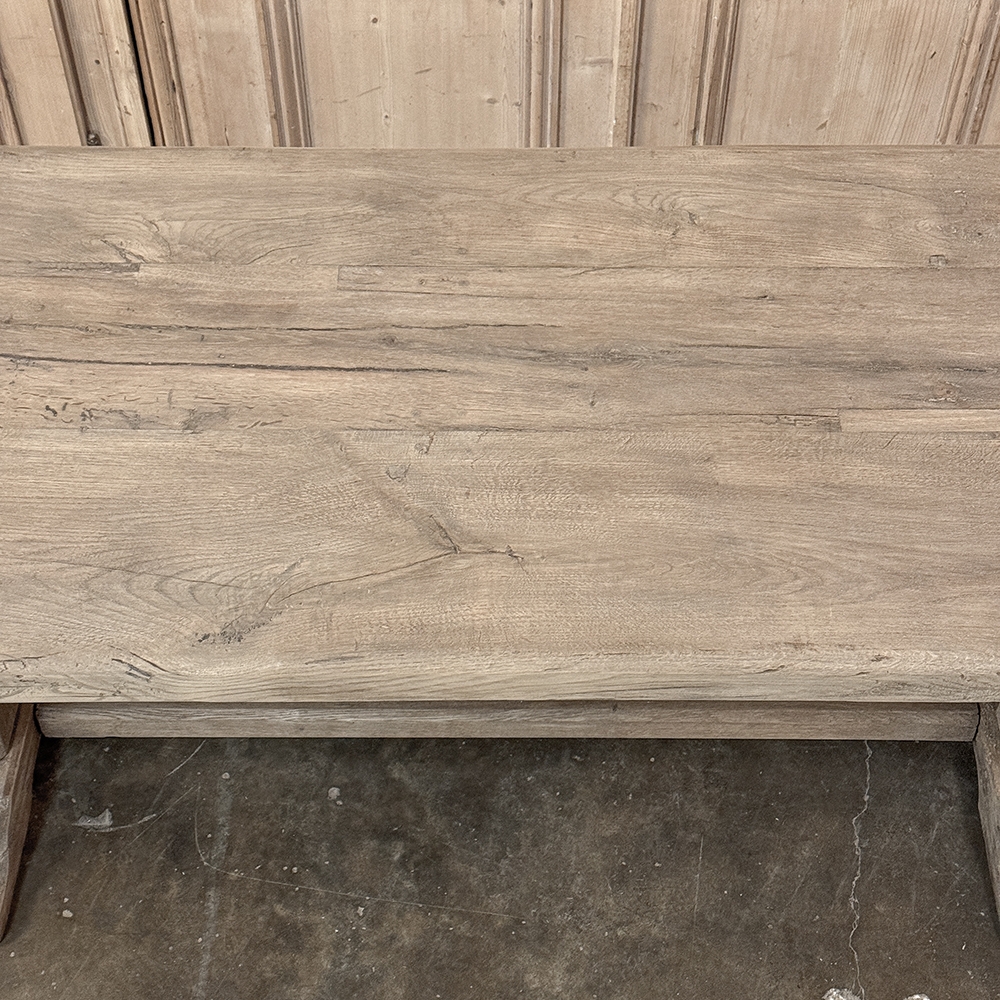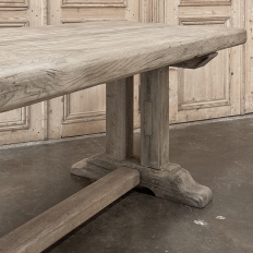 Antique Country French Stripped Oak Trestle Table is the perfect choice for the casual or rustic decor! Hand-crafted from thick planks and timbers of solid oak, it was literally built to last for generations! The 4 inch thick top is so sturdy it doesn't require a reinforcing apron underneath, which increases leg room and knee clearance to a generous 26 inches high. Support is provided by four posts joined to a "T" at the top which is affixed to, but can be removed from, the top for transport. The bottom of the posts are attached to the transverse feet, which are also connected by a stout timber fully mortised through and shimmed in a traditional method that dates back centuries. Painstakingly stripped by our expert in-house staff, this handsome table is poised to be the center of your family memories for decades to come!