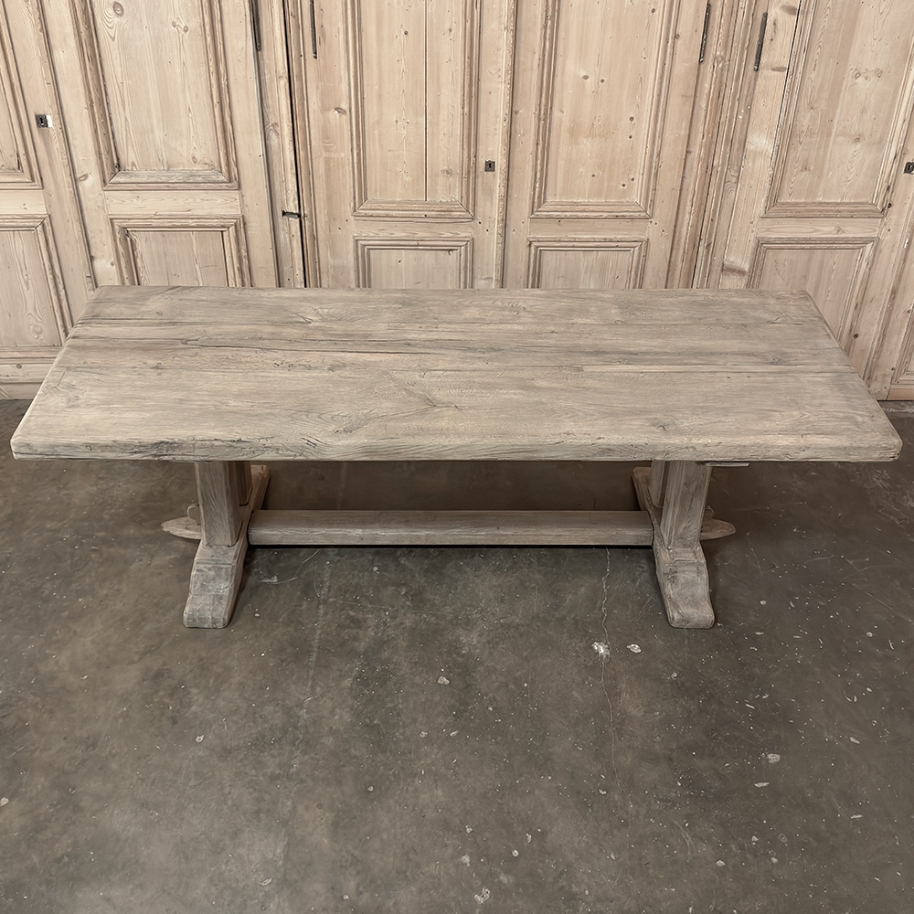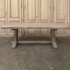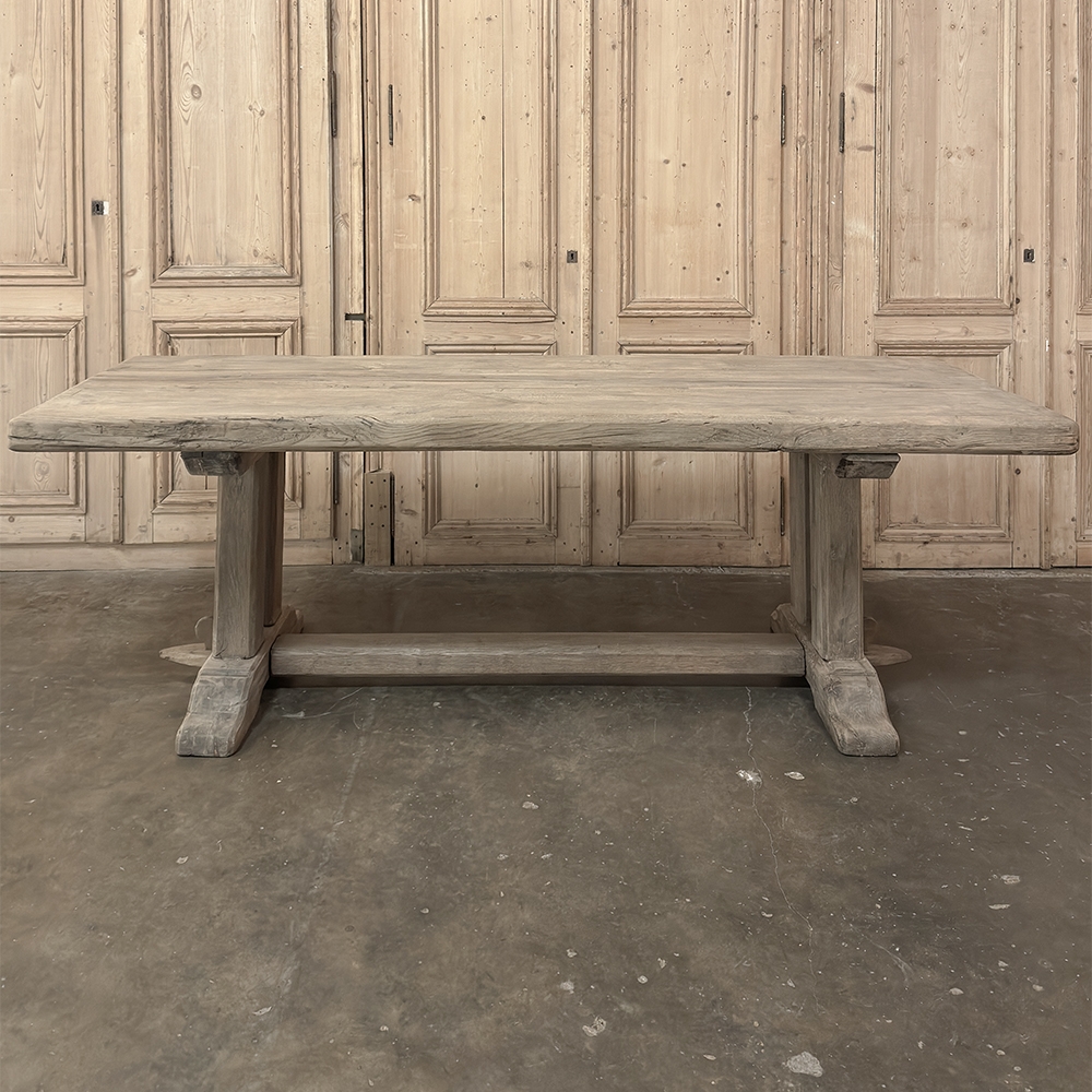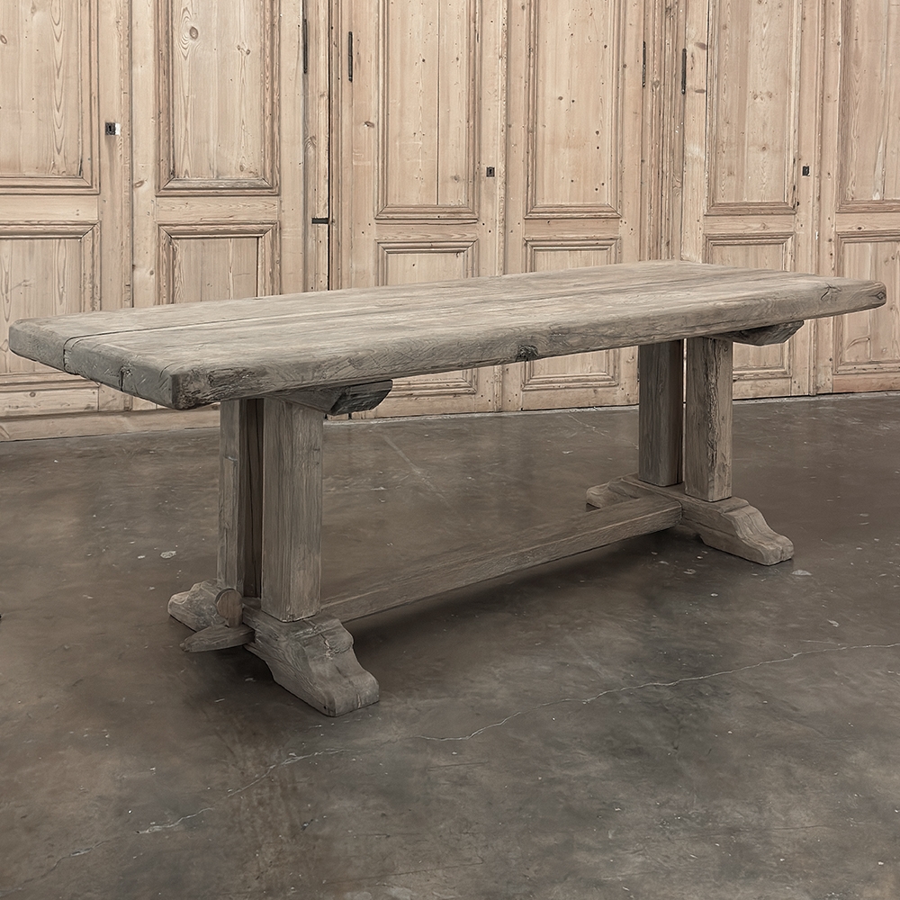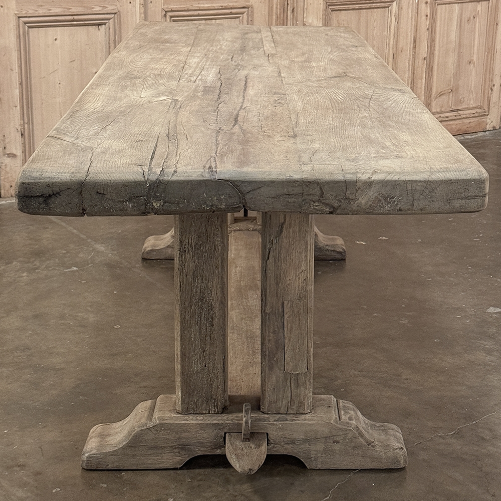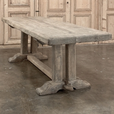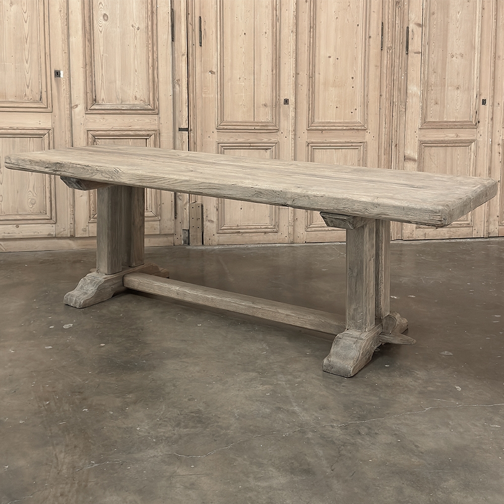 Antique Country French Stripped Oak Trestle Table is the perfect choice for the casual or rustic decor! Hand-crafted from thick planks and timbers of solid oak, it was literally built to last for generations! The 4 inch thick top is so sturdy it doesn't require a reinforcing apron underneath, which increases leg room and knee clearance to a generous 26 inches high. Support is provided by four posts joined to a "T" at the top which is affixed to, but can be removed from, the top for transport. The bottom of the posts are attached to the transverse feet, which are also connected by a stout timber fully mortised through and shimmed in a traditional method that dates back centuries. Painstakingly stripped by our expert in-house staff, this handsome table is poised to be the center of your family memories for decades to come!