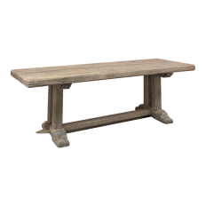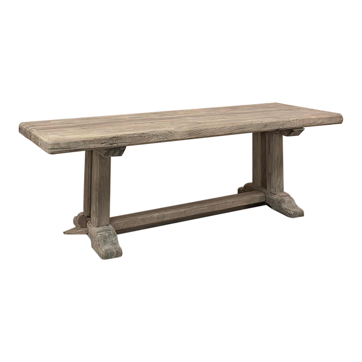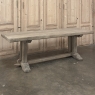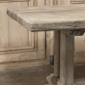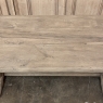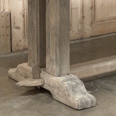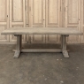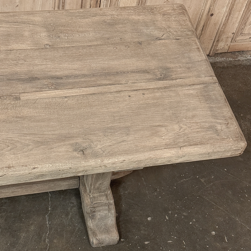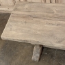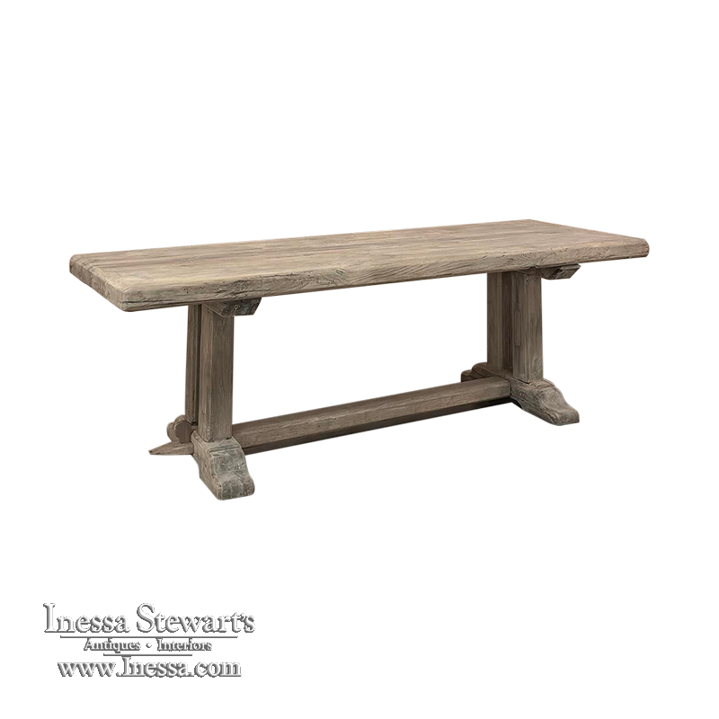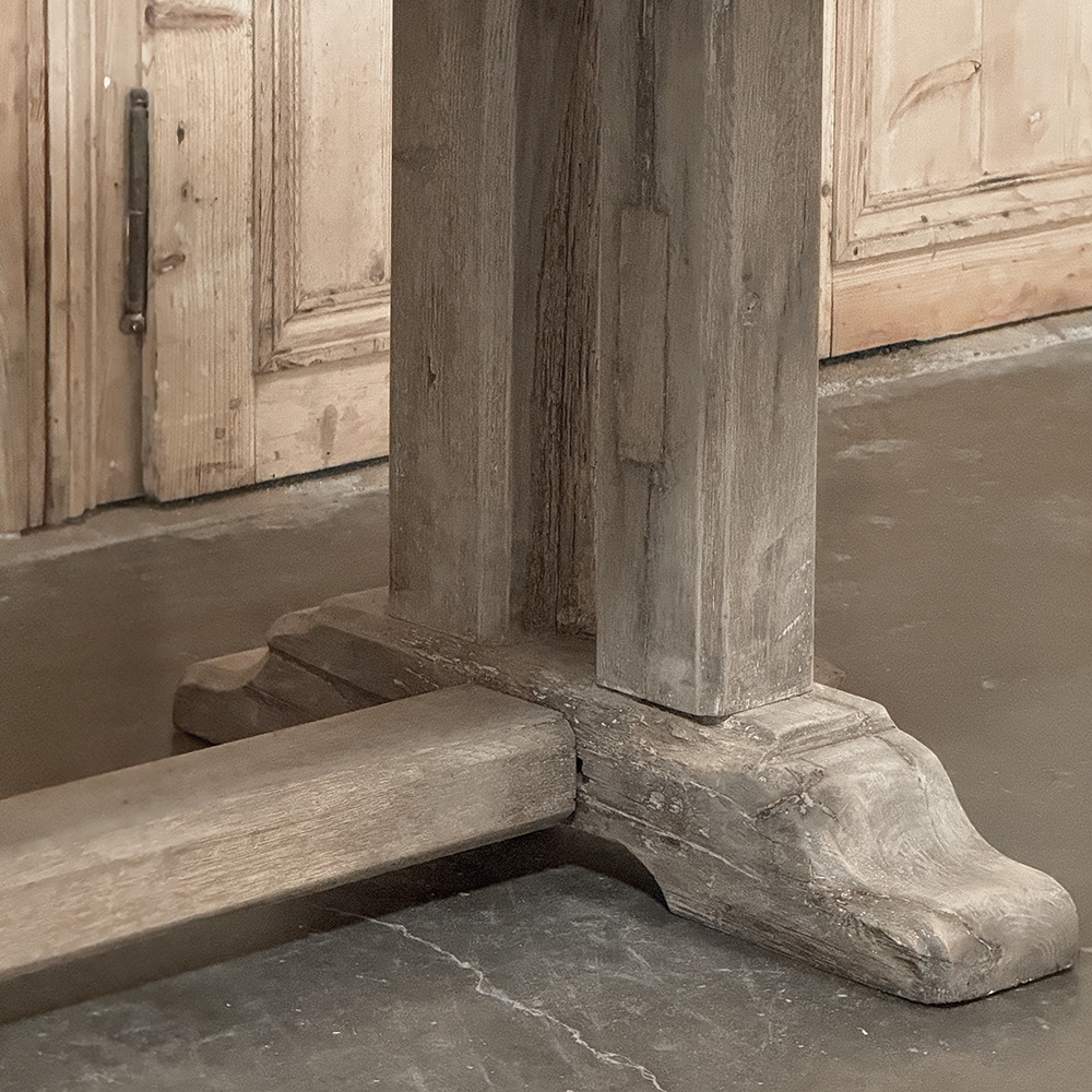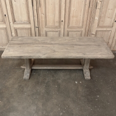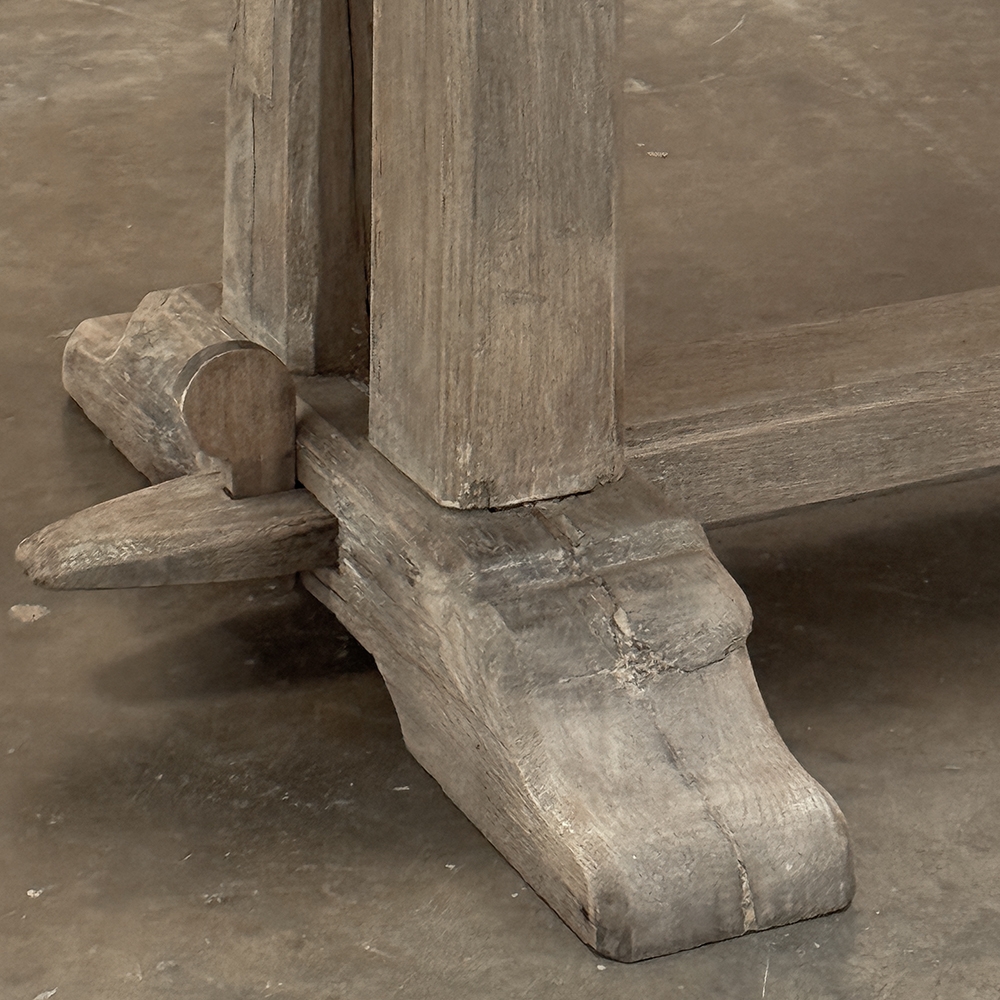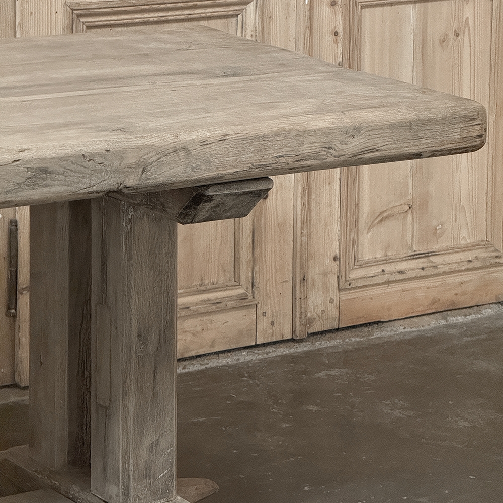 Antique Country French Stripped Oak Trestle Table is the perfect choice for the casual or rustic decor! Hand-crafted from thick planks and timbers of solid oak, it was literally built to last for generations! The 4 inch thick top is so sturdy it doesn't require a reinforcing apron underneath, which increases leg room and knee clearance to a generous 26 inches high. Support is provided by four posts joined to a "T" at the top which is affixed to, but can be removed from, the top for transport. The bottom of the posts are attached to the transverse feet, which are also connected by a stout timber fully mortised through and shimmed in a traditional method that dates back centuries. Painstakingly stripped by our expert in-house staff, this handsome table is poised to be the center of your family memories for decades to come!
