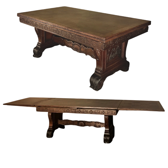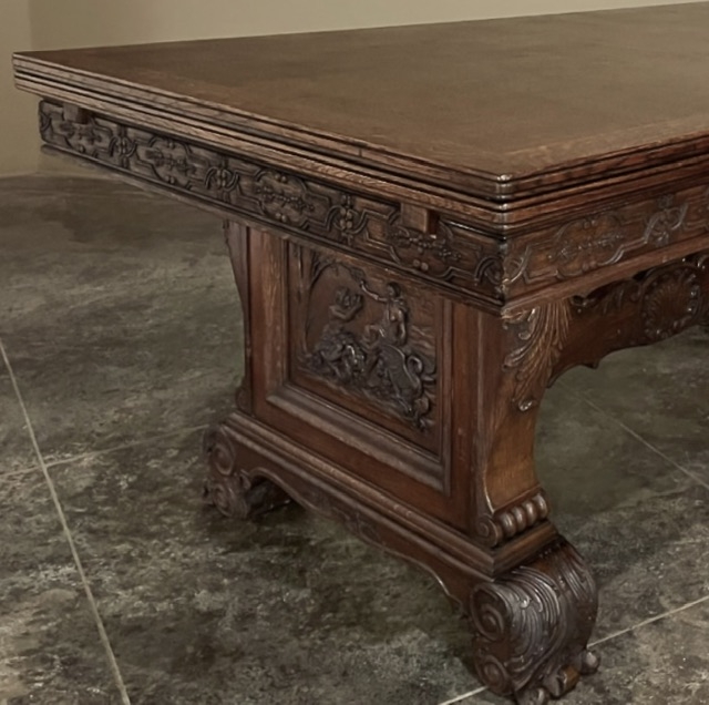 Antique French Louis XIV Draw Leaf Banquet Table combines timeless styling with incredible versatility to create the perfect dining table! When closed, it is just under six feet in length, but with both leaves drawn out it extends to over eleven feet in length to accommodate lots of guests, then just as quickly tuck back in to reclaim precious floor space. The main top features a large format checkerboard pattern created with grain orientation. The apron is fully carved all around with an interesting combination of geometric trim and stylized florals and foliates. A fully carved trestle connects the legs below, carved with the ageless Baroque motifs of shell and acanthus plumes. The leg supports on both ends, however, truly steal the show! Fully molded even on the insides, the outsides feature stunning mythological scenes with figures and animals set in a boldly molded framework, which is in turn flanked by boldly scrolled corbels cared with acanthus plumes in full relief. The bases under the legs are works of art unto themselves, with elegantly scrolled form, detailing, and acanthus plumes again in bold relief.
