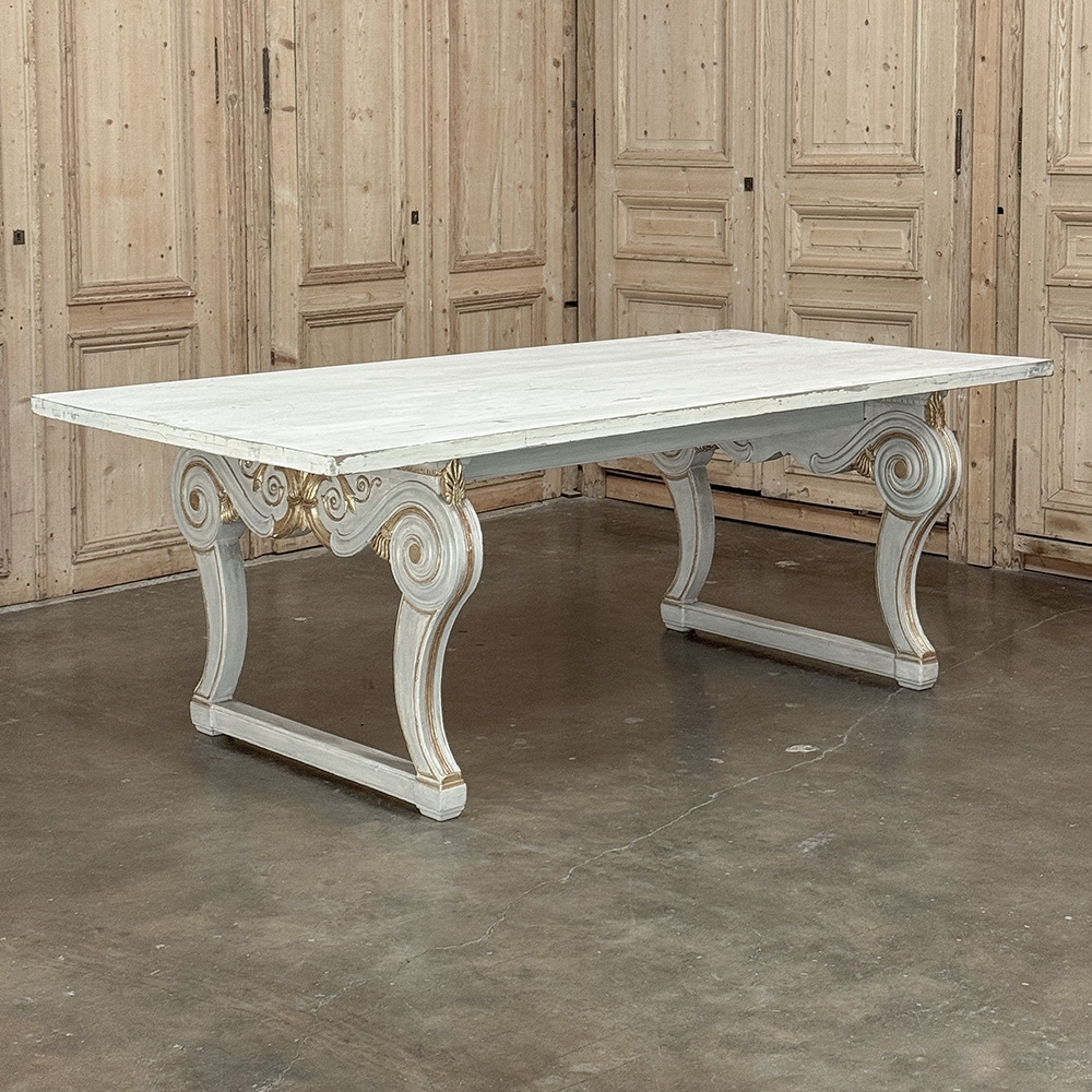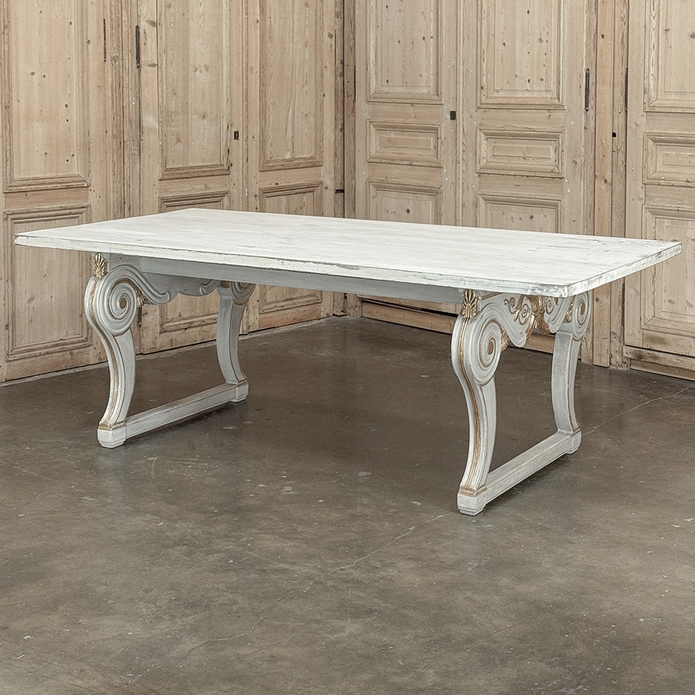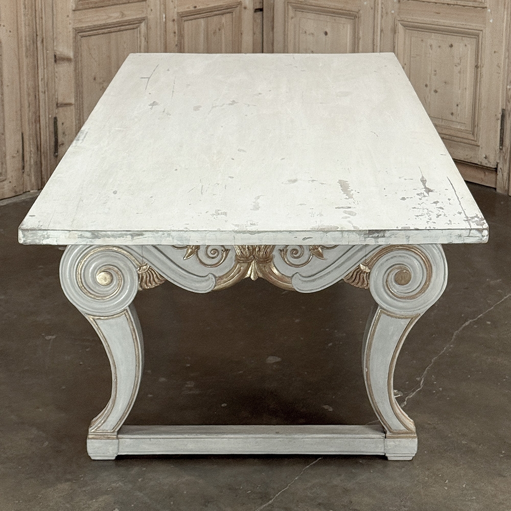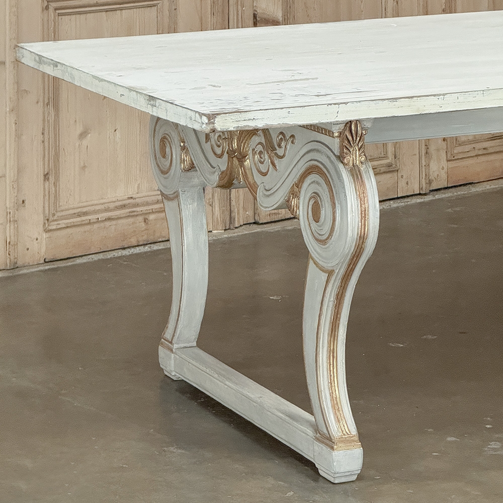 Antique French Louis XIV Painted Dining Table combines both elegance and casual flair into one versatile piece. The solid plank top is very straightforward and quite substantial, and is supported by a recessed, shallow apron that provides maximum knee space underneath. The apron is trimmed in gold molding for a nice touch, but the leg supports provide the most visual impact with their grandiose scrolled design centered with an elaborate foliate design that appears on each end. The leg structures are recessed from the ends of the table to afford better legroom for those seated at the head and foot of the table. The foliate centerpiece leads the eye out to the massive scrolls that are then connected to the curvaceous legs which are mounted to a crosspiece that features tailored beveling and structural stability. The entire table sports a patinaed, slightly distressed painted finish that is charming, enhanced by the gold painted raised carving details and bordering.
