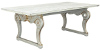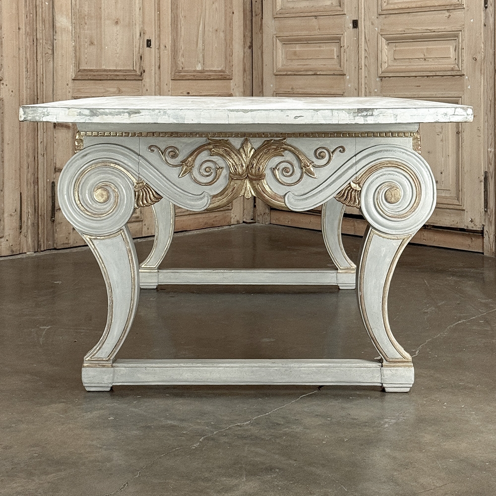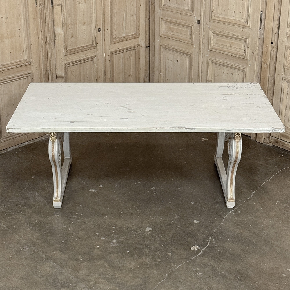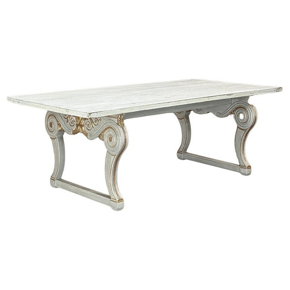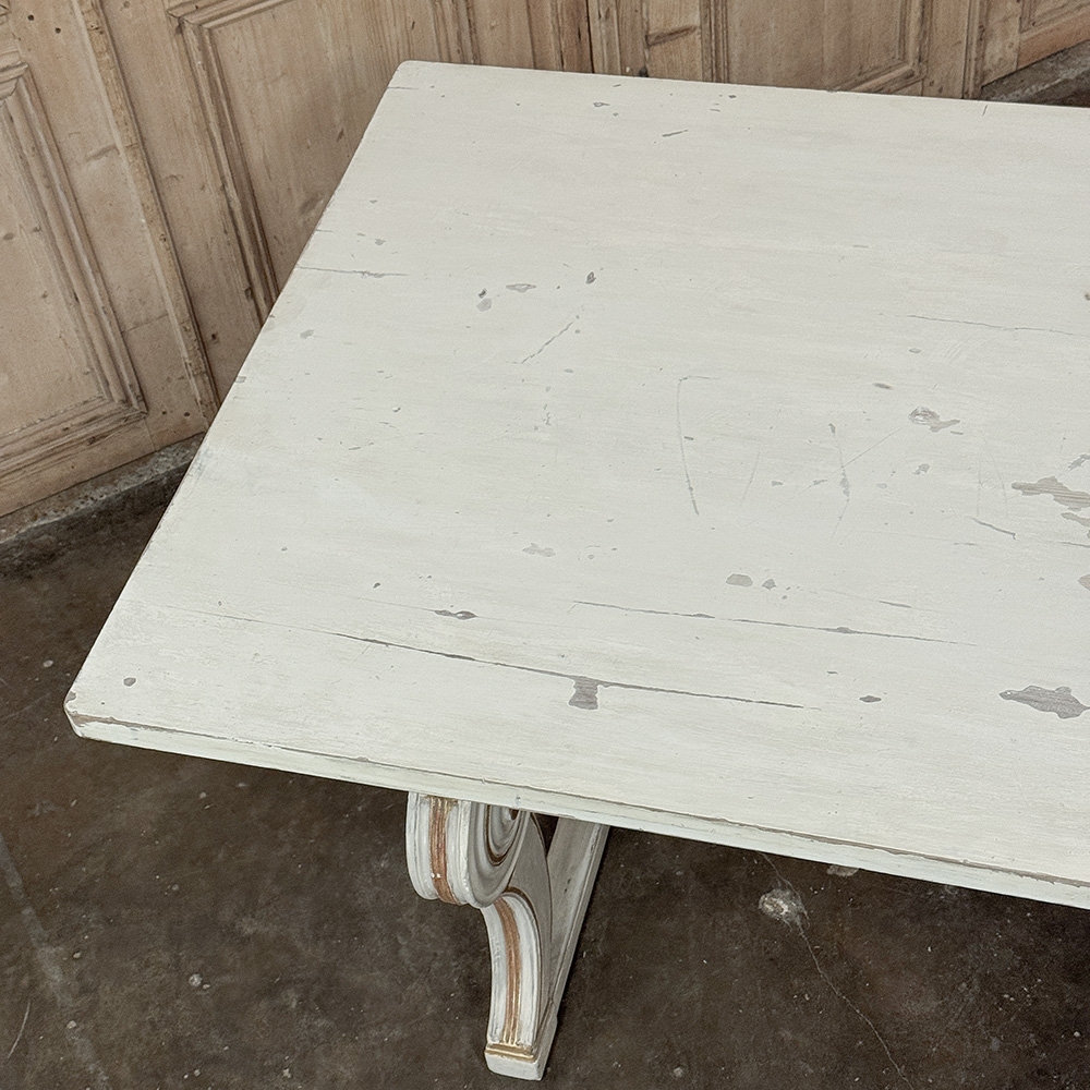 Antique French Louis XIV Painted Dining Table combines both elegance and casual flair into one versatile piece. The solid plank top is very straightforward and quite substantial, and is supported by a recessed, shallow apron that provides maximum knee space underneath. The apron is trimmed in gold molding for a nice touch, but the leg supports provide the most visual impact with their grandiose scrolled design centered with an elaborate foliate design that appears on each end. The leg structures are recessed from the ends of the table to afford better legroom for those seated at the head and foot of the table. The foliate centerpiece leads the eye out to the massive scrolls that are then connected to the curvaceous legs which are mounted to a crosspiece that features tailored beveling and structural stability. The entire table sports a patinaed, slightly distressed painted finish that is charming, enhanced by the gold painted raised carving details and bordering.