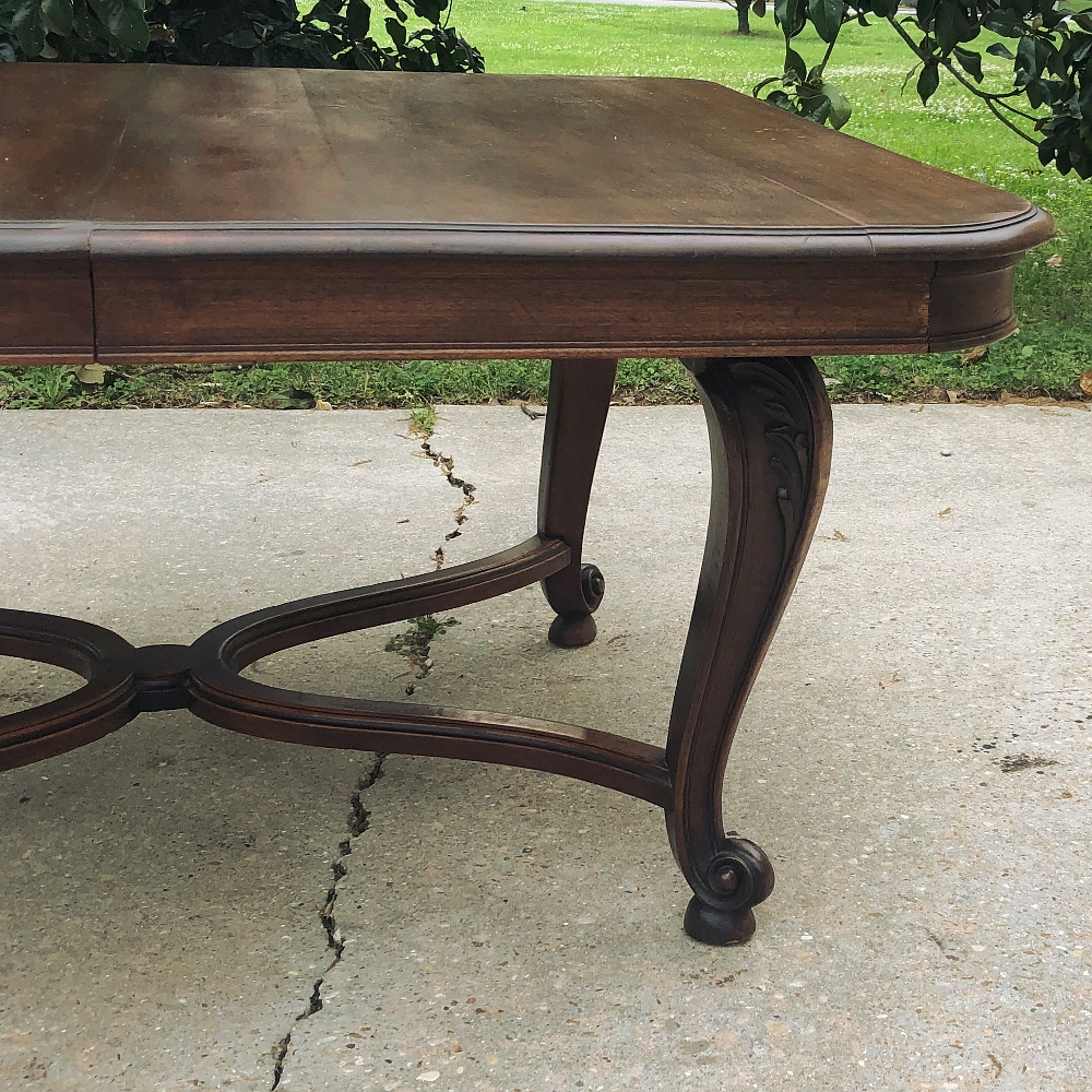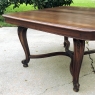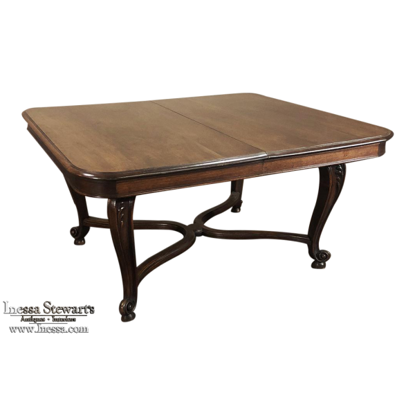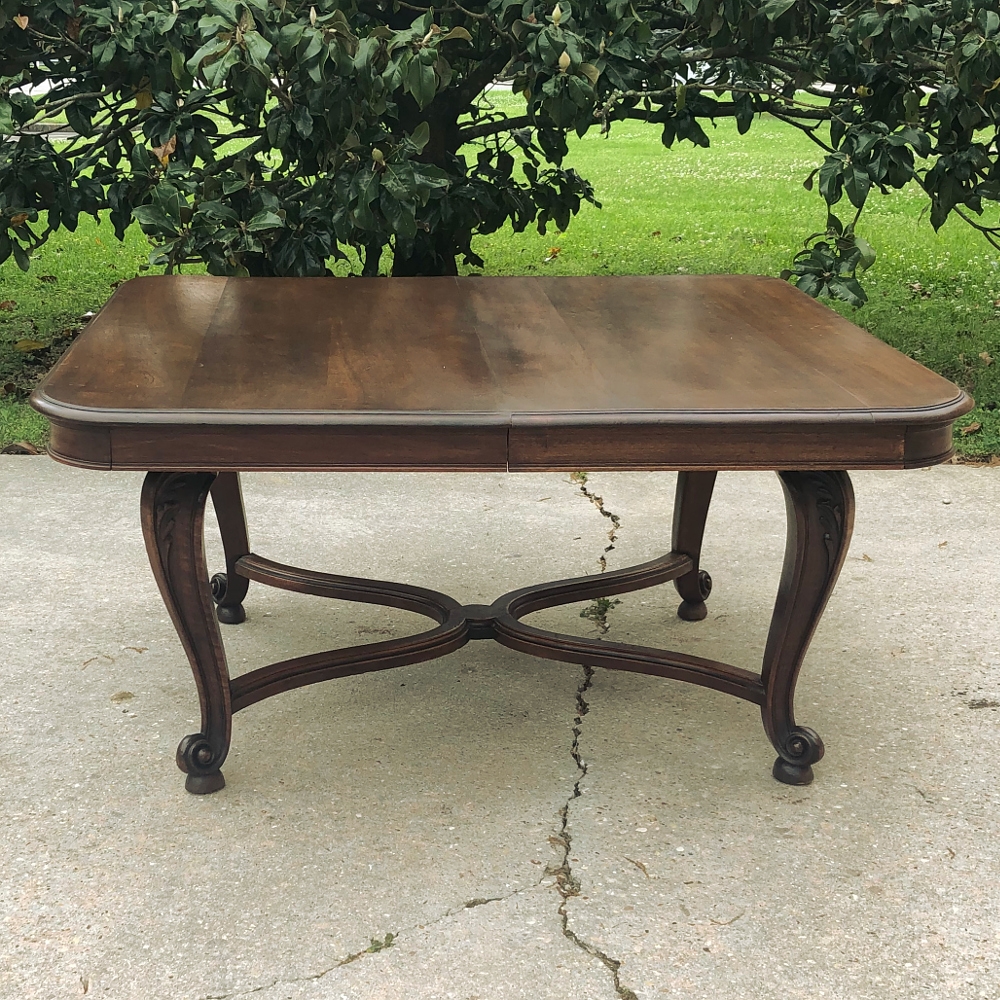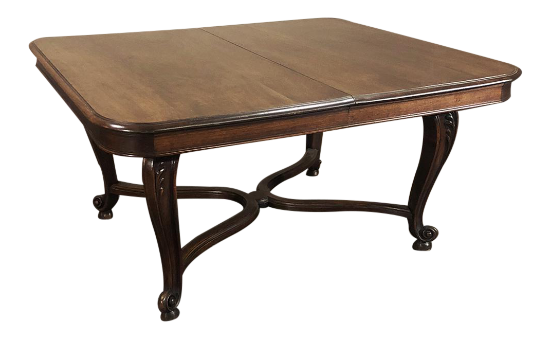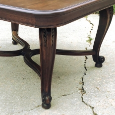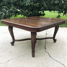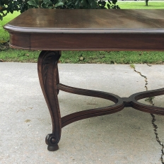 Antique French Louis XV Walnut Table features a tailored top supported by four boldly scrolled cabriole legs, each adorned with acanthus carvings on the shoulders, and escargot feet. The legs are connected with double lyre stretchers below for graceful support.