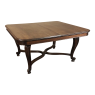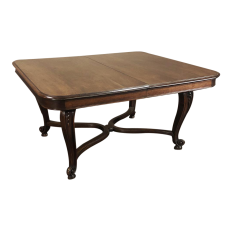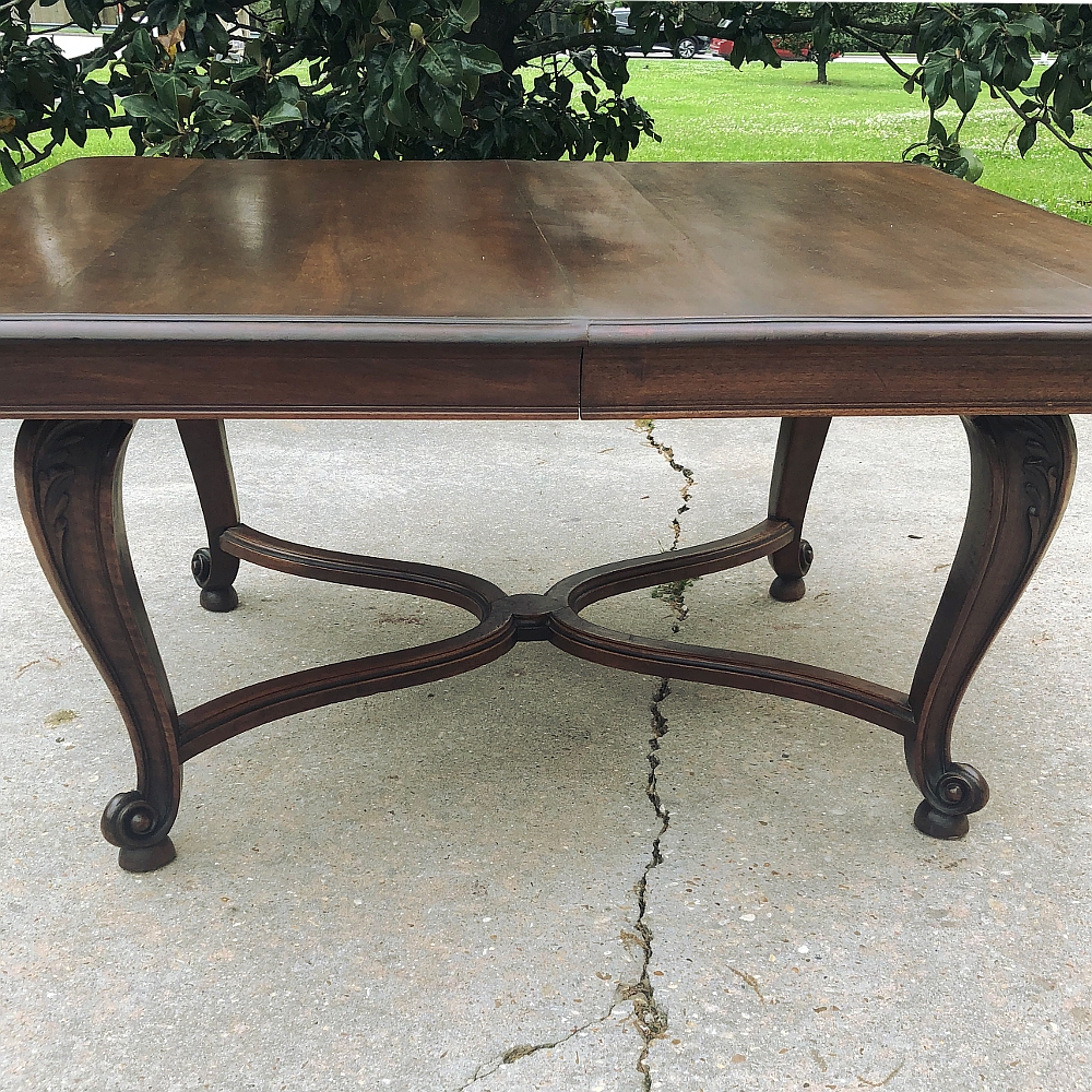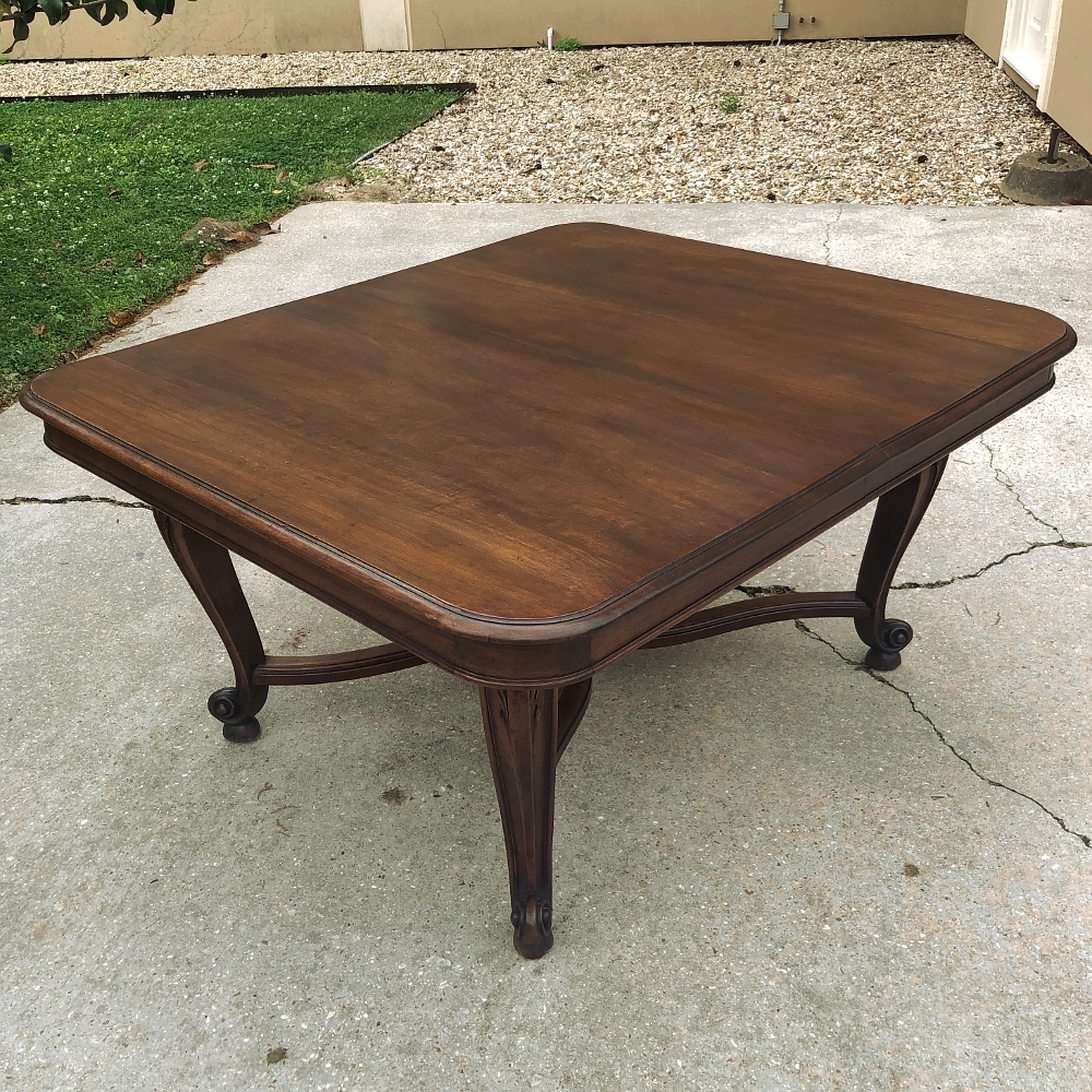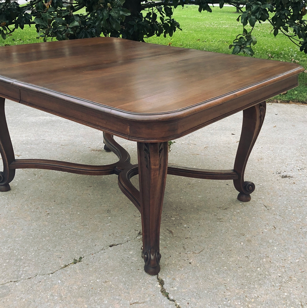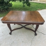 Antique French Louis XV Walnut Table features a tailored top supported by four boldly scrolled cabriole legs, each adorned with acanthus carvings on the shoulders, and escargot feet. The legs are connected with double lyre stretchers below for graceful support.