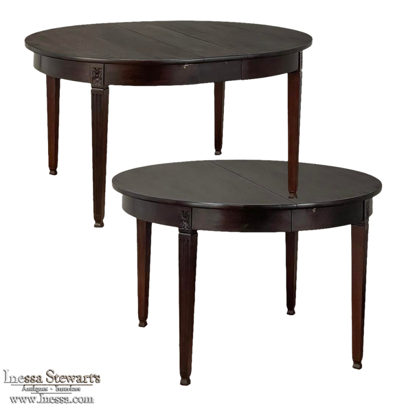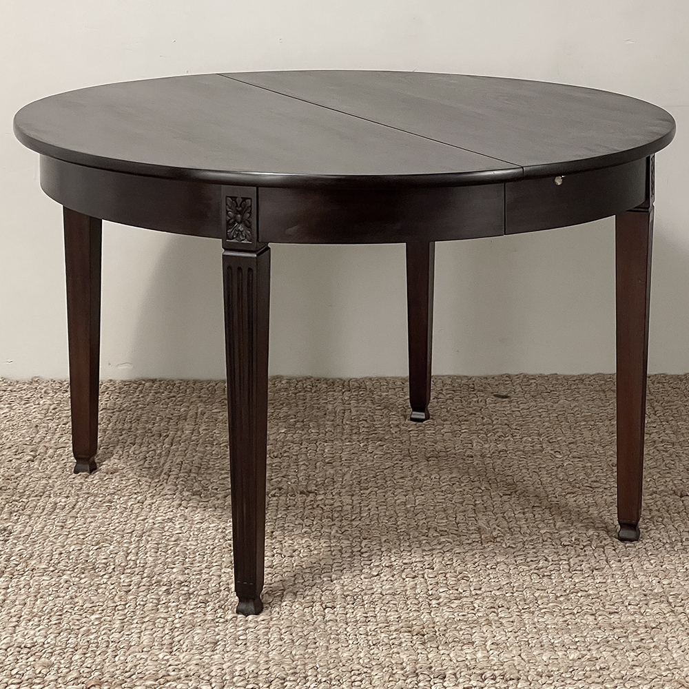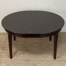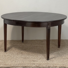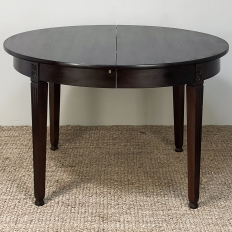 Antique French Louis XVI Mahogany Breakfast ~ Dining Table represents the essence of the tailored look, creating a table just the right size for cozy dining rooms or breakfast nooks. Crafted from fine imported mahogany, it features a solid plank top supported by a curved, unadorned apron fitted with four tapered and faceted legs, each with a rosette carved at the juncture of the apron. Included with the table is an original leaf also fitted with a matching apron, that sets in place with "biscuits" and is affixed with brass latches. This provides a little extra room for larger chairs or larger breakfasts! Literally designed to last for generations, the wood used is famous for its resistance to aging and ability to retain its natural beauty for decade after decade.